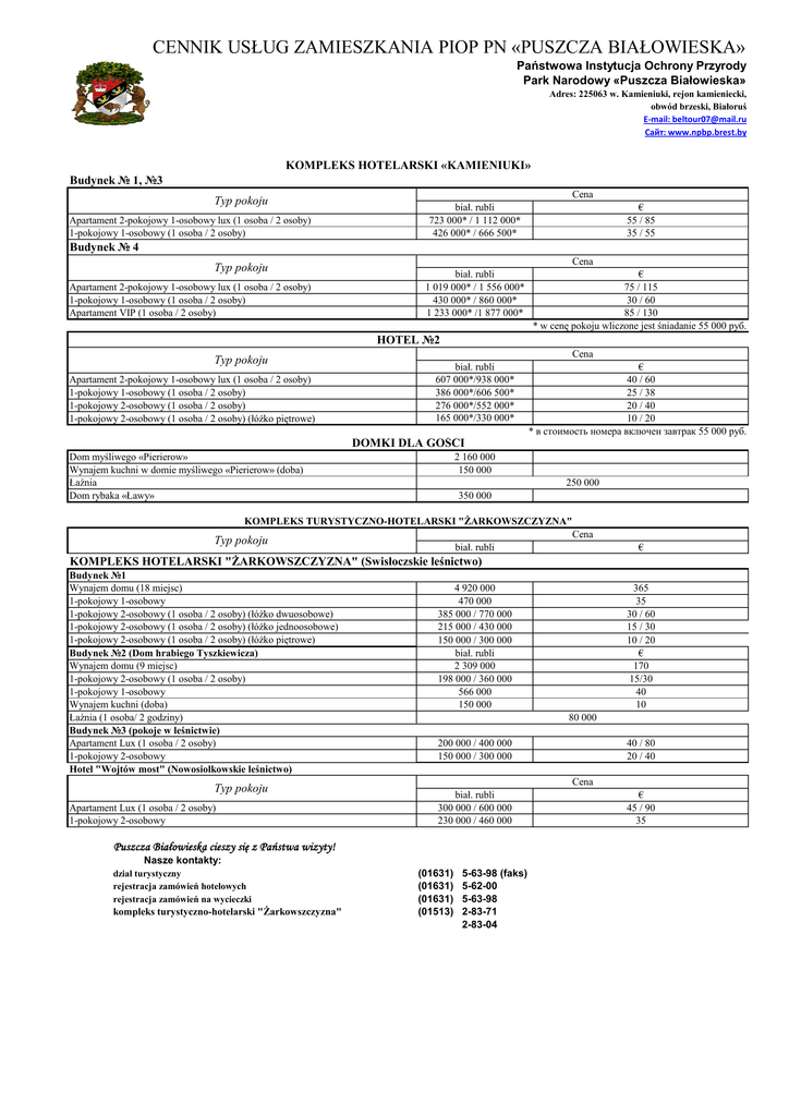 CENNIK USŁUG ZAMIESZKANIA PIOP PN «PUSZCZA BIAŁOWIESKA» Państwowa Instytucja Ochrony Przyrody Park Narodowy «Puszcza Białowieska» Adres: 225063 w. Kamieniuki, rejon kamieniecki, obwód brzeski, Białoruś E-mail: [email protected] Сайт: www.npbp.brest.by KOMPLEKS HOTELARSKI «KAMIENIUKI» Budynek № 1, №3 Typ pokoju Apartament 2-pokojowy 1-osobowy lux (1 osoba / 2 osoby) 1-pokojowy 1-osobowy (1 osoba / 2 osoby) Cena biał. rubli 723 000* / 1 112 000* 426 000* / 666 500* € 55 / 85 35 / 55 Budynek № 4 Typ pokoju Apartament 2-pokojowy 1-osobowy lux (1 osoba / 2 osoby) 1-pokojowy 1-osobowy (1 osoba / 2 osoby) Apartament VIP (1 osoba / 2 osoby) Cena biał. rubli 1 019 000* / 1 556 000* 430 000* / 860 000* 1 233 000* /1 877 000* € 75 / 115 30 / 60 85 / 130 * w cenę pokoju wliczone jest śniadanie 55 000 руб. HOTEL №2 Typ pokoju Apartament 2-pokojowy 1-osobowy lux (1 osoba / 2 osoby) 1-pokojowy 1-osobowy (1 osoba / 2 osoby) 1-pokojowy 2-osobowy (1 osoba / 2 osoby) 1-pokojowy 2-osobowy (1 osoba / 2 osoby) (łóżko piętrowe) Cena biał. rubli 607 000*/938 000* 386 000*/606 500* 276 000*/552 000* 165 000*/330 000* € 40 / 60 25 / 38 20 / 40 10 / 20 * в стоимость номера включен завтрак 55 000 руб. DOMKI DLA GOŚCI Dom myśliwego «Pierierow» Wynajem kuchni w domie myśliwego «Pierierow» (doba) Łaźnia Dom rybaka «Ławy» 2 160 000 150 000 250 000 350 000 KOMPLEKS TURYSTYCZNO-HOTELARSKI "ŻARKOWSZCZYZNA" Cena Typ pokoju biał. rubli € KOMPLEKS HOTELARSKI "ŻARKOWSZCZYZNA" (Swisłoczskie leśnictwo) Budynek №1 Wynajem domu (18 miejsc) 1-pokojowy 1-osobowy 1-pokojowy 2-osobowy (1 osoba / 2 osoby) (łóżko dwuosobowe) 1-pokojowy 2-osobowy (1 osoba / 2 osoby) (łóżko jednoosobowe) 1-pokojowy 2-osobowy (1 osoba / 2 osoby) (łóżko piętrowe) Budynek №2 (Dom hrabiego Tyszkiewicza) Wynajem domu (9 miejsc) 1-pokojowy 2-osobowy (1 osoba / 2 osoby) 1-pokojowy 1-osobowy Wynajem kuchni (doba) Łaźnia (1 osoba/ 2 godziny) Budynek №3 (pokoje w leśnictwie) Apartament Lux (1 osoba / 2 osoby) 1-pokojowy 2-osobowy Hotel "Wojtów most" (Nowosiolkowskie leśnictwo) Typ pokoju Apartament Lux (1 osoba / 2 osoby) 1-pokojowy 2-osobowy 4 920 000 470 000 385 000 / 770 000 215 000 / 430 000 150 000 / 300 000 biał. rubli 2 309 000 198 000 / 360 000 566 000 150 000 80 000 200 000 / 400 000 150 000 / 300 000 biał. rubli 300 000 / 600 000 230 000 / 460 000 Nasze kontakty: kompleks turystyczno-hotelarski "Żarkowszczyzna" 40 / 80 20 / 40 Cena Puszcza Białowieska cieszy się z Państwa wizyty! dział turystyczny rejestracja zamówień hotelowych rejestracja zamówień na wycieczki 365 35 30 / 60 15 / 30 10 / 20 € 170 15/30 40 10 (01631) (01631) (01631) (01513) 5-63-98 (faks) 5-62-00 5-63-98 2-83-71 2-83-04 € 45 / 90 35