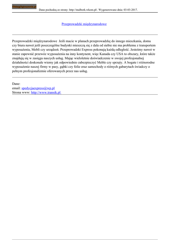 Dane pochodzą ze strony: http://malbork.wkom.pl/. Wygenerowano dnia: 03-03-2017. Przeprowadzki międzynarodowe Przeprowadzki międzynarodowe Jeśli macie w planach przeprowadzkę do innego mieszkania, domu czy biura nawet jeśli poszczególne budynki mieszczą się z dala od siebie nie ma problemu z transportem wyposażenia, Mebli czy urządzeń. Przeprowadzki Express pokonają każdą odległość. Jesteśmy nawet w stanie zapewnić przewóz wyposażenia na inny kontynent, więc Kanada czy USA to obszary, które także znajdują się w zasięgu naszych usług. Mając wieloletnie doświadczenie w swojej profesjonalnej działalności doskonale wiemy jak odpowiednio zabezpieczyć Meble czy sprzęty. A bogate i różnorodne wyposażenie naszej firmy w pasy, gąbki czy folie oraz samochody o różnych gabarytach świadczy o pełnym profesjonalizmie oferowanych przez nas usług. Dane: email: [email protected] Strona www: http://www.transik.pl