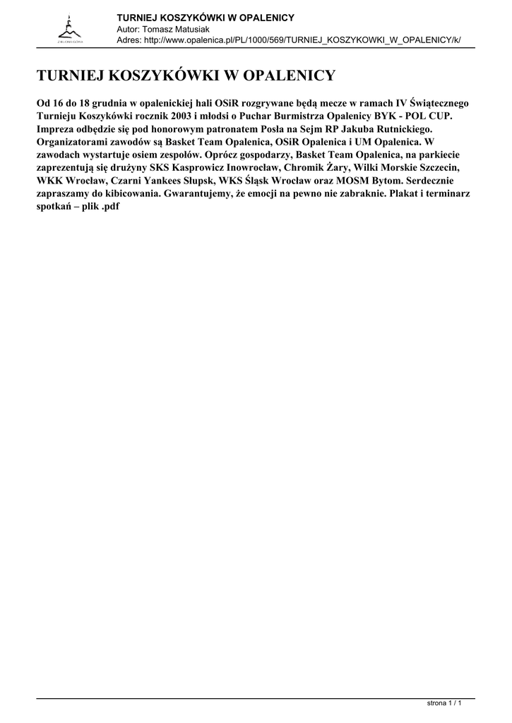 TURNIEJ KOSZYKÓWKI W OPALENICY Autor: Tomasz Matusiak Adres: http://www.opalenica.pl/PL/1000/569/TURNIEJ_KOSZYKOWKI_W_OPALENICY/k/ TURNIEJ KOSZYKÓWKI W OPALENICY Od 16 do 18 grudnia w opalenickiej hali OSiR rozgrywane będą mecze w ramach IV Świątecznego Turnieju Koszykówki rocznik 2003 i młodsi o Puchar Burmistrza Opalenicy BYK - POL CUP. Impreza odbędzie się pod honorowym patronatem Posła na Sejm RP Jakuba Rutnickiego. Organizatorami zawodów są Basket Team Opalenica, OSiR Opalenica i UM Opalenica. W zawodach wystartuje osiem zespołów. Oprócz gospodarzy, Basket Team Opalenica, na parkiecie zaprezentują się drużyny SKS Kasprowicz Inowrocław, Chromik Żary, Wilki Morskie Szczecin, WKK Wrocław, Czarni Yankees Słupsk, WKS Śląsk Wrocław oraz MOSM Bytom. Serdecznie zapraszamy do kibicowania. Gwarantujemy, że emocji na pewno nie zabraknie. Plakat i terminarz spotkań – plik .pdf strona 1 / 1 Powered by TCPDF (www.tcpdf.org)