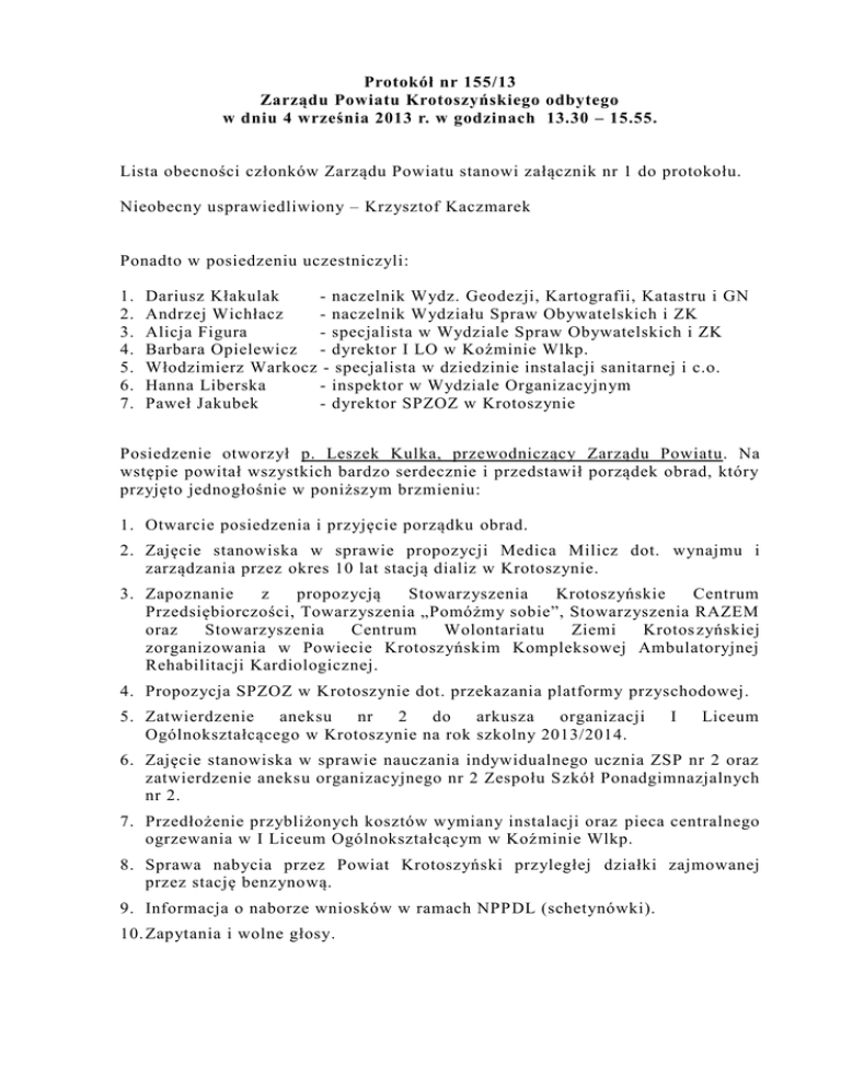 Protokół nr 155/13 Zarządu Powiatu Krotoszyńskiego odbytego w