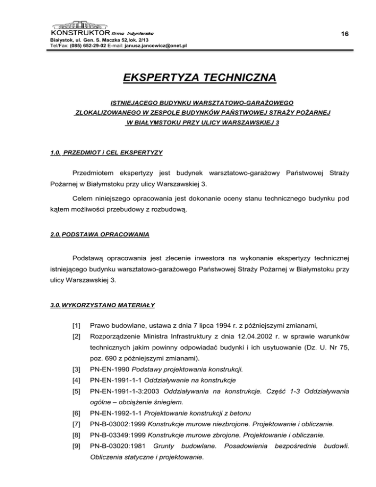 16 Białystok, ul. Gen. S. Maczka 52,lok. 2/13 Tel/Fax: (085) 652-29-02 E-mail: [email protected] EKSPERTYZA TECHNICZNA ISTNIEJĄCEGO BUDYNKU WARSZTATOWO-GARAŻOWEGO ZLOKALIZOWANEGO W ZESPOLE BUDYNKÓW PAŃSTWOWEJ STRAŻY POŻARNEJ W BIAŁYMSTOKU PRZY ULICY WARSZAWSKIEJ 3 1.0. PRZEDMIOT i CEL EKSPERTYZY Przedmiotem ekspertyzy jest budynek warsztatowo-garażowy Państwowej Straży Pożarnej w Białymstoku przy ulicy Warszawskiej 3. Celem niniejszego opracowania jest dokonanie oceny stanu technicznego budynku pod kątem możliwości przebudowy z rozbudową. 2.0. PODSTAWA OPRACOWANIA Podstawą opracowania jest zlecenie inwestora na wykonanie ekspertyzy technicznej istniejącego budynku warsztatowo-garażowego Państwowej Straży Pożarnej w Białymstoku przy ulicy Warszawskiej 3. 3.0. WYKORZYSTANO MATERIAŁY [1] Prawo budowlane, ustawa z dnia 7 lipca 1994 r. z późniejszymi zmianami, [2] Rozporządzenie Ministra Infrastruktury z dnia 12.04.2002 r. w sprawie warunków technicznych jakim powinny odpowiadać budynki i ich usytuowanie (Dz. U. Nr 75, poz. 690 z późniejszymi zmianami). [3] PN-EN-1990 Podstawy projektowania konstrukcji. [4] PN-EN-1991-1-1 Oddziaływanie na konstrukcje [5] PN-EN-1991-1-3:2003 Oddziaływania na konstrukcje. Część 1-3 Oddziaływania ogólne – obciążenie śniegiem. [6] PN-EN-1992-1-1 Projektowanie konstrukcji z betonu [7] PN-B-03002:1999 Konstrukcje murowe niezbrojone. Projektowanie i obliczanie. [8] PN-B-03349:1999 Konstrukcje murowe zbrojone. Projektowanie i obliczanie. [9] PN-B-03020:1981 Grunty budowlane. Obliczenia statyczne i projektowanie. Posadowienia bezpośrednie budowli. 17 Białystok, ul. Gen. S. Maczka 52,lok. 2/13 Tel/Fax: (085) 652-29-02 E-mail: [email protected] [10] J. Heja, P. Pietraszek, K. Schabowicz: Obliczenia konstrukcji budowlanych wznoszonych tradycyjnie, Dolnośląskie Wydawnictwo Edukacyjne, Wrocław 2006 r. [11] Cz. Linczowski; Naprawy, remonty i modernizacje budynków; Wydawnictwo Politechniki Świętokrzyskiej, Kielce 1997 r. [12] A. Mitzel, W. Stachurski, J. Suwalski; Awarie konstrukcji betonowych i murowych, Arkady, Warszawa 1973 r. [13] J. Murzewski: Niezawodność konstrukcji inżynierskich, Arkady, 1989. [14] J. Thierry, S. Zaleski; Remonty budynków i wzmacnianie konstrukcji, Arkady, Warszawa 1972 r. [15] S. Zaleski red.; Remonty budynków mieszkalnych. Arkady, Warszawa 1995 r. 4.0. BADANIA I POMIARY WŁASNE Na potrzeby niniejszej ekspertyzy technicznej wykonano następujące badania i pomiary własne: ─ dokumentacja fotograficzna elementów budynku sporządzona w marcu 2014r. ─ niezbędne pomiary inwentaryzacyjne wymiarów budynku, ─ odkrywka geologiczna. 5.0. WARUNKI GRUNTOWO-WODNE Zgodnie odkrywką geologiczną , występują następujące wydzielone grupy gruntów budujące warstwy geotechniczne: a/ grunty powierzchniowe reprezentowane przez nasyp niebudowlany oraz humus o miąższości 0,20m-0,40m. b/ pod gruntami powierzchniowymi znajdują się grunty niespoiste reprezentowane przez piaski drobne, średnio zagęszczone o Id=0,40. Zwierciadło wody gruntowej znajduje się poniżej poziomu posadowienia. 6.0. OGÓLNA CHARAKTERYSTYKA ISTNIEJĄCEGO BUDYNKU: 18 Białystok, ul. Gen. S. Maczka 52,lok. 2/13 Tel/Fax: (085) 652-29-02 E-mail: [email protected] Przedmiotem ekspertyzy jest budynek warsztatowo-garażowy. Jest to budynek parterowy o konstrukcji w postaci szkieletu żelbetowego. Budynek posiada 6 drewnianych bram z przeszkleniami, oddzielonych filarkami wymurowanymi z cegły pełnej ceramicznej. Na podstawie wizji lokalnej stwierdzono, że ściany wypełniające wykonane są z gazobetonu. Stropodach gęstożebrowy typu DZ-3 oparty na poprzecznych belkach żelbetowych. Na poniższych zdjęciach pokazano elewację frontową z bramami. Rys. 1. Elewacja fronotowa – strona lewa Rys. 2. Elewacja frontowa – strona prawa 19 Białystok, ul. Gen. S. Maczka 52,lok. 2/13 Tel/Fax: (085) 652-29-02 E-mail: [email protected] 7.0. OCENA STANU TECHNICZNEGO BUDYNKU 7.1. KRYTERIA OKREŚLAJĄCE STOPIEŃ ZNISZCZENIA POSZCZEGÓLNYCH ELEMENTÓW KONSTRUKCYJNYCH stan techniczny doskonały - zniszczenie elementu konstrukcyjnego 0 do 10 % stan techniczny zadawalający - zniszczenie elementu konstrukcyjnego 11 do 20 % stan techniczny średni - zniszczenie elementu konstrukcyjnego 21 do 40 % stan techniczny zły - zniszczenie elementu konstrukcyjnego 41 do 60 % stan techniczny awaryjny - zniszczenie elementu konstrukcyjnego ponad 61 % 7.2. ŁAWY i ŚCIANY FUNDAMENTOWE. Na podstawie wizji lokalnej stwierdza się, że stan stan ław i ścian fundamentowych budynku jest zadawalający. Nie jest wymagane wzmocnienie istniejących ław fundamentowych. 7.3. ŚCIANY BUDYNKU. Większość powierzchni ściany zewnętrznej frontowej stanowią bramy drewniane i przeszklenia znajdujące się nad nimi. Pomiędzy bramami znajdują się filary murowane z cegły ceramicznej pełnej. Tynk elewacyjny uległ miejscowym uszkodzeniom, odsłaniając elementy murowe. Odsłonięte cegły uległy częściowej destrukcji w wyniku działania czynników atmosferycznych. Pomiędzy filarami, nad otworami bramowymi znajdują się nadproża żelbetowe. Filary pełnią rolę konstrukcyjną. Ich stan oceniono jako średni. Na poniższym rysunku pokazano uszkodzenie elewacji. 20 Białystok, ul. Gen. S. Maczka 52,lok. 2/13 Tel/Fax: (085) 652-29-02 E-mail: [email protected] Rys. 3. Uszkodzenie elewacji. Ściany wewnętrzne poprzeczne i tylna ściana zewnętrzna podłużna są ścianami nienośnymi, wypełniającymi. Na podstawie wizji lokalnej stwierdzono, że wykonane są z elementów murowych gazobetonowych. Na ścianach tych widoczne są zarysowania. Pokazano to na poniższych zdjęciach. Rys. 4. Rysa w ścianie wypełniającej 21 Białystok, ul. Gen. S. Maczka 52,lok. 2/13 Tel/Fax: (085) 652-29-02 E-mail: [email protected] Rys. 5. Rysa w ścianie wypełniającej Przyczyną występujących zarysowań jest oddzielne posadowienie elementów konstrukcyjnych i ścian wypełni