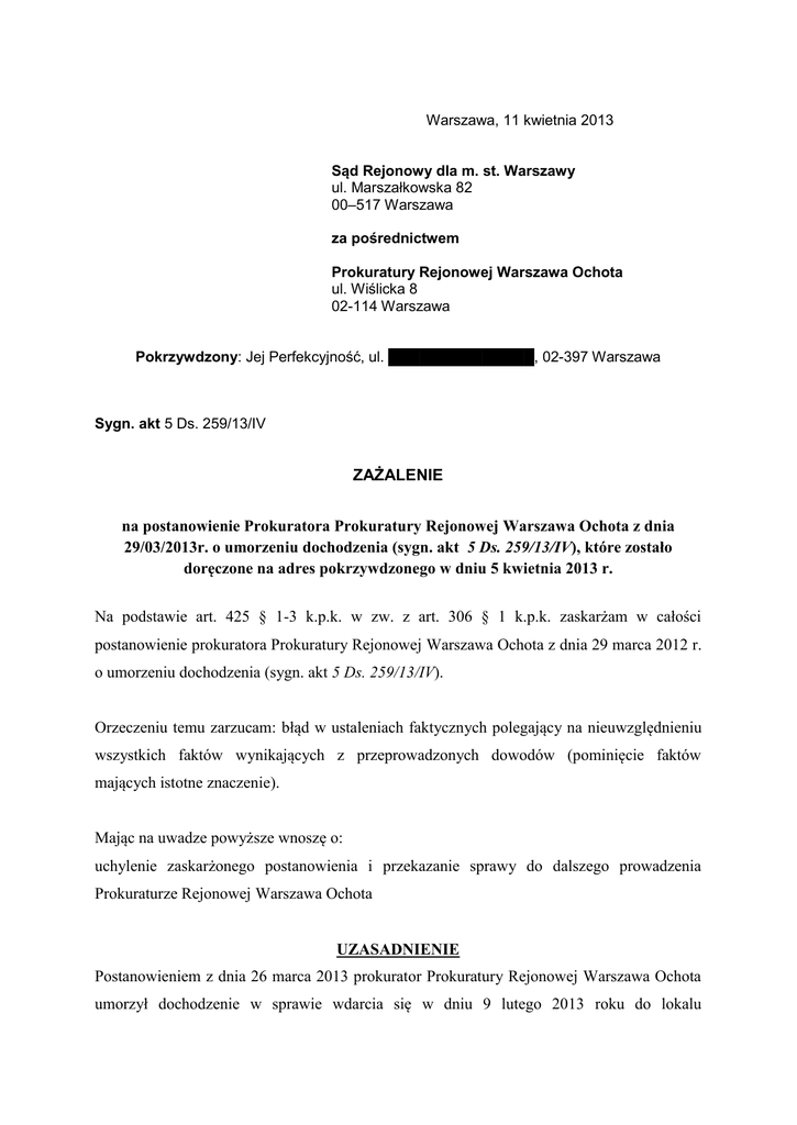 Warszawa, 11 kwietnia 2013 Sąd Rejonowy dla m. st. Warszawy ul. Marszałkowska 82 00–517 Warszawa za pośrednictwem Prokuratury Rejonowej Warszawa Ochota ul. Wiślicka 8 02-114 Warszawa Pokrzywdzony: Jej Perfekcyjność, ul. ██████████████, 02-397 Warszawa Sygn. akt 5 Ds. 259/13/IV ZAŻALENIE na postanowienie Prokuratora Prokuratury Rejonowej Warszawa Ochota z dnia 29/03/2013r. o umorzeniu dochodzenia (sygn. akt 5 Ds. 259/13/IV), które zostało doręczone na adres pokrzywdzonego w dniu 5 kwietnia 2013 r. Na podstawie art. 425 § 1-3 k.p.k. w zw. z art. 306 § 1 k.p.k. zaskarżam w całości postanowienie prokuratora Prokuratury Rejonowej Warszawa Ochota z dnia 29 marca 2012 r. o umorzeniu dochodzenia (sygn. akt 5 Ds. 259/13/IV). Orzeczeniu temu zarzucam: błąd w ustaleniach faktycznych polegający na nieuwzględnieniu wszystkich faktów wynikających z przeprowadzonych dowodów (pominięcie faktów mających istotne znaczenie). Mając na uwadze powyższe wnoszę o: uchylenie zaskarżonego postanowienia i przekazanie sprawy do dalszego prowadzenia Prokuraturze Rejonowej Warszawa Ochota UZASADNIENIE Postanowieniem z dnia 26 marca 2013 prokurator Prokuratury Rejonowej Warszawa Ochota umorzył dochodzenie w sprawie wdarcia się w dniu 9 lutego 2013 roku do lokalu mieszkalnego █ przy ulicy ████████████ w Warszawie grupy nieustalonych mężczyzn i wbrew żądaniom osoby uprawnionej miejsca tego nie opuszczali oraz w sprawie pobicia w dniu 9 lutego 2013 w Warszawie w mieszkaniu █ przy ulicy ███████████ w Warszawie ██████████████ i █████████████ przez grupę mężczyzn liczącą 5-6 osób wobec braku wykrycia sprawców. Prowadzący dochodzenie policjanci z Komendy Rejonowej Policji Warszawa III podjęli szereg działań na rzecz ustalenia sprawców. Dotarli także do nagrania wideo z monitoringu zamontowanego w bloku przy ul. ███████████, na którym widać sprawców zajścia. Są oni jednak zamaskowani – zgodnie z zeznaniami świadków i pokrzywdzonych. Wbrew jednak zeznaniom świadków, nie dotarli do nagrań monitoringu poprzedzających zajścia. Świadkowie podnosi w zeznaniach, że sprawców – jeszcze niezamaskowanych – widzieli w bloku przy ul. ████████████ wcześniej w ciągu nocy 9 lutego 2013 w miejscach, gdzie znajduje się także monitoring. Dotarcie do nagrań mogłoby pozwolić ustalić tożsamość podejrzanych, przesłuchanie ich oraz kontynuowanie postępowania. W związku z powyższym wydaje się, że decyzja o umorzeniu dochodzenia była przedwczesna. Wobec wskazanych faktów, wnoszę o uchylenie zaskarżonego postanowienia w całości i przekazanie sprawy do dalszego prowadzenia prokuratorowi. ………………………… (czytelny podpis) Załączniki: 1. Odpis zażalenia