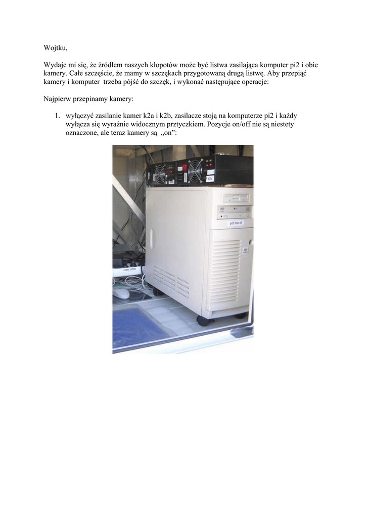 Wojtku, Wydaje mi się, że źródłem naszych kłopotów może być listwa zasilająca komputer pi2 i obie kamery. Całe szczęście, że mamy w szczękach przygotowaną drugą listwę. Aby przepiąć kamery i komputer trzeba pójść do szczęk, i wykonać następujące operacje: Najpierw przepinamy kamery: 1. wyłączyć zasilanie kamer k2a i k2b, zasilacze stoją na komputerze pi2 i każdy wyłącza się wyraźnie widocznym prztyczkiem. Pozycje on/off nie są niestety oznaczone, ale teraz kamery są „on”: 2. Obok komputera pi2 leżą na podłodze dwie listwy: Trzeba wypiąć kable kamer (dwie wtyczki wpięte w listwę obok siebie, w dwa pierwsze gniazdka licząc od dolnej części powyższego zdjęcia), wpiąć je w leżącą obok listwę z czterema gniazdkami. 3. Następnie trzeba włączyć znowu kamery prztyczkami, w tej kolejności, przed przepięciem komputera (poniżej). Następnie przepinamy komputer. W tym celu należy: 4. Wypiąć jego kabel zasilania („samotna” wtyczka wpięta w czwarte gniazdko licząc od dołu zdjęcia, albo drugie licząc od drugiego końca) i wpiąć go do leżącej obok listwy. W tym momencie pi2 powinien zacząć wstawać ale przypuszczam że nie wstanie sam. 5. Zrobić palcem power off/on, tak jak zrobiłeś dziś rano. Pi2 powinien wstać i powinniśmy odzyskać nad nim kontrole. Dalej powinniśmy nawiązać kontakt, w zależności od tego, co się stanie po całej operacji. Dziękujemy! L