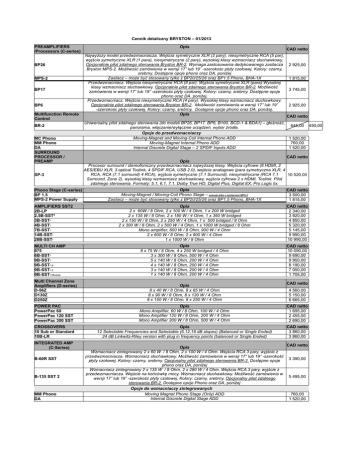 Cennik detaliczny BRYSTON – 01/2013 PREAMPLIFIERS /Processors (C-series) BP26 MPS-2 BP17 BP6 Multifunction Remote Control BR-2 MC Phono MM Phono DA SURROUND PROCESSOR / PREAMP SP-3 Phono Stage (C-series) BP 1.5 MPS-2 Power Supply AMPLIFIERS SST2 2B-LP 2,5B-SST² 3B-SST² 4B-SST² 7B-SST² 14B-SST² 28B-SST² MULTI CH AMP 875 6B-SST² 9B-SST² 9B-SST²-4 9B-SST²-3 9B-SST²-Module Multi Channel Zone Amplifiers (D-series) D-56Z D130Z D250Z Opis Najwyższy model przedwzmacniacza. Wejścia symetryczne XLR (2 pary), niesymetryczne RCA (5 par), wyjścia symetryczne XLR (1 para), niesymetryczne (2 pary), wysokiej klasy wzmacniacz słuchawkowy. Opcjonalnie pilot zdalnego sterowania Bryston BR-2. Wymaga zastosowania dedykowanego zasilacza Bryston MPS-2. Możliwość zamówienia w wersji 17” lub 19” -szerokośc płyty czołowej. Kolory: czarny, srebrny. Dostępne opcje phono oraz DA, poniżej Zasilacz – może być stosowany tylko z BP20/25/26 oraz BP1.5 Phono, BHA-1X Przedwzmacniacz. Wejścia niesymetryczne RCA (8 par). Wyjścia symetryczne XLR (para).Wysokiej klasy wzmacniacz słuchawkowy. Opcjonalnie pilot zdalnego sterowania Bryston BR-2. Możliwość zamówienia w wersji 17” lub 19” -szerokośc płyty czołowej. Kolory: czarny, srebrny. Dostępne opcje phono oraz DA, poniżej. Przedwzmacniacz. Wejścia niesymetryczne RCA (4 pary). Wysokiej klasy wzmacniacz słuchawkowy. Opcjonalnie pilot zdalnego sterowania Bryston BR-2. Możliwość zamówienia w wersji 17” lub 19” -szerokośc płyty czołowej. Kolory: czarny, srebrny. Dostępne opcje phono oraz DA, poniżej. Opis CAD netto 2 925,00 1 815,00 3 745,00 2 925,00 CAD netto Uniwersalny pilot zdalnego sterowania (do modeli BP26, BP17, BP6, B100, BCD-1 & BDA1) – głośność, 645,00 450,00 panorama, włączanie/wyłącznie urządzeń, wybór źródła. Opcje do przedwzmacniaczy Moving-Magnet and Moving-Coil Internal Phono ADD 1 520,00 Moving-Magnet Internal Phono ADD 760,00 Internal Discrete Digital Stage – 2 SPDIF Inputs ADD 1 520,00 CAD netto Opis Procesor surround / stereofoniczny przedwzmacniacz najwyższej klasy. Wejścia cyfrowe (8 HDMI, 2 AES/EBU XLR, 3 optical Toslink, 4 SPDIF RCA, USB 2.0), wejścia analogowe (para symetryczna XLR, 4 RCA, RCA (7.1 surround) 4 RCA), wyjścia symetryczne (7.1 Surround), niesymetryczne (RCA 7.1 10 520,00 Surround, Zone 2), wysokiej klasy wzmacniacz słuchawkowy, wyjścia cyfrowe 2 x HDMI, Toslink. Pilot zdalnego sterowania. Formaty: 5.1, 6.1, 7.1, Dolby True HD, Digital Plus, Digital EX, Pro Logic Iix. Opis Moving-Magnet / Moving-Coil Phono Stage – pracuje tylko z zasilaczem MPS-2 Zasilacz – może być stosowany tylko z BP20/25/26 oraz BP1.5 Phono, BHA-1X CAD netto 3 500,00 1 815,00 Opis 2 x 60W / 8 Ohm, 2 x 100 W / 4 Ohm, 1 x 200 W bridged 2 x 135 W / 8 Ohm, 2 x 180 W / 4 Ohm, 1 x 360 W bridged 2 x 150 W / 8 Ohm, 2 x 250 W / 4 Ohm, 1 x 500 bridged / 8 Ohm 2 x 300 W / 8 Ohm, 2 x 500 W / 4 Ohm, 1 x 1000 W bridged / 8 Ohm Mono amplifier, 600 W / 8 Ohm, 900 W / 4 Ohm 2 x 600 W / 8 Ohm, 2 x 900 W / 4 Ohm 1 x 1000 W / 8 Ohm CAD netto 2 340,00 3 920,00 4 850,00 5 320,00 5 145,00 9 990,00 10 990,00 Opis 8 x 75 W / 8 Ohm, 4 x 250 W bridged / 4 Ohm 3 x 300 W / 8 Ohm, 500 W / 4 Ohm 5 x 140 W / 8 Ohm, 200 W / 4 Ohm 4 x 140 W / 8 Ohm, 200 W / 4 Ohm 3 x 140 W / 8 Ohm, 200 W / 4 Ohm 1 x 140 W / 8 Ohm, 200 W / 4 Ohm CAD netto 10 090,00 9 690,00 9 950,00 8 190,00 7 050,00 1 705,00 Opis 8 x 40 W / 8 Ohm, 8 x 65 W / 4 Ohm 8 x 90 W / 8 Ohm, 8 x 130 W / 4 Ohm 8 x 150 W / 8 Ohm, 8 x 250 W / 4 Ohm CAD netto 4 560,00 5 150,00 6 665,00 POWER PAC PowerPac 60 PowerPac 120 SST PowerPac 300 SST Opis Mono Amplifier, 60 W / 8 Ohm, 100 W / 4 Ohm Mono Amplifier 120 W / 8 Ohm, 200 W / 4 Ohm Mono Amplifier 300 W / 8 Ohm, 500 W / 4 Ohm CAD netto 1 695,00 2 455,00 2 690,00 CROSSOVERS 10 Sub or Standard 10B-LR Opis 12 Selectable Frequencies and Selectable (6,12,18 dB slopes) (Balanced or Single Ended) 24 dB Linkwitz-Riley version with plug in frequency points (balanced or Single Ended) CAD netto 3 860,00 3 860,00 INTEGRATED AMP (C-Series) B-60R SST B-135 SST 2 MM Phono DA Opis Wzmacniacz zintegrowany 2 x 60 W / 8 Ohm, 2 x 100 W / 4 Ohm. Wejścia RCA 3 pary, wyjście z przedwzmacniacza. Wzmacniacz słuchawkowy. Możliwość zamówienia w wersji 17” lub 19” -szerokość płyty czołowej. Kolory: czarny, srebrny. Opcjonalny pilot zdalnego sterowania BR-2. Dostępne opcje phono oraz DA, poniżej Wzmacniacz zintegrowany 2 x 135 W / 8 Ohm, 2 x 280 W / 4 Ohm. Wejścia RCA 3 pary, wyjście z przedwzmacniacza. Wejście na końcówkę mocy. Wzmacniacz słuchawkowy. Możliwość zamówienia w wersji 17” lub 19” -szerokość płyty czołowej. Kolory: czarny, srebrny. Opcjonalny pilot zdalnego sterowania BR-2. Dostępne opcje Phono oraz DA, poniżej Opcje do wzmacniaczy zintegrowanych Moving Magnet Phono Stage (Only) ADD Internal Discrete Digital Stage ADD CAD netto 3 390,00 5 495,00 760,00 1 520,00 EXTERNAL DAC BDA-1 BDA-2 Digital Music Player BDP-1 BDP-2 Bryston Headphone Amplifier BHA-1 BHA-1X Analog Interconnect 1 meter pair RCA/XLR Custom pair-cost per meter/pair for lenght beyond 1 m Digital Interconnect BNC / RCA AES EBU Opis CAD netto Zewnętrzny przetwornik cyfrowo analogowy 192kHz/24bit. Wejścia: USB(1), SPDIF RCA (2), BNC (2), 2 250,00 AES EBU (1), TOSLINK (2), wyjścia stereo symetryczne XLR, niesymetryczne RCA. Opcjonalny pilot zdalnego sterowania BR-2.. Zewnętrzny przetwornik cyfrowo analogowy 192kHz/24bit. Wejścia: asynchroniczne USB 2 (1), SPDIF RCA (2), BNC (2), AES EBU (1), TOSLINK (2) wyjścia stereo symetryczne XLR, niesymetryczne RCA. 2 670,00 Opcjonalny pilot zdalnego sterowania BR-2. Opis CAD netto Odtwarzacz plików muzycznych wysokiej rozdzielczości. Wejścia źródeł USB (4), wyjścia SPDIF (BNC), 2 350,00 AES/EBU (XLR). Odtwarzacz plików muzycznych wysokiej rozdzielczości. Wejścia źródeł USB (6), eSATA (1), Gigabit 3 355,00 Ethernet (2 – RJ-45), wyjścia SPDIF (BNC), AES/EBU (XLR). Kompat