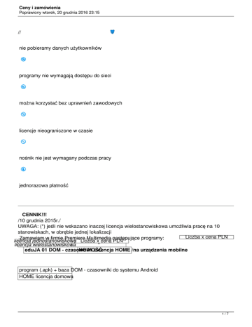 Ceny i zamówienia Poprawiony wtorek, 20 grudnia 2016 23:15 // nie pobieramy danych użytkowników programy nie wymagają dostępu do sieci można korzystać bez uprawnień zawodowych licencje nieograniczone w czasie nośnik nie jest wymagany podczas pracy jednorazowa płatność CENNIK!!! /10 grudnia 2015r./ UWAGA: (*) jeśli nie wskazano inaczej licencja wielostanowiskowa umożliwia pracę na 10 stanowiskach, w obrębie jednej lokalizacji Liczba x cena PLN Zamawiam w firmie Premiere Multimedia następujące programy: licencja jednostanowiskowa Liczba x cena PLN licencja wielostanowiskowa * eduJA 01 DOM - czasowniki NOWOŚĆ Licencja HOME /na urządzenia mobilne program (.apk) + baza DOM - czasowniki do systemu Android HOME licencja domowa 1/7 Ceny i zamówienia Poprawiony wtorek, 20 grudnia 2016 23:15 **) licencja domowa pozwala na zainstalowanie na maksymalnie trzech urządzeniach - 98,40 ** x kpaMOBILE - Kwestionariusz preferowanych NOWOŚĆ aktywności na urządzenia mobilne program (.apk) do systemu Android dostarczany na nośniku CD - licencja edukacyjna + półroczna aktua **) licencja wielostanowiskowa = na wszystkie urządzenia mobilne w placówce (wyposażenie w obrębie 246,- x 861 ,- (**) WAKACYJNA PROMOCJA! 615 Pakiet Każdy jest a@ktywny ! - materiały pomocnicze NOWOŚĆ do prowadzenia zajęć grupowych i indyw A = Materiały drukowalne (scenariusze lekcji, karty pracy do powielania) + programy (CD) - licencja eduk B = A + kpaDRUK A: 492,- x B: 861,- x Pakiet KPA - programy do diagnozy preferowanej aktywności Program (CD) - licencja edukacyjna + półroczna aktualizacja kpaPROGRAM + kpaDRUK 1599+ kpaIMPORT + kpa,-POKAZ + arkusze startowe PROMOCJA supercena: 984,- x mapaTALENTÓW diagnoza-edukacja-doradztwo Program (CD) - licencja edukacyjna 861,- x + półroczna aktualizacja 1845,- x Każda dodatkowa licencja- do edukacyjnej licencji wielostanowiskowej 80,- x KWAZAr - wyszukiwarka kwalifikacji i zawodów Program (CD) + półroczna 369,aktualizacja x 1100 ,upust 20% 880,- x Każda dodatkowa licencja- do licencji wielostanowiskowej 50,- x Pakiet 102 zawody z przyszłością (zawiera KPA) - nowa wersja Program (CD) + półroczna 615,aktualizacja x 1599,- x Każda dodatkowa licencja- do licencji wielostanowiskowej 80,- x KPA druk - drukowanie formularzy testowych PR 2/7 Ceny i zamówienia Poprawiony wtorek, 20 grudnia 2016 23:15 Licencja szkolna - Program 1476,(CD)x KPA pokaz - wyświetlanie pytań do grupowych sesji testowych "papier-ołówek" Program (CD) 246,- x KPA arkusz - komplet wydruków (arkusz testowy, arkusz obliczania wyników, informacja zwrotna) 30 kompletów 98,40 x 100 kompletów - cena promocyjna! 246,- x KPA program Program (CD) 369,- x 1107,- x KPA import - import wyników do bazy Program (CD) 246,- x Absolwent - szukam pracy Program + przewodnik metodyczny 246,- x (CD) + półroczna 492,aktualizacja x Przewodnik metodyczny (druk) 24,- x Każda dodatkowa licencja- do licencji wielostanowiskowej 25,- x Absolwent - zakładam firmę Program + przewodnik metodyczny 246,- x (CD) + półroczna 492,aktualizacja x Przewodnik metodyczny 24,- x Każda dodatkowa licencja- do licencji wielostanowiskowej 25,- x Absolwent - działam skutecznie Program + przewodnik metodyczny 246,- x (CD) + półroczna 492,aktualizacja x Przewodnik metodyczny 24,- x Każda dodatkowa licencja- do licencji wielostanowiskowej 25,- x Absolwent - suplement Program (CD) + półroczna 246,aktualizacja x 492,- x Każda dodatkowa licencja- do licencji wielostanowiskowej 25,- x Wychowanie do aktywnego udziału w życiu gospodarczym Program + przewodnik metodyczny 246,- x (CD) + półroczna 492,aktualizacja x Przewodnik metodyczny 24,- x Każda dodatkowa licencja- do licencji wielostanowiskowej 25,- x zwojnica2005 Program (CD) + półroczna 246,aktualizacja x 492,- x Każda dodatkowa licencja- do licencji wielostanowiskowej 25,- x Popularny Kwestionariusz Inteligencji Emocjonalnej Program (CD) + półroczna 246,aktualizacja x 492,- x Każda dodatkowa licencja- do licencji wielostanowiskowej 25,- x Wstępna Orientacja Zawodowa Program (CD) + instrukcja369,obsługi x i informator dla doradcy 1100,- x (druk) Każda dodatkowa licencja- do licencji wielostanowiskowej 50,- x 3/7 Ceny i zamówienia Poprawiony wtorek, 20 grudnia 2016 23:15 Komplet przewodników metodycznych (4) ABS SP + ABS ZF + ABS DS + WG Przewodniki drukowane 78,- x . Przewodniki metodyczne 65,na CD x . BOX przedsiębiorczość 7 (tytułów) Programy (CD): Wstępna1599,Orientacja x Zawodowa, Absolwent 2952,- x - szukam pracy, Absolwent - zakładam fir Każda dodatkowa licencja- do licencji wielostanowiskowej 80,- x stmTESTY Program (CD) - licencja SZKOLNA 1196,- x 1952,- x Każda dodatkowa licencja- do licencji wielostanowiskowej 80,- x (SZK) Program (CD) - licencja KOMERCYJNA 1952,- x 5500,- x stmGenerator pro max Program (CD) - licencja NAUCZYCIELSKA** 59,- x niedostępna Program (CD) - licencja SZKOLNA 450,- x 1350,- x Każda dodatkowa licencja- do licencji wielostanowiskowej 60,- x SZK Program (CD) - licencja KOMERCYJNA 1196,- x 3500,- x learningPANEL Program (CD) - licencja NAUCZYCIELSKA** 59,- x niedostępna Program (CD) - licencja SZKOLNA 450,- x 1350,- x Każda dodatkowa licencja- do licencji wielostanowiskowej 60,- x SZK Program (CD) - licencja KOMERCYJNA 1196,- x 3500,- x stmPlacement testy kwalifikacyjne z j. angielskiego Program (CD) niedostępna 369,- x Nazwa szkoły/firmy/instytucji: Imię i nazwisko osoby zamawiającej: NIP: Ulica, nr domu i mieszkania: Kod pocztowy: Miasto: nr telefonu: e-mail: inne: 4/7 Ceny i zamówienia Poprawiony wtorek, 20 grudnia 2016 23:15 Ceny zawierają podatek . Przesyłka VAT zostanie wysłana w ciągu 7 dni od przyjęcia zamówienia. 5/7 Ceny i zamówienia Poprawiony wtorek, 20 grudnia 2016 23:15 W przypadku zamówień200 poniżej ,- zł należy doliczyć 15,-200 zł opłaty za przesyłkę. Przy ,- zł kos jedn *) Oferta dla pracowni szkolnych 10 stanowisk (gimnazja, licea) , 1- nośnik licen
