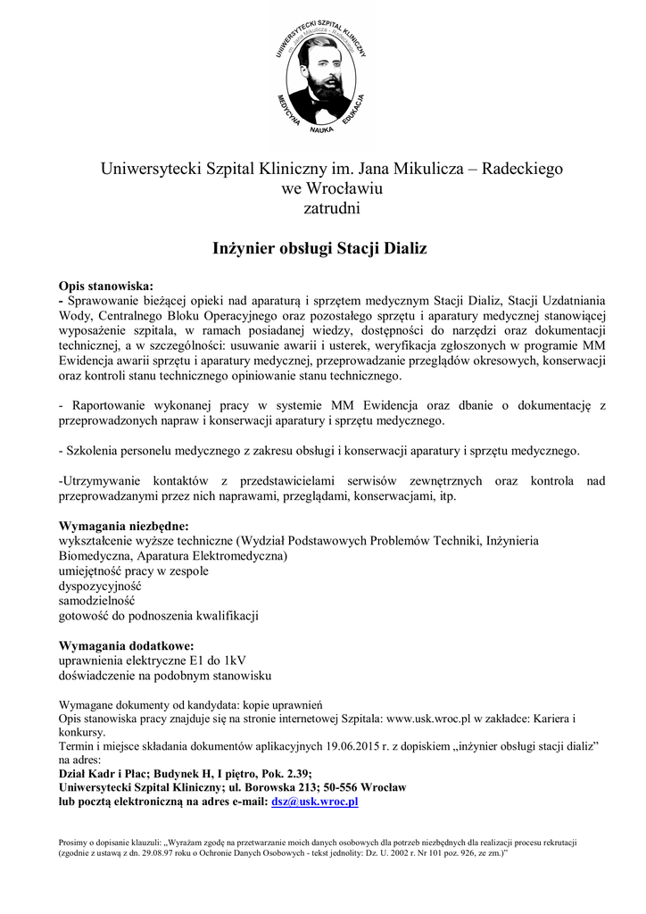 Uniwersytecki Szpital Kliniczny im. Jana Mikulicza – Radeckiego we Wrocławiu zatrudni Inżynier obsługi Stacji Dializ Opis stanowiska: - Sprawowanie bieżącej opieki nad aparaturą i sprzętem medycznym Stacji Dializ, Stacji Uzdatniania Wody, Centralnego Bloku Operacyjnego oraz pozostałego sprzętu i aparatury medycznej stanowiącej wyposażenie szpitala, w ramach posiadanej wiedzy, dostępności do narzędzi oraz dokumentacji technicznej, a w szczególności: usuwanie awarii i usterek, weryfikacja zgłoszonych w programie MM Ewidencja awarii sprzętu i aparatury medycznej, przeprowadzanie przeglądów okresowych, konserwacji oraz kontroli stanu technicznego opiniowanie stanu technicznego. - Raportowanie wykonanej pracy w systemie MM Ewidencja oraz dbanie o dokumentację z przeprowadzonych napraw i konserwacji aparatury i sprzętu medycznego. - Szkolenia personelu medycznego z zakresu obsługi i konserwacji aparatury i sprzętu medycznego. -Utrzymywanie kontaktów z przedstawicielami serwisów zewnętrznych oraz kontrola nad przeprowadzanymi przez nich naprawami, przeglądami, konserwacjami, itp. Wymagania niezbędne: wykształcenie wyższe techniczne (Wydział Podstawowych Problemów Techniki, Inżynieria Biomedyczna, Aparatura Elektromedyczna) umiejętność pracy w zespole dyspozycyjność samodzielność gotowość do podnoszenia kwalifikacji Wymagania dodatkowe: uprawnienia elektryczne E1 do 1kV doświadczenie na podobnym stanowisku Wymagane dokumenty od kandydata: kopie uprawnień Opis stanowiska pracy znajduje się na stronie internetowej Szpitala: www.usk.wroc.pl w zakładce: Kariera i konkursy. Termin i miejsce składania dokumentów aplikacyjnych 19.06.2015 r. z dopiskiem „inżynier obsługi stacji dializ” na adres: Dział Kadr i Płac; Budynek H, I piętro, Pok. 2.39; Uniwersytecki Szpital Kliniczny; ul. Borowska 213; 50-556 Wrocław lub pocztą elektroniczną na adres e-mail: [email protected] Prosimy o dopisanie klauzuli: „Wyrażam zgodę na przetwarzanie moich danych osobowych dla potrzeb niezbędnych dla realizacji procesu rekrutacji (zgodnie z ustawą z dn. 29.08.97 roku o Ochronie Danych Osobowych - tekst jednolity: Dz. U. 2002 r. Nr 101 poz. 926, ze zm.)”