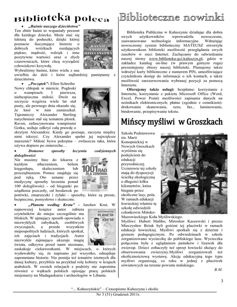 „Baśnie naszego dzieciństwa” Ten zbiór baśni to wspaniały prezent dla każdego dziecka. Może stać się lekturą do poduszki, dzięki której poznacie fascynujące historie o dobrych wróżkach rozdających piękno, mądrość, wdzięk i inne pozytywne wartości oraz o złych czarownicach, które chcą wyrządzić człowiekowi krzywdę. Wybraliśmy baśnie, które wielu z nas uwielbia do dziś i które najbardziej pamiętamy z dzieciństwa. „Początek”- Ellen Schreibe Nowy chłopak w mieście. Pogłoski o wampirach. I pierwsza, niebezpieczna miłość. Dwór na szczycie wzgórza wiele lat stał pusty, ale pewnego dnia okazało się, że ktoś w nim zamieszkał. Tajemniczy Alexander Sterling natychmiast stał się tematem plotek. Raven, zafascynowana wampirami Gotka, usiłuje odkryć całą prawdę o skrytym Alexandrze. Kiedy go poznaje, zaczyna między nimi iskrzyć. Czy Alexander spełni jej największe marzenie? Miłość bywa pokrętna – zwłaszcza taka, która ożywa dopiero po zmierzchu… Domowe sposoby leczenia codziennych dolegliwości Nie musimy biec do lekarza z każdym stłuczeniem, bólem kręgosłupa, skaleczeniem lub przeziębieniem. Pomoc znajduje się pod ręką. Oto uznane przez medycynę sposoby leczenia ponad 100 dolegliwości - od biegunki po użądlenia pszczoły, od brodawek po potówki, zmarszczki i żylaki - sposoby, które są proste, bezpieczne, pomysłowe i skuteczne. „Planeta według Kreta” - Jaroław Kret. W najnowszej książce autor zabiera czytelników do miejsc szczególnie mu bliskich. W ujmujący sposób opowiada o niezwykłych zabytkach, osobliwych zwyczajach, a przede wszystkim niepospolitych ludziach, których spotkał, ich zajęciach i tradycjach. Autor niezwykle zajmująco ukazuje magię świata, odkrywa przed nami nieznane, zaskakuje ciekawostkami. W miejscach, o których wydawałoby się, że napisano już wszystko, odnajduje zapomniane historie. Nie pomija też tematów istotnych dla danej kultury, przybliża na przykład rolę kobiety w krajach arabskich. W swoich relacjach z podróży nie zapomina również o wątkach polskich opisując pracę polskich misjonarzy na Madagaskarze i archeologów w Libanie. Biblioteka Publiczna w Kałuszynie działając dla dobra swych użytkowników wprowadziła nowoczesne, zaawansowane technologie informacyjne. Wdrażając nowoczesny system biblioteczny MATEUSZ stworzyła użytkownikom biblioteki możliwość przeglądania swych zasobów w sieci Internet. Zachęcamy do odwiedzania naszej strony www.biblioteka-gci.kaluszyn.pl, gdzie w zakładce katalog on-line (w prawym górnym rogu) prezentujemy zbiory naszej biblioteki. Planujemy także wdrożyć karty biblioteczne z numerem PIN, umożliwiające czytelnikom dostęp do informacji o ich kontach, a także możliwość zarezerwowania wybranej pozycji za pomocą Internetu. Oferujemy także usługi: bezpłatne: korzystanie z Internetu, korzystanie z pakietu Microsoft Office (Word, Excel, Power Point) możliwości zapisania danych na nośnikach elektronicznych; płatne (zgodnie z cennikiem): drukowanie skanowanie, xero, fax., laminowanie, bindowanie, przepisywanie tekstu. Szkoła Podstawowa im. Marii Konopnickiej w Nowych Groszkach wyróżnia się podejściem do edukacji przyrodniczej. Uczniowie tej szkoły mają do dyspozycji ścieżkę ekologiczną o długości kilku kilometrów, która biegnie przez okoliczne lasy, pola. W ramach edukacji łowieckiej właśnie tę szkołę odwiedzili członkowie MińskoMazowieckiego Koła Myśliwskiego. Myśliwi: Hubert Malibo, Mirosław Kaszewski i prezes Mieczysław Bziuk byli gośćmi tej placówki w ramach edukacji łowieckiej. Myśliwi spotkali się z dziećmi i gronem pedagogicznym. Po odwiedzinach w szkole zorganizowano wycieczkę do pobliskiego lasu. Wycieczka połączona była z oglądaniem paśników i lizawek dla zwierząt. Dzieci zobaczyły też sprzęt łowiecki służący do obserwowania zwierzyny.Myśliwi zorganizowali też okolicznościową wystawę. Akcję edukacyjną tego typu myśliwi organizują, co roku w jednej z placówek oświatowych na terenie powiatu mińskiego. B.M. 3 “... Kałuszyńskie” – Czasopismo Kałuszyna i okolic Nr 3 (51) Grudzień 2011r.