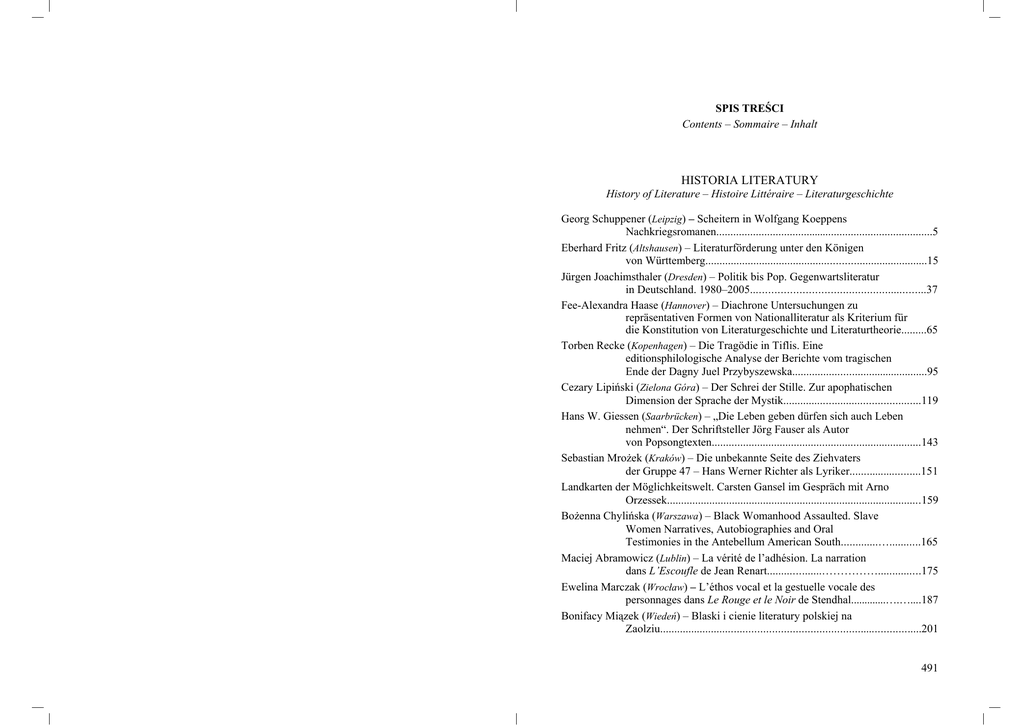 SPIS TREŚCI Contents – Sommaire – Inhalt HISTORIA LITERATURY History of Literature – Histoire Littéraire – Literaturgeschichte Georg Schuppener (Leipzig) – Scheitern in Wolfgang Koeppens Nachkriegsromanen.............................................................................5 Eberhard Fritz (Altshausen) – Literaturförderung unter den Königen von Württemberg..............................................................................15 Jürgen Joachimsthaler (Dresden) – Politik bis Pop. Gegenwartsliteratur in Deutschland. 1980–2005..........................................................37 Fee-Alexandra Haase (Hannover) – Diachrone Untersuchungen zu repräsentativen Formen von Nationalliteratur als Kriterium für die Konstitution von Literaturgeschichte und Literaturtheorie.........65 Torben Recke (Kopenhagen) – Die Tragödie in Tiflis. Eine editionsphilologische Analyse der Berichte vom tragischen Ende der Dagny Juel Przybyszewska................................................95 Cezary Lipiński (Zielona Góra) – Der Schrei der Stille. Zur apophatischen Dimension der Sprache der Mystik................................................119 Hans W. Giessen (Saarbrücken) – „Die Leben geben dürfen sich auch Leben nehmen“. Der Schriftsteller Jörg Fauser als Autor von Popsongtexten..........................................................................143 Sebastian Mrożek (Kraków) – Die unbekannte Seite des Ziehvaters der Gruppe 47 – Hans Werner Richter als Lyriker.........................151 Landkarten der Möglichkeitswelt. Carsten Gansel im Gespräch mit Arno Orzessek..........................................................................................159 Bożenna Chylińska (Warszawa) – Black Womanhood Assaulted. Slave Women Narratives, Autobiographies and Oral Testimonies in the Antebellum American South.............…...........165 Maciej Abramowicz (Lublin) – La vérité de l’adhésion. La narration dans L’Escoufle de Jean Renart...................……………...............175 Ewelina Marczak (Wrocław) – L’éthos vocal et la gestuelle vocale des personnages dans Le Rouge et le Noir de Stendhal.............….…....187 Bonifacy Miązek (Wiedeń) – Blaski i cienie literatury polskiej na Zaolziu..........................................................................................201 491 Magdalena Żelasko (Wiedeń) – Liryczne świadectwo przemijania w wierszach Krystyny Bednarczyk.................................................211 Magdalena Piękoś (Wrocław) – Recepcja powieści Andrzeja Szczypiorskiego „Die schöne Frau Seidenman” w Niemczech................................217 Grzegorz Hetman (Wrocław) – Poezja polska u progu trzeciego tysiąclecia: próba bilansu artystycznego lat 2001–2005...................................227 Janusz Bobrek (Wrocław) – Koniec Europy nadejdzie z Dalekiego Wschodu. Negatywny mit Orientu w polskiej literaturze Dwudziestolecia....237 Paweł Pluta (Wrocław) – W kręgu problemów gotycyzmu. Wokół książki Małgorzaty Czermińskiej Gotyk i pisarze. Topika opisu katedr.........247 Krzysztof Polechoński (Wrocław) – Polska przygoda z paleniem książek – Śląski protest przeciwko reportażowi Ferdynanda Goetla..........255 Katarzyna Nowakowska i Robert Małecki (Warszawa) – O Polakach po niemiecku – wizerunek Polski w najnowszej literaturze niemieckojęzycznej...............................................................................267 DYDAKTYKA LITERATURY Teaching Literature – Didactique de la Littérature – Literaturdidaktik Gerhard Rupp / mit Jan Boelmann (Bochum) – Literaturdidaktik heute – Positionen und Probleme..............................................................279 MISCELLANEA Bonifacy Miązek (Wiedeń) – Nowa książka Piotra Obrączki Od Ordona do Szymanowskiego........................................................................297 Helmut Hofbauer, Evelyna Schmidt (Wrocław) – Entwurf eines Curriculums für das Fach Interkulturelle Kommunikation am Germanistischen Institut der Universität Wrocław...................305 Tomasz G. Pszczółkowski (Warszawa) – Zur Inter- und Multidisziplinarität der Kulturwissenschaft, dargestellt am Beispiel der Deutschlandkunde bzw. der German Studies................................325 Józef Wiktorowicz (Warszawa) – Zur Geschichte des Gegenstandsbereichs der Germanistik...............................................................................333 Marta Torenc (Warszawa) – Zur Praxis der Interkulturalität im Fremdsprachenunterricht....................................................343 Helmut Hofbauer (Wrocław) – Fragen und sich Wundern über den wissenschaftlichen Kulturbegriff.....................................................351 Joanna Godlewicz-Adamiec (Warszawa) – Walhers von der Vogelweide „Unter der Linde” als Beispiel der Mädchenstrophe....…..............367 492 Monika Bilik-Jaśków (Wrocław) – Das stereotype Frauenbild in der Sprache auf Grund der Analyse von Sprichwörtern, Redewendungen und Aphorismen.............................................................................375 Alicja Sakaguchi (Mömbris/Poznań) – Reise ins Heilige Land (9.-27.10.2005): Bericht einer Pilgerin .......................................….........................381 Dagmara Szlagor (Toulouse) – La réciprocité du Regard dans Décalogue (1989) de Krzysztof Kieslowski..…..............................................407 Witold Ucherek (Wrocław) – O przydatności dydaktycznej przyimkowych artykułów hasłowych w słownikach polsko-francuskich na przykładzie temporalnego od.....................................................419 Jolanta Grywaczewska (Wrocław) – Kluczowa rola motywu działania w kontekście zabawy dydaktycznej we wczesnoszkolnej edukacji obcojęzycznej....................................................................425 Paulin