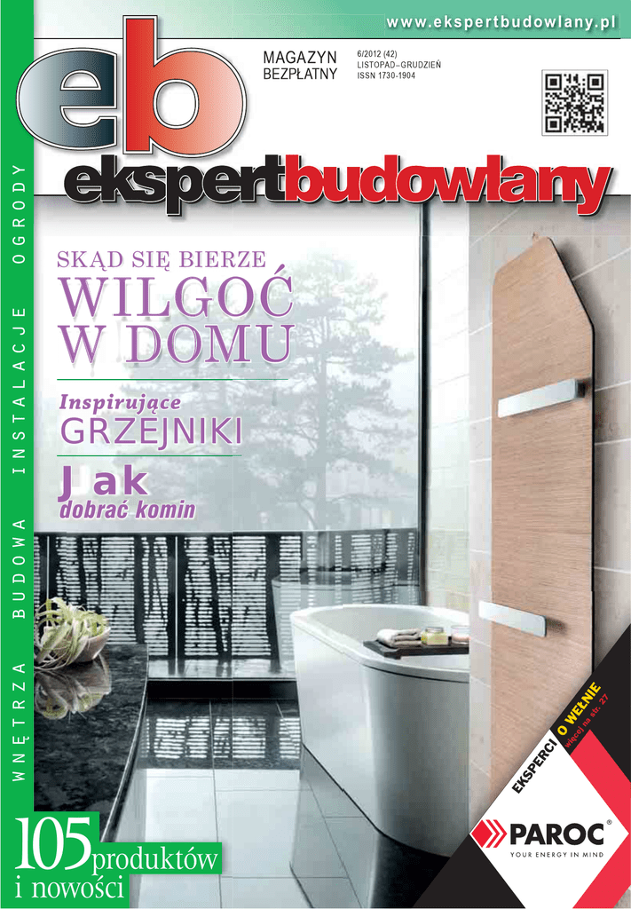 w w w. e ks p e r t b u d ow l a ny. p l MAGAZYN SK ĄD SIĘ BIERZE WILGOĆ W DOMU Inspirujące GRZEJNIKI Jak produktów i nowości NI r. 27 st W EŁ jn a O ce ię w CI ER EK SP 105 E dobrać komin wnetrza budowa in s ta l a c j e ogrody BEZPŁATNY 6/2012 (42) LISTOPAD–GRUDZIEŃ ISSN 1730-1904 Brzezie, ul. Narodowa 27 | 32-080 Zabierzów tel. 12 626 04 52 | kom. 510 296 212 | fax 12 638 88 80 [email protected] | www.gbgroup.com.pl RUSZTOWANIA | SZALUNKI | OGRODZENIA TYMCZASOWE | ZSYPY GRUZOWE Rusztowania ramowe typu: Plettac, Layher, Rux, Bosta Taniej do -65% Szalunki stropowe i ścienne typu: Rasto (MIDI BOX), Takko (MINI BOX) od 49 zł/m Producenci domów drewnianych już od ponad 40 lat stosują z powodzeniem płyty gipsowo-włóknowe przy profesionalnych i ekonomicznych realizacjach. Ze względu na swój skład płyty gipsowo -włóknowe FERMACELL spełniają wysokie wymagania dotyczące statyki, ochrony przeciwpożarowej oraz izolacyjności dźwiękowej, a dzięki swojej wydajności znajdują zastosowanie w budownictwie drewnianym. W NUMERZE | NOWOŚCI 6 | WNĘTRZA Prosty sposób na dekoracyjne ściany. . . . . . . . . . . . . . . . . . . . . . . . . 10 Jak urządzić domowe kino . . . . . . . . . . . . . . . . . . . . . . . . . . . . . . . . . 12 Sufit dopasowany do wnętrza . . . . . . . . . . . . . . . . . . . . . . . . . . . . . . . 13 Prosty sposób na dekoracyjne ściany Grzejniki dekoracyjne – piękno i funkcjonalność . . . . . . . . . . . . . . . . . 14 Grzejniki dekoracyjne – nowości. . . . . . . . . . . . . . . . . . . . . . . . . . . . . 16 Nowoczesne gniazda i włączniki . . . . . . . . . . . . . . . . . . . . . . . . . . . . . 18 Przegląd osprzętu elektroinstalacyjnego . . . . . . . . . . . . . . . . . . . . 20 | BUDOWA Architekt radzi. Jak zaadaptować gotowy projekt domu . . . . . . . . . . 22 Remontuj z… Na co zwrócić uwagę przy wyborze silikonów . . . . . . 25 Skąd się bierze wilgoć w domu Eksperci o zastosowaniu wełny mineralnej do izolacji ścian i dachów . . . . . . . . . . . . . . . . . . . 26 Materiał izolacyjny bez kompromisów. . . . . . . . . . . . . . . . . . . . . . . . . 31 Gdy zima zaskoczy wykonawcę . . . . . . . . . . . . . . . . . . . . . . . . . . . . 34 Jak zabezpieczyć budynek przed wilgocią. . . . . . . . . . . . . . . . . . . . . 36 Skąd się bierze wilgoć w domu . . . . . . . . . . . . . . . . . . . . . . . . . . . . . 38 Półka z narzędziami. . . . . . . . . . . . . . . . . . . . . . . . . . . . . . . . . . . . . . 44 Jak wybrać odpowiedni komin Papy na dachy. . . . . . . . . . . . . . . . . . . . . . . . . . . . . . . . . . . . . . . . . . 46 Drzwi wejściowe . . . . . . . . . . . . . . . . . . . . . . . . . . . . . . . . . . . . . . . . 48 | INSTALACJE Regulacja pogodowa – jak to działa?. . . . . . . . . . . . . . . . . . . . . . . . . 50 Jak wybrać odpowiedni komin . . . . . . . . . . . . . . . . . . . . . . . . . . . . . 52 Uwaga na czad . . . . . . . . . . . . . . . . . . . . . . . . . . . . . . . . . . . . . . . . . 55 Termowizja instalacji elektroenergetycznych Eksperci o systemach przeciwoblodzeniowych. . . . . . . . . . . . . . . . . 56 Przegląd systemów przeciwoblodzeniowych . . . . . . . . . . . . . . . . . 58 Termowizja instalacji elektroenergetycznych . . . . . . . . . . . . . . . . . . 60 | OGRODY Jak zbudować oranżerię . . . . . . . . . . . . . . . . . . . . . . . . . . . . . . . . . . 64 *** Jak zbudować oranżerię Warto wiedzieć, Indeks firm . . . . . . . . . . . . . . . . . . . . . . . . . . . . . . . 66 4 www.eksper tbudowlany.pl nr 6/2012 gie tygodnie po utwardzeniu silikonu, co dodatkowo poprawi komfort ko- NOWOŚCI rzystania z pomieszczenia. Jak wszystkie silikony o octanowym systemie sieciowania, Aromasil cha- PACHNĄCY SILIKON rakteryzuje się bardzo dobrą przyczepnością do materiałów gładkich, takich Na pierwszy rzut oka Aromasil firmy Den Braven jest zwykłym siliko- szkliwione, glazurowane i emaliowane. Dzięki temu doskonale sprawdza się jak szkło, ceramika, porcelana, lakierowane drewno czy też powierzchnie nem sanitarnym, posiadającym wszystkie zalety tego rodzaju środków. podczas uszczelniania szczelin wokół wanien, natrysków, bidetów, brodzi- Trwale elastyczny silikonowy kit uszczelniający stworzony na bazie poli- ków, umywalek, muszli, blatów kuchennych, zlewozmywaków oraz innych siloksanów jest odporny na działanie pleśni i grzybów; pozwala stworzyć elementów wyposażenia łazienki bądź kuchni, szczególnie narażonych na połyskliwą oraz szczelną spoinę, na długi czas zabezpieczającą newral- działanie wody. Dodatkowo, jego wysoka odporność na działanie czynni- giczne miejsca przed podciekaniem wody, osadzaniem brudu czy rozwo- ków atmosferycznych, takich jak promieniowanie UV, niskie temperatury jem bakterii. Jednak tym, co odróżnia Aromasil od innych dostępnych (do –30°C i do +100°C) sprawia, że bardzo dobrze sprawdza się również na rynku produktów tego typu, jest jego zapach. Zawarte w nim środ- na zewnątrz budynków. ki aromatyzujące maskują nieprzyjemną, octową woń, zastępując ją za- Zapachowy silikon sanitarny Aromasil dostępny jest w 4 wariantach kolo- pachem wiosennej łąki (Aromasil Floral) lub delikatnego kremu (Aroma- rystycznych (białym, szarym, beżowym oraz bezbarwnym), co pomaga do- sil Soft), dzięki czemu już samo prowadzenie prac uszczelniających sta- brać odpowiednią wersję do każdego wnętrza. Sugerowana cena detaliczna: je się przyjemnością. Zapach będzie nam towarzyszył jeszcze przez dłu- 24,58 zł za plastikowy kartusz 310 ml. SPECJALISTA OD TRUDNYCH PLAM malarska nie absorbuje brudu, kurzu, ale i plam z ketchupu, kawy, szminki czy zmywalnych flamastrów. Powstałe na powierzchni ścian zabrudzenia można Regal® Select 548 marki Benjamin Moore to wodo- z łatwością usunąć przy użyciu wody z dodatkiem de- rozcieńczalna, akrylowa farba ceramiczna nowej ge- likatnego