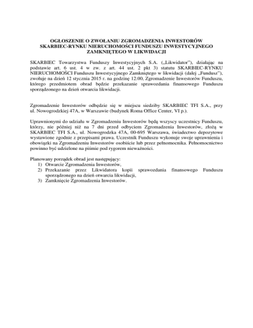 OGŁOSZENIE O ZWOŁANIU ZGROMADZENIA INWESTORÓW SKARBIEC-RYNKU NIERUCHOMOŚCI FUNDUSZU INWESTYCYJNEGO ZAMKNIĘTEGO W LIKWIDACJI SKARBIEC Towarzystwa Funduszy Inwestycyjnych S.A. („Likwidator”), działając na podstawie art. 6 ust. 4 w zw. z art. 44 ust. 2 pkt 3) statutu SKARBIEC-RYNKU NIERUCHOMOŚCI Funduszu Inwestycyjnego Zamkniętego w likwidacji (dalej „Fundusz”), zwołuje na dzień 12 stycznia 2015 r. na godzinę 12:00, Zgromadzenie Inwestorów Funduszu, którego przedmiotem obrad będzie przekazanie sprawozdania finansowego Funduszu sporządzonego na dzień otwarcia likwidacji. Zgromadzenie Inwestorów odbędzie się w miejscu siedziby SKARBIEC TFI S.A., przy ul. Nowogrodzkiej 47A, w Warszawie (budynek Roma Office Center, VI p.). Uprawnionymi do udziału w Zgromadzeniu Inwestorów będą wszyscy uczestnicy Funduszu, którzy, nie później niż na 7 dni przed odbyciem Zgromadzenia Inwestorów, złożą w SKARBIEC TFI S.A., ul. Nowogrodzka 47A, 00-695 Warszawa, świadectwo depozytowe wystawione zgodnie z przepisami prawa. Uczestnik Funduszu wykonuje swoje uprawnienia i obowiązki na Zgromadzeniu Inwestorów osobiście lub przez pełnomocnika. Pełnomocnictwo powinno być udzielone na piśmie pod rygorem nieważności. Planowany porządek obrad jest następujący: 1) Otwarcie Zgromadzenia Inwestorów, 2) Przekazanie przez Likwidatora kopii sprawozdania sporządzonego na dzień otwarcia likwidacji, 3) Zamknięcie Zgromadzenia Inwestorów. finansowego Funduszu