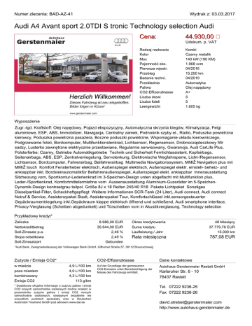 Numer zlecenia: BAD-AZ-41 Wydruk z: 03.03.2017 Audi A4 Avant sport 2.0TDI S tronic Technology selection Audi Cena: 44.930,00 Rodzaj nadwozia Kolor Moc Pojemność sko. Pierwsza rejestr. Przebieg Badanie techni. Przekładnia Paliwo CO2-Effizenzklasse Liczba drzwi Liczba foteli Leergewicht Kombi Czarny metalik 140 kW (190 KM) 1.968 ccm 04/2016 15.250 km 04/2019 Automatyka Olej napędowy A+ 5 5 1.605 kg Udokum. p. VAT Wyposażenie Zugr.-lgd. Kraftstoff: Olej napędowy, Pojazd ekspozycyjny, Automatyczna skrzynia biegów, Klimatyzacja, Felgi aluminiowe, ESP, ABS, Immobilizer, Nawigacja, Centralny zamek, Podnośnik szyby el., Radio, Poduszka powietrzna kierowcy, Poduszka powietrzna pasażera, Boczne poduszki powietrzne, Wspomaganie układu kierowniczego, Podgrzewanie foteli, Bordcomputer, Multifunktionslenkrad, Lichtsensor, Regensensor, Drobnocząsteczkowy filtr sadzy, Lusterko zewnętrzne elektrycznie przestawiane, Regularnie serwisowany, Gwarancja, Audi CarLife Plus, Polsterfarbe: Czarny, Getriebe Automatikgetriebe Technik und Sicherheit Fernlichtassistent, Kopfairbags, Seitenairbags, ABS, ESP, Zentralverriegelung, Servolenkung, Elektronische Wegfahrsperre, Licht-/Regensensor, Lichtsensor, Bordcomputer, Fahrerairbag, Beifahrerairbag Multimedia Navigationssystem, MMIŽ Navigation plus mit MMIŽ touch Komfort Fensterheber elektrisch, Außenspiegel elektrisch, Außenspiegel elektr. einstell- beheiz- und anklappbar inkl. Bordsteinautomatikfür Beifahreraußenspiegel, Außenspiegel elekt. anklappbar Innenausstattung Sitzheizung vorn, Sportkontur-Lederlenkrad im 3-Speichen-Design unten abgeflacht mit Multifunktion plus, Leder-/Sportlenkrad, Komfortmittelarmlehne vorn Aussenausstattung Aluminium-Gussräder im 5-SpeichenDynamik-Design kontrastgrau teilpol. Größe 8J x 18 Reifen 245/40 R18 Pakete Lichtpaket Sonstiges Dieselpartikel-Filter, Scheckheftgepflegt Weitere Informationen SCR-Tank (24 Liter), Audi connect, Audi connect Notruf & Service, Assistenzpaket Stadt, Assistenzpaket Tour, Komfortschlüssel inkl.sensorgesteuerter Gepäckraumentriegelung inkl.Gepäckraum klappe elektrisch öffnend und schließend, Audi smartphone interface, Privacy-Verglasung (Scheiben abgedunkelt) und Türscheiben vorn in Akustikverglasung, Technology selection Przykładowy kredyt* Zaliczka Nettokreditbetrag Soll-Zinssatz p.a. Stopa odsetkowa Soll-Zinssatzart 8.986,00 EUR 35.944,00 EUR 2,46 % 2,49 % Gebunden Okres kredytowania Suma kredytu Laufleistung / Jahr 48 Miesięcy 37.779,78 EUR 15.000 km Rata miesięczna 787,08 EUR *Audi Bank, Zweigniederlassung der Volkswagen Bank GmbH, Gifhorner Straße 57, 38112 Braunschweig Zużycie / Emisja CO2* w mieście poza miastem kombinowany Emisja CO2 4,9 L/100 km 4,0 L/100 km 4,3 L/100 km 113 g/km * Dodatkowe oficjalne informacje o zużyciu paliwa i emisji CO2 nowych samochodów osobowych można znaleźć w przewodniku zużycia paliwa i emisji CO2 nowych samochodów osobowych, dostępnym bezpłatnie we wszystkich punktach sprzedaży oraz w Deutschen Automobil Treuhand GmbH pod adresem www.dat.de CO2-Effizenzklasse Dane kontaktowe Auf der Grundlage der gemessenen CO2-Emission unter Berücksichtigung der Masse des Fahrzeugs ermittelt. Autohaus Gerstenmaier Rastatt GmbH Karlsruher Str. 6 - 10 76437 Rastatt Tel. 07222 9236-25 Fax 07222 9236-26 [email protected] http://www.autohaus-gerstenmaier.de Numer zlecenia: BAD-AZ-41 Wydruk z: 03.03.2017 Audi A4 Avant sport 2.0TDI S tronic Technology selection Audi