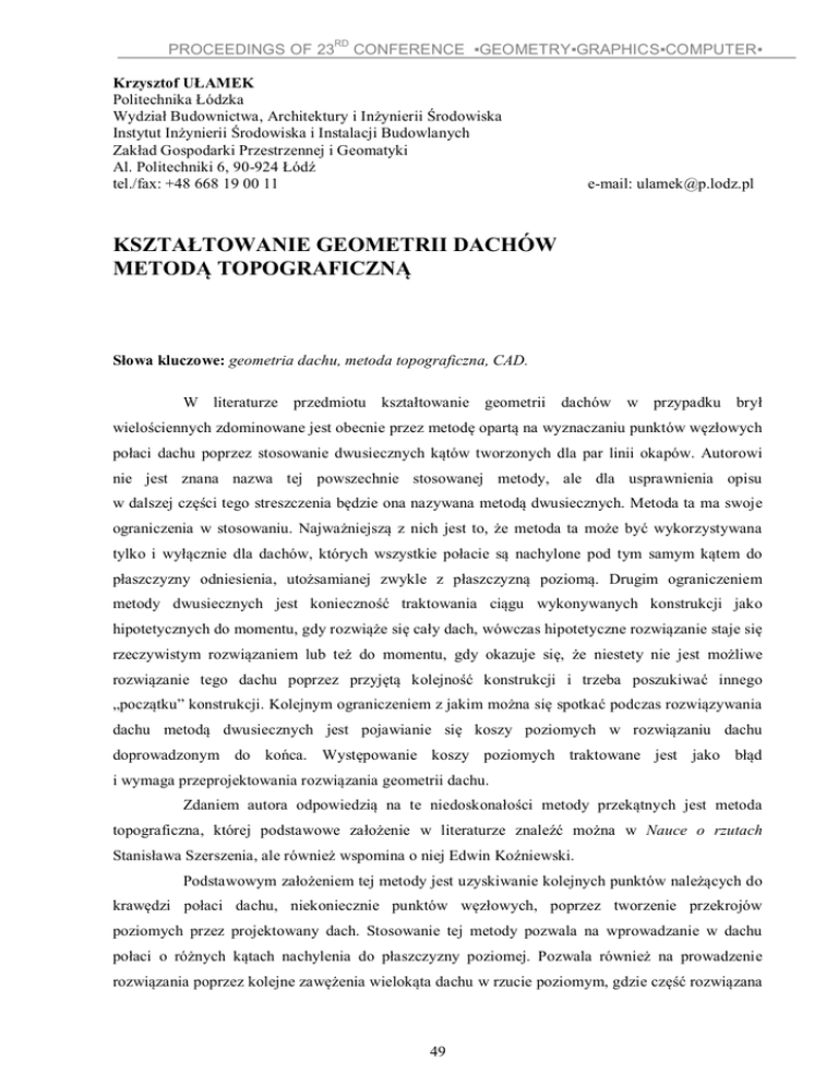 RD PROCEEDINGS OF 23 CONFERENCE ▪GEOMETRY▪GRAPHICS▪COMPUTER▪ Krzysztof UŁAMEK Politechnika Łódzka Wydział Budownictwa, Architektury i Inżynierii Środowiska Instytut Inżynierii Środowiska i Instalacji Budowlanych Zakład Gospodarki Przestrzennej i Geomatyki Al. Politechniki 6, 90-924 Łódź tel./fax: +48 668 19 00 11 e-mail: [email protected] KSZTAŁTOWANIE GEOMETRII DACHÓW METODĄ TOPOGRAFICZNĄ Słowa kluczowe: geometria dachu, metoda topograficzna, CAD. W literaturze przedmiotu kształtowanie geometrii dachów w przypadku brył wielościennych zdominowane jest obecnie przez metodę opartą na wyznaczaniu punktów węzłowych połaci dachu poprzez stosowanie dwusiecznych kątów tworzonych dla par linii okapów. Autorowi nie jest znana nazwa tej powszechnie stosowanej metody, ale dla usprawnienia opisu w dalszej części tego streszczenia będzie ona nazywana metodą dwusiecznych. Metoda ta ma swoje ograniczenia w stosowaniu. Najważniejszą z nich jest to, że metoda ta może być wykorzystywana tylko i wyłącznie dla dachów, których wszystkie połacie są nachylone pod tym samym kątem do płaszczyzny odniesienia, utożsamianej zwykle z płaszczyzną poziomą. Drugim ograniczeniem metody dwusiecznych jest konieczność traktowania ciągu wykonywanych konstrukcji jako hipotetycznych do momentu, gdy rozwiąże się cały dach, wówczas hipotetyczne rozwiązanie staje się rzeczywistym rozwiązaniem lub też do momentu, gdy okazuje się, że niestety nie jest możliwe rozwiązanie tego dachu poprzez przyjętą kolejność konstrukcji i trzeba poszukiwać innego „początku” konstrukcji. Kolejnym ograniczeniem z jakim można się spotkać podczas rozwiązywania dachu metodą dwusiecznych jest pojawianie się koszy poziomych w rozwiązaniu dachu doprowadzonym do końca. Występowanie koszy poziomych traktowane jest jako błąd i wymaga przeprojektowania rozwiązania geometrii dachu. Zdaniem autora odpowiedzią na te niedoskonałości metody przekątnych jest metoda topograficzna, której podstawowe założenie w literaturze znaleźć można w Nauce o rzutach Stanisława Szerszenia, ale również wspomina o niej Edwin Koźniewski. Podstawowym założeniem tej metody jest uzyskiwanie kolejnych punktów należących do krawędzi połaci dachu, niekoniecznie punktów węzłowych, poprzez tworzenie przekrojów poziomych przez projektowany dach. Stosowanie tej metody pozwala na wprowadzanie w dachu połaci o różnych kątach nachylenia do płaszczyzny poziomej. Pozwala również na prowadzenie rozwiązania poprzez kolejne zawężenia wielokąta dachu w rzucie poziomym, gdzie część rozwiązana 49 RD PROCEEDINGS OF 23 CONFERENCE ▪GEOMETRY▪GRAPHICS▪COMPUTER▪ w pierwszym kroku już nie zmieni się do końca rozwiązania i może być traktowana jako część ostatecznego rozwiązania. W metodzie tej nie występują również kosze poziome. Tym samym metoda topograficzna nie ma wad metody dwusiecznych, a dodatkowo łatwo na podstawie jej zasad można napisać algorytm, który, zdaniem autora, mógłby stać się częścią oprogramowania CAD. Rys. 1 Dach rozwiązany metodą topograficzną Literatura: [1] Szerszeń St.: Nauka o rzutach, PWN, Warszawa 1978. [2] Koźniewski E.: Geometria dachów, teoria i zastosowanie, Wydawnictwo Politechniki Białostockiej, Białystok 2007. 50