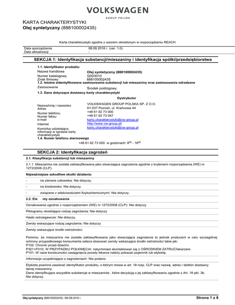 KARTA CHARAKTERYSTYKI Olej syntetyczny (888100002435) Karta charakterystyki zgodna z wzorem określonym w rozporządzeniu REACH Data sporządzenia Data aktualizacji 08.09.2016 r. (ver. 1.0) - SEKCJA 1: Identyfikacja substancji/mieszaniny i identyfikacja spółki/przedsiębiorstwa 1.1. Identyfikator produktu Nazwa handlowa Numer katalogowy Znak firmowy Olej syntetyczny (888100002435) G003010 888100002435 1.2. Istotne zidentyfikowane zastosowania substancji lub mieszaniny oraz zastosowania odradzane Zastosowanie Środek poślizgowy. 1.3. Dane dotyczące dostawcy karty charakterystyki Dystrybutor VOLKSWAGEN GROUP POLSKA SP. Z O.O. Nazwa/imię i nazwisko 61-037 Poznań, ul. Krańcowa 44 Adres +48 61 62 73 000 Numer telefonu +48 61 62 73 047 Numer faksu e-mail [email protected] http://www.vw-group.pl/ Internet [email protected] Komórka udzielająca informacji w sprawie karty charakterystyki 1.4. Numer telefonu alarmowego +48 61 62 73 000 w godzinach: 800 - 1600 SEKCJA 2: Identyfikacja zagrożeń 2.1. Klasyfikacja substancji lub mieszaniny 2.1.1. Mieszanina nie została zaklasyfikowana jako stwarzająca zagrożenia zgodnie z kryteriami rozporządzenia (WE) nr 1272/2008 (CLP). Najważniejsze szkodliwe skutki działania: - na zdrowie człowieka: Nie dotyczy. - na środowisko: Nie dotyczy. - związane z właściwościami fizykochemicznymi: Nie dotyczy. 2.2. Ele nty oznakowania Oznakowanie zgodnie z rozporządzeniem (WE) nr 1272/2008 (CLP): Nie dotyczy Piktogramy określające rodzaj zagrożenia: Nie dotyczy Hasło ostrzegawcze: Nie dotyczy. Zwroty wskazujące rodzaj zagrożenia: Nie dotyczy Zwroty wskazujące środki ostrożności: Pomimo, że mieszanina nie została zaklasyfikowana jako stwarzająca zagrożenia to jednak producent w celu szczególnej ochrony przypadkowego konsumenta zaleca stosować zwroty wskazujące środki ostrożności takie jak: P102: Chronić przed dziećmi. P301+P310: W PRZYPADKU POŁKNIĘCIA: natychmiast skontaktować się z OŚRODKIEM ZATRUĆ/lekarzem. P101: W razie konieczności zasięgnięcia porady lekarza należy pokazać pojemnik lub etykietę. Informacje uzupełniające o zagrożeniach: Nie podano Etykieta powinna zawierać identyfikator produktu, o którym mowa w art. 18 rozp. CLP oraz nazwę, adres i telefon dostawcy danej mieszaniny. Dane identyfikujące wszystkie substancje w mieszaninie , które decydują o jej zaklasyfikowaniu zgodnie z Art. 18 pkt. 3b. Nie dotyczy. Olej syntetyczny (888100002435): 08.09.2016 r. Strona 1 z 8 KARTA CHARAKTERYSTYKI Olej syntetyczny (888100002435) SEKCJA 2: Identyfikacja zagrożeń 2.3. Inne zagrożenia 2.3.1 Ocena PBT lub vPvB zgodnie z zał. XIII REACH – substancje zawarte w mieszaninie nie zostały zakwalifikowane jako PBT lub vPvB. Kryteria PBT i vPvB zawarte są w Aneksie XIII REACH. 2.3.2. Informacje dotyczące innych zagrożeń, które nie powodują zaklasyfikowania, a które mogą przyczynić się do ogólnych zagrożeń powodowanych przez mieszaninę. Nie podano SEKCJA 3: Skład/informacja o składnikach 3.1. Substancje 3.2. Mieszaniny Opis ogólny: Mieszanina zawiera syntetyczne środki poślizgowe, dodatki niezaklasyfikowane jako stwarzające zagrożenie zgodnie z kryteriami rozporządzenia (WE) nr 1272/2008 (CLP). Spis substancji w mieszaninie:. a) Substancje stanowiące zagrożenie dla zdrowia lub środowiska w rozumieniu rozporządzenia (WE) nr 1272/2008 (CLP). Mieszanina nie zawiera ww. substancji. b) Substancje, dla których istnieją wspólnotowe najwyższe dopuszczalne stężenia w środowisku pracy, które nie zostały zawarte w lit. a): Mieszanina nie zawiera ww. substancji. c) substancje trwałe, wykazujące zdolność do bioakumulacji i toksyczne lub bardzo trwałe i wykazujące bardzo dużą zdolność do bioakumulacji zgodnie z kryteriami zawartymi w załączniku XIII lub substancje zawarte w wykazie sporządzonym zgodnie z art. 59 ust. 1 z powodów innych niż zagrożenia, o których mowa w lit. a): W mieszaninie nie występują ww. substancje. Objaśnienia stosowanych skrótów podano w sekcji 16. SEKCJA 4: Środki pierwszej pomocy 4.1. Opis środków pierwszej pomocy Narażenie przez drogi oddechowe W przypadku narażenia na lotne produkty rozkładu lub przypadkowego wdychania mieszaniny wyprowadzić lub wynieść poszkodowanego z zatrutej atmosfery na świeże powietrze. W przypadku utrzymujących się dolegliwości wezwać lekarza. W przypadku trudności z oddychaniem zastosować sztuczne oddychanie. Zapewnić poszkodowanemu ciepło i warunki do odpoczynku. Kontakt ze skórą Niezwłocznie zdjąć zanieczyszczoną odzież. Umyć skórę dużą ilością wody najlepiej bieżącej. Jeśli wystąpi podrażnienie skonsultować się z lekarzem. Kontakt z oczami Usunąć szkła kontaktowe (jeżeli są noszone). Natychmiast przemywać oczy dużą ilością letniej wody, przez co najmniej 15 min. (przy odwiniętych powiekach), unikać silnego strumienia wody ze względu na ryzyko uszkodzenia rogówki, w przypadku zanieczyszczenia jednego oka, chronić w trakcie przemywania drugie oko przed zanieczyszczeniem. Jeśli podrażnienie utrzymuje się zapewnić poszkodowanemu konsultację okulistyczną. Osoby narażone na skażenie oczu powinny być pouczone o konieczności i sposobie ich natychmiastowego płukania. Narażenie przez przewód pokarmowy Jeżeli poszkodowany jest całkowicie przytomny należy dokładnie wypłukać usta wodą. Nie wywoływać wymiotów. Wymiotującą osobę leżącą na plecach, należy ułożyć w pozycji bocznej ustalonej. Nie podawać do picia niczego osobie nieprzytomnej!!! Zażyć węgiel aktywny. Zapewnić poszkodowanemu ciepło i warunki do odpoczynku. Nie prowokować wymiotów. Przewieźć zatrutego do szpitala w celu obserwacji i ewentualnego leczenia. Pokazać kartę charakterystyki, opakowanie lub etykietę. 4.2. Najważniejsze ostre i opóźnione objawy oraz skutki narażenia Produkt nie stwarza zagrożenia dla zdrowia jeśli jest stosowany zgodnie z przeznaczeniem. Jedn