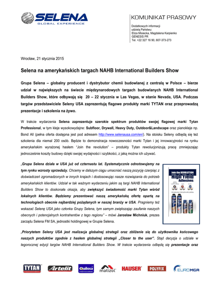 Dodatkowych informacji udzielą Państwu: Eliza Misiecka, Magdalena Karpienko GENESIS PR Tel. +22 327 16 90, 607-373-273 Wrocław, 21 stycznia 2015 Selena na amerykańskich targach NAHB International Builders Show Grupa Selena – globalny producent i dystrybutor chemii budowlanej z centralą w Polsce – bierze udział w największych na świecie międzynarodowych targach budowlanych NAHB International Builders Show, które odbywają się 20 – 22 stycznia w Las Vegas, w stanie Nevada, USA. Podczas targów przedstawiciele Seleny USA zaprezentują flagowe produkty marki TYTAN oraz przeprowadzą prezentacje i szkolenia na żywo. W trakcie wydarzenia Selena zaprezentuje szerokie spektrum produktów swojej flagowej marki Tytan Professional, w tym kleje wysokowydajne: Subfloor, Drywall, Heavy Duty, Outdoor&Landscape oraz pianokleje np. Bond All (pełna oferta dostępna jest pod adresem http://www.selenausa.com/en/). Na stoisku Seleny odbędą się też szkolenia dla niemal 200 osób. Będzie to demonstracja nowoczesności marki Tytan i jej innowacyjności na rynku amerykańskim wyrażonej hasłem “Join the revolution” – produkty Tytan rewolucjonizują pracę zmniejszając jednocześnie koszty budowy dzięki swojej wydajności i szybkości, z jaką można ich używać. „Grupa Selena działa w USA już od czternastu lat. Systematycznie odnotowujemy na tym rynku wzrosty sprzedaży. Chcemy w dalszym ciągu umacniać naszą pozycję czerpiąc z doświadczeń zgromadzonych w innych krajach i dostosowując nasze rozwiązania do potrzeb amerykańskich klientów. Udział w tak ważnym wydarzeniu jakim są targi NAHB International Builders Show to doskonała okazja, aby zwiększyć świadomość marki Tytan wśród lokalnych klientów. Będziemy prezentować naszą amerykańską ofertę opartą na technologiach obecnie najbardziej pożądanych w naszej branży w USA. Pragniemy też wskazać Selenę USA jako członka Grupy Selena, tym samym zwiększając zaufanie naszych obecnych i potencjalnych kontrahentów z tego regionu” – mówi Jarosław Michniuk, prezes zarządu Selena FM SA, jednostki holdingowej w Grupie Selena. „Priorytetem Seleny USA jest realizacja globalnej strategii oraz zbliżenie się do użytkownika końcowego naszych produktów zgodnie z hasłem globalnej strategii „Closer to the user”. Stąd decyzja o udziale w tegorocznej edycji targów NAHB International Builders Show. W trakcie wydarzenia odbędą się prezentacje oraz Dodatkowych informacji udzielą Państwu: Eliza Misiecka, Magdalena Karpienko GENESIS PR Tel. +22 327 16 90, 607-373-273 szkolenia na żywo umożliwiające zgromadzonym gościom dokładne zapoznanie się z zaletami oraz zastosowaniem poszczególnych produktów marki Tytan. Zapraszamy naszych klientów, aby dołączyli do rewolucji w sposobie wykonywania prac budowlanych, jaką niosą nasze nowe produkty. Stąd hasło Tytana w USA: „Join the revolution”. Nawiązujemy w ten sposób do nowoczesności, wysokiej jakości oraz praktyczności produktów marki Tytan przy jednoczesnym wskazaniu zalet przemawiających do profesjonalistów branży budowlanej, takich jak: szybkość, wysoka wydajność i mniejsze koszty” – mówi Wade Rector, prezes spółki Selena USA. Targi NAHB International Builders Show – organizowane przez National Association of Home Builders – to największe wydarzenie targowe poświęcone budownictwu mieszkaniowemu oraz komercyjnemu na świecie. Wydarzenie rokrocznie cieszy się ogromną popularnością – targi odwiedza średnio ponad 60 tysięcy profesjonalistów z około 100 krajów. Informacje dodatkowe: Grupa Selena to globalny producent i dystrybutor chemii budowlanej. Selena oferuje szeroką gamę produktów przeznaczonych zarówno dla profesjonalnych wykonawców, jak i użytkowników indywidualnych – główne marki to TYTAN, ARTELIT oraz hiszpańska QUILOSA. Selena jest jednym z trzech największych światowych producentów piany poliuretanowej używanej do montażu okien i drzwi. Grupa w swojej ofercie posiada piany, uszczelniacze, kleje, produkty do hydroizolacji, systemy ociepleń, zamocowania oraz produkty komplementarne. W skład Grupy wchodzi 30 spółek w 18 krajach na całym świecie. Zakłady produkcyjne Seleny są zlokalizowane w Polsce, Brazylii, Korei, Chinach, Rumunii, Turcji oraz w Hiszpanii. Globalne doświadczenia zdobywane na wielu różnych rynkach pozwalają Grupie Selena szybko się rozwijać. Dzięki nim Selena staje się firmą innowacyjną i kreuje nowe rozwiązania dostosowane do potrzeb użytkowników. Grupa Selena była wielokrotnie nagradzana w najbardziej prestiżowych rankingach. Otrzymała m.in. tytuły: Diamentu Forbesa oraz Perły Polskiej Gospodarki. Najwyższa jakość produktów Grupy Selena oraz ich nowoczesność cieszą się uznaniem partnerów i klientów firmy, o czym mogą świadczyć liczne nagrody, jakimi spółka jest honorowana. Od kwietnia 2008 akcje spółki holdingowej Grupy – Selena FM SA – notowane są na Giełdzie Papierów Wartościowych w Warszawie. Więcej informacji o spółce na www.selena.com