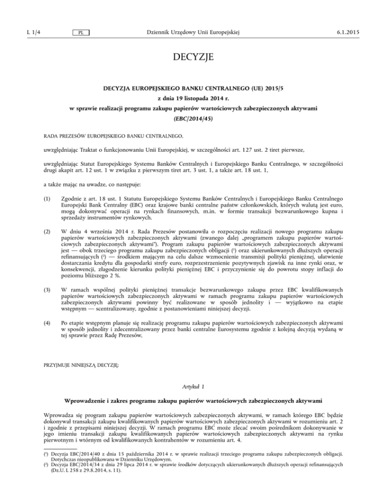 L 1/4 Dziennik Urzędowy Unii Europejskiej PL 6.1.2015 DECYZJE DECYZJA EUROPEJSKIEGO BANKU CENTRALNEGO (UE) 2015/5 z dnia 19 listopada 2014 r. w sprawie realizacji programu zakupu papierów wartościowych zabezpieczonych aktywami (EBC/2014/45) RADA PREZESÓW EUROPEJSKIEGO BANKU CENTRALNEGO, uwzględniając Traktat o funkcjonowaniu Unii Europejskiej, w szczególności art. 127 ust. 2 tiret pierwsze, uwzględniając Statut Europejskiego Systemu Banków Centralnych i Europejskiego Banku Centralnego, w szczególności drugi akapit art. 12 ust. 1 w związku z pierwszym tiret art. 3 ust. 1, a także art. 18 ust. 1, a także mając na uwadze, co następuje: (1) Zgodnie z art. 18 ust. 1 Statutu Europejskiego Systemu Banków Centralnych i Europejskiego Banku Centralnego Europejski Bank Centralny (EBC) oraz krajowe banki centralne państw członkowskich, których walutą jest euro, mogą dokonywać operacji na rynkach finansowych, m.in. w formie transakcji bezwarunkowego kupna i sprzedaży instrumentów rynkowych. (2) W dniu 4 września 2014 r. Rada Prezesów postanowiła o rozpoczęciu realizacji nowego programu zakupu papierów wartościowych zabezpieczonych aktywami (zwanego dalej „programem zakupu papierów wartoś ciowych zabezpieczonych aktywami”). Program zakupu papierów wartościowych zabezpieczonych aktywami jest — obok trzeciego programu zakupu zabezpieczonych obligacji (1) oraz ukierunkowanych dłuższych operacji refinansujących (2) — środkiem mającym na celu dalsze wzmocnienie transmisji polityki pieniężnej, ułatwienie dostarczania kredytu dla gospodarki strefy euro, rozprzestrzenienie pozytywnych zjawisk na inne rynki oraz, w konsekwencji, złagodzenie kierunku polityki pieniężnej EBC i przyczynienie się do powrotu stopy inflacji do poziomu bliższego 2 %. (3) W ramach wspólnej polityki pieniężnej transakcje bezwarunkowego zakupu przez EBC kwalifikowanych papierów wartościowych zabezpieczonych aktywami w ramach programu zakupu papierów wartościowych zabezpieczonych aktywami powinny być realizowane w sposób jednolity i — wyjątkowo na etapie wstępnym — scentralizowany, zgodnie z postanowieniami niniejszej decyzji. (4) Po etapie wstępnym planuje się realizację programu zakupu papierów wartościowych zabezpieczonych aktywami w sposób jednolity i zdecentralizowany przez banki centralne Eurosystemu zgodnie z kolejną decyzją wydaną w tej sprawie przez Radę Prezesów, PRZYJMUJE NINIEJSZĄ DECYZJĘ: Artykuł 1 Wprowadzenie i zakres programu zakupu papierów wartościowych zabezpieczonych aktywami Wprowadza się program zakupu papierów wartościowych zabezpieczonych aktywami, w ramach którego EBC będzie dokonywał transakcji zakupu kwalifikowanych papierów wartościowych zabezpieczonych aktywami w rozumieniu art. 2 i zgodnie z przepisami niniejszej decyzji. W ramach programu EBC może zlecać swoim pośrednikom dokonywanie w jego imieniu transakcji zakupu kwalifikowanych papierów wartościowych zabezpieczonych aktywami na rynku pierwotnym i wtórnym od kwalifikowanych kontrahentów w rozumieniu art. 4. (1) Decyzja EBC/2014/40 z dnia 15 października 2014 r. w sprawie realizacji trzeciego programu zakupu zabezpieczonych obligacji. Dotychczas nieopublikowana w Dzienniku Urzędowym. (2) Decyzja EBC/2014/34 z dnia 29 lipca 2014 r. w sprawie środków dotyczących ukierunkowanych dłuższych operacji refinansujących (Dz.U. L 258 z 29.8.2014, s. 11). 6.1.2015 PL Dziennik Urzędowy Unii Europejskiej Artykuł 2 Kryteria kwalifikacji na potrzeby transakcji bezwarunkowego zakupu papierów wartościowych zabezpie czonych aktywami Papiery wartościowe zabezpieczone aktywami kwalifikują się na potrzeby transakcji bezwarunkowego zakupu realizo wanych w ramach programu zakupu papierów wartościowych zabezpieczonych aktywami, o ile spełniają następujące kryteria kwalifikacji. 1) Papiery wartościowe zabezpieczone aktywami mają ocenę jakości kredytowej co najmniej na poziomie stopnia 3 jakości kredytowej w zharmonizowanej skali Eurosystemu (1), wyrażoną w postaci przynajmniej dwóch publicznych ratingów kredytowych dostarczonych przez dwie zewnętrzne instytucje oceny wiarygodności kredytowej (ECAI) zaakceptowane zgodnie z ramowymi zasadami oceny kredytowej w Eurosystemie (ECAF). 2) W innych przypadkach niż wskazane w punkcie 1, papiery wartościowe zabezpieczone aktywami spełniają kryteria kwalifikacji stosowane w odniesieniu do papierów wartościowych zabezpieczonych aktywami przedstawianych jako zabezpieczenie operacji polityki pieniężnej Eurosystemu, określone w załączniku I do wytycznych EBC/2011/14 (2) (zmienionych wytycznymi EBC/2012/25 (3) oraz wytycznymi EBC/2014/10 (4)) oraz w decyzji EBC/2013/35 (5). 3) Papiery wartościowe zabezpieczone aktywami, które nie mają oceny jakości kredytowej co najmniej na poziomie stopnia 2 jakości kredytowej w zharmonizowanej skali ratingowej Eurosystemu, wyrażonej w postaci przynajmniej dwóch publicznych ratingów kredytowych dostarczonych przez dwie zewnętrzne instytucje oceny wiarygodności kredytowej zaakceptowane zgodnie z ramowymi zasadami oceny kredytowej w Eurosystemie, muszą — obok wymogów z pkt 2 — spełnić kryteria kwalifikacji stosowane w odniesieniu do papierów wartościowych zabezpie czonych aktywami przedstawianych jako zabezpieczenie operacji polityki pieniężnej Eurosystemu określone w art. 3 wytycznych EBC/2014/31 (6). 4) Nie mniej niż 90 % dłużników aktywów wywołujących przepływ środków pieniężnych stanowiących zabezpieczenie papierów wartościowych zabezpieczonych aktywami zostało sklasyfikowanych jako przedsiębiorstwa niefinansowe (7) z sektora prywatnego lub osoby fizyczne, przy czym procent ten oblicza się w odniesieniu do niespłaconej kwoty głównej aktywów wywołujących przepływ środków pieniężnych przypadającej na takich dłużników. 5) Nie mniej niż 95 %: a) niespłaconej kwoty głównej aktywów wywołujących przepływ środ