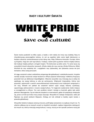 RASY I KULTURY ŚWIATA Świat można podzielić na kilka części, a każda z nich należy do innej rasy ludzkiej. Rasy te charakteryzują poszczególne kultury, te zaś są zupełnie takie same bądź identyczne w każdym obszarze zamieszkiwanym przez daną rasę. Więc Północna Ameryka i Europa, które są Aryjskie, mają ten sam typ kultury i tradycji, nawet jeśli są pewne różnice między kultury lub tradycji między jednym a drugim krajem. Tła kulturowe są takie same. To samo tyczy się wszystkich innych obszarów rasowych. Afryka należy do rasy czarnej, Afryka Północna i Bliski Wschód do rasy arabskiej itd. z wyjątkiem rasy żydowskiej, ale żydowska zaraza nie jest tematem, który tutaj poruszam. W ciągu ostatnich stuleci widzieliśmy ekspansję idei globalizacji i wielokulturowości. Aryjskie narody zaczęły rozszerzać swoje terytoria w Afryce poprzez kolonizację i niektórzy Aryjczycy pozostali tam po deklaracji niepodległości. Obecnie wszystkie rasy mieszają się ze sobią nie opiekując się swoją kulturą w celu jej zachowania. Większość Aryjczyków, którzy tam pozostali, zapomnieli o swoich uwarunkowaniach kulturowych oraz tradycjach związanych z ich rasą. Wnieśli oni jednak do ostatnich kolonii część swojej własnej cywilizacji, zapominając jednocześnie o reszcie swojej kultury. To tragicznie wydarzenie miało miejsce w szczególności w Afryce. Ten sam problem istniał i istnieje w Australii, gdzie żyło wiele plemion Aborygenów. Są oni obecnie skupieni w rezerwatach, gdzie ich populacja zmiejszyła się, przez co krok po kroku tracą swoje zwyczaje. Wszystkie te rodzaje mniejszości, takie jak Pigmeje czy przed wiekami Majowie. Znikają oni lub zniknęli w każdej części świata z powodu globalizacji. Wszystkie lokalne tradycje zostaną stracone, jeśli będą nastawione na wpływy innych ras. To właśnie odbywa się na naszych oczach w Aryjskich narodach: napływ imigrantów należących do innych ras, którzy mieszają swoją kulturę z naszą, niszczą w ten sposób zarówno naszą jak 1 i swoją kulturę. Fakt ten jest widoczny w Stanach Zjednoczonych Ameryki, gdzie wpływ murzynów i latynosów jest bardzo silny. Imigranci są częścią swoich własnych krajów, lecz pamiętają o swoich tradycjach, uważając siebie w tym samym czasie za prześladowane mniejszości, bo nie mogą znaleźć pracy czy nie potrafią zrozumieć kultury kraju w którym żyją. Więc, próbują oni narzucić swój sposób myślenia innej rasie- w tym przypadku Rasie Aryjskiej- wypaczając jej kulturę. Faktem jest, że nikt nie może temu zaprzeczyć. Wzajemne oddziaływanie jednej rasy na drugą jest oczywiste. Prowadzi to z kolei do nieuchronnego upadku wszystkich ras świata. Ta ogólna tendecja musi się odwrócić. Aby osiągnąć ten cel, którym jest zapobiegnięcie upadku naszej rasy, musimy walczyć z multikulturowością i zwolennikami mieszania się ras. Imigracja musi być więc ograniczona, a każda część świata, w którym rasa jest mocno skoncentrowana musi być w pewien sposób "odcięty" od innych. Tylko dzięki zaprzestaniu mieszania się ras na całym świecie ludzie będą mogli zachować kulturę i czystość rasową. Jest to prawda nie tylko dla Rasy Aryjskiej, ale także dla wszystkich innych ras- z wyjątkiem Żydów. Wszystkie kraje, które łączy ta sama rasa powinny być zjednoczone i stać na straży własnych tradycji, kultury i rasy. Idąc tym tokiem myslenia, Europa i Północna Ameryka powinny być złączone dla wielkiej Aryjskiej Rasy; wszystkie kraje Afrykańskie powinny być zunifikowane dla rasy czarnej itd. Mulikulturalizm jest niczym więcej jak utopią, która nie ma prawa istnieć w rzeczywistości. Rasy nie mogą się mieszać, poniewać ich kultury są od siebie odmienne: mają różne sposoby myślenia, tak samo tradycje. Między nimi(rasami) zawsze będą istnieć konflikty, jednak nie przyczyni się to do globalnego zaniku ras. W ludziach należy rozbudzać rasową tożsamość. Ale jak tylko ktoś spróbuje uczyć takiego toku myślenia, jest on traktowany jako jadowity rasista, który próbuje zniszczyć ludzkość zamiast nieść nadzieję całemu światu. Mamy długą walkę przed sobą. Dla globalnego porządku musimy edukować innych i przekonywać ludzi do przyjęcia naszego sposobu widzenia. Będzie to bardzo trudne do osiągnięcia, lecz musimy walczyć o nasze rasowe interesy i uchronić świat od wielokulturowości. Walczymy dla zachowania naszej krwi i naszych zwyczajów. Musi nam się udać dla dobra ludzkości! 2 Lilith88 Tłumaczenie: W. 3
