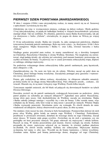 Ina Korczewska PIERWSZY DZIEN POWSTANIA (WARSZAWSKIEGO) W dniu 1 sierpnia (1944r.) rano otrzymałyśmy rozkaz, że mamy stawić się na ul. Sosnowej z apteczkami i żywnością na trzy dni. Zebrałyśmy się więc w wyznaczonym miejscu, czekając na dalsze rozkazy. Około godziny 13-tej zdecydowałyśmy, że pójdę do Jadłodajni Jarskiej w Alejach Jerozolimskich i przyniosę stamtąd obiad. Tak też zrobiłam. Po obiedzie, patrolowa nasza Baśka Kostrzewianka, tak jak i ja drużynowa z hufca „Ochota”, oświadczyła, że pogna do domu na Wilczą po więcej tłuszczu. O 16-tej usłyszałyśmy strzały. Baśka nie wracała. Ja, jako zastępczyni patrolowej, objęłam tymczasową komendę patrolu sanitarnego. Było nas teraz cztery - ja, drużynowa 16-tki i dwie moje zastępowe: Majka Krassowska i Baśka C. oraz Lilka, również harcerka z hufca „Ochota”. Niedługo goniec przyniósł nam rozkaz, że mamy zameldować się u dowódcy kompanii na Chmielnej. Ruszyłyśmy Chmielną w stronę Wielkiej. Strzelano. Nie mogłyśmy się zorientować, skąd padają strzały, ale szłyśmy już ostrożniej, pod murami kamienic, przesuwając się szybko od bramy do bramy. Tu pierwszy raz w czasie powstania zobaczyłyśmy trupa, dopiero co zabitego, młodego mężczyzny. Na podwórzu wskazanego domu zobaczyłyśmy kilka patroli sanitarnych, parę łączniczek, dużo chłopców z AK. Zameldowałyśmy się. Na razie nie było nic do roboty. Wkrótce zaczął się palić dom na Chmielnej, przez którego bramę weszłyśmy. Zaczęłyśmy pomagać przy gaszeniu i wynoszeniu rzeczy mieszkańców. Potem, gdy czekałyśmy na dalsze rozkazy, słyszałyśmy, że chłopcom zabrakło amunicji, po którą trzeba iść na druga stronę Marszałkowskiej. Paru chłopców poszło... czekano... nie wracali. Okazało się, że są ranni i leżą przy rogu Wielkiej. Poszło kilku innych. Tymczasem zapadał zmierzch, ale bił blask od palących się drewnianych baraków na tyłach Dworca Głównego. Dowódca zwrócił się do patroli sanitarnych, czekających bezczynnie na podwórzu: „który patrol pójdzie na ochotnika po rannych chłopców?” Zgłosiłam nasz patrol. Ruszyłyśmy, niosąc dwie pary noszy. Gdy dochodziłyśmy do Wielkiej, zaczęła się strzelanina. Majka i Baśka zabrały jednego rannego i wycofały się z nim do bramy. Lilka została ranna, więc cofnęłam się do bramy, żeby ktoś wziął ze mną nosze i poszedł po rannych. Właśnie Majka i Baśka wyruszały ponownie. Strzelanina znów się wzmogła. Po chwili dotarła do mnie wiadomość od chłopców, którzy obserwowali to przez okno, że obie są ranne. Nie miałam z kim ruszyć ku nim. Zresztą to było beznadziejne. Postanowiłam dotrzeć do nich przez ulicę Wielką, gdzie leżały na samym rogu Wielkiej i Chmielnej. Podwórkami, przebitymi w piwnicach otworami, dotarłam do trzeciego domu na rogu Chmielnej. Zaczął mżyć deszcz. W bramie stała grupa cywilów. Zwróciłam się do nich z pytaniem, czy nie pomógłby mi ktoś przynieść rannych. Od grupy oderwali się mężczyzna i młoda kobieta. Ruszyli za mną. W mroku posuwaliśmy pod murem. Znowu rozległy się strzały. Kobieta przypadła do ziemi, mężczyzna schował się za latarnię. Ja również padłam plackiem na chodnik. Po chwili strzały umilkły. Kobiety nie zobaczyłam. Mężczyzna skulony za latarnią, był ranny w obie ręce. Wycofał się do bramy kamienicy, z której wyszliśmy. Zostałam sama. Byłam pod bramą parterowego domu, drugiego od rogu Chmielnej. Przy oknie wystawowym sklepu leżała ranna sanitariuszka. Wsunęłam się w bramę tego domu, na podwórzu z trudem odszukałam właściciela sklepu i zażądałam, żeby wpuścił mnie przez sklep i podniósł kratę, gdyż tuż obok leży ranna. Właściciel nie chciał. Bał się. Powiedział, że następnego dnia Niemcy go za to rozstrzelają. Wreszcie, nie pamiętam już jak, udało mi się skłonić go do tego. W rannej i nieprzytomnej dziewczynie poznałam znaną mi z widzenia harcerkę. Z trudem zaczęłam przesuwać ją bliżej otworu drzwi sklepu, gdyż była to dziewczyna tęga i ciężka. Znów zaczęto do nas strzelać, być może wtedy śmiertelna kula ją zabiła. Gdy wreszcie wciągnęłam ją do sklepu - nie żyła. Do dziewcząt na rogu ulicy było daleko - długość dwóch domów, tego parterowego i wysokiego kilkupiętrowego szarego budynku szkoły. Muszę tam dotrzeć. Nogi ciężyły mi jak ołów. Strach... Nie miałam już nikogo do pomocy i nikogo nie szukałam. Ledwie wlokąc za sobą ociężałe nogi, czołgając się po mokrym chodniku przy samym murze domu, posuwałam się zwolna ku rannym. Znów zaczęto strzelać. Starałam się wtulić w mur. Nade mną kule biły w ścianę, sypały się tynk i odpryski cegieł. Przez cały czas nie mogłam zrozumieć, skąd padają kule. Przecież z dworca, który był w rękach Niemców byłam teraz niewidoczna. A jednak ktoś mnie dobrze widzi i chyba z dość bliska, bo kule omijają mnie tylko o centymetry, choć jest już prawie zupełnie ciemno. Wreszcie dotarłam do Majki. Leżała za kupą gruzów pod murem. Powoli uniosłam jej bluzę i dostałam się do rany. Nie krwawiła. Był to niewielki owalny otwór. Założyłam opatrunek i obandażowałam. Teraz próbowałam ciągnąć Majkę ku bramie na Wielkiej. Trzeba było ją przeciągnąć ku krawędzi chodnika, żeby ominąć kupę gruzów lub przeciągnąć ją przez te gruzy. Zamarłyśmy bez ruchu. Zaczęto strzelać. Gdy ucichło - znów usiłowałam ciągnąć Majkę. Nie mogłam dać rady. Majka, widząc to, powiedziała: „Ineczko sama nie dasz rady, a ja nie mogę ci nic pomóc. Musisz iść po kogoś”. Z ciężkim sercem poczołgałam się do bramy, obiecując Maji wrócić po nią jak najszybciej. Ciągle mżył deszcz. Wreszcie dotarłam do komendy i zameldowałam. Komendant rozkazał „chłopcom” dotrzeć do budynku szkolnego i tam przez okienko piwnicy wciągn