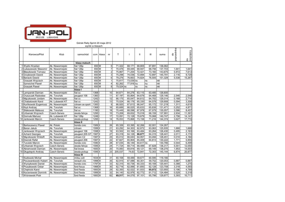 Klub 1 2 3 4 5 Wyzlic Krystian Łukaszewski Sławomir Błaszkowski Tomasz Grzybowski Dawid Banacki Dawid Graszek Wojciech Szmeichel Paweł Graszek Paweł Ak. Nowomiejski Ak. Nowomiejski Ak. Nowomiejski Ak. Nowomiejski Ak. Nowomiejski Ak. Nowomiejski Ak. Nowomiejski Ak. Nowomiejski 1 2 3 4 5 6 7 8 9 10 Lamparski Damian Oryszczak Radosław Mączkowski Jordam Chabatowski Karol Kurlikowski Eugeniusz Ksyt Andrzej Siłakowski Mateusz Urbaniak Wojciech Gomuła Mariusz Jankowski Marcin Ak. Nowomiejski Ak. Toruński Ak. Nowomiejski Ak. Lubawski KT Ak. Nowomiejski Ak. Toruński Ak. Toruński Czech-Serwis Ak. Lubawski KT Czech-Serwis 1 2 3 4 5 6 7 8 9 10 Bartoszewicz Paweł Baran Jakub Jankowski Wojciech Achard Georges Mączkowski WiktoR Dworak Rafał Turulski Marcin Urbaniak Wojciech Abramowski Damian Długokęcki Andrzej Ak. Polski Ak. Toruński Ak. Nowomiejski Ak. Toruński Ak. Nowomiejski Ak. Nowomiejski Ak. Nowomiejski Czech-Serwis Ak. Nowomiejski Czech-Serwis Kozłowski Michał Poczwardowski Hubert Wyrzykowski Daniel Prusakowski Oskar Chętnicki Karol Kocieniewski Dominik Wiśniewski Piotr Ak. Nowomiejski Ak. Toruński Ak. Nowomiejski Ak. Nowomiejski Ak. Nowomiejski Ak. Nowomiejski 1 2 3 4 5 6 7 samochód klasa maluch fiat 126p fiat 126p fiat 126p fiat 126p fiat 126p fiat 126p fiat 126p fiat 126p klasa I fiat sc peugeot 106 fiat cc fiat cc citroen ax sport fiat sc fiat sc skoda felicja fiat 126p skoda pickup klasa II honda civic citroen peugeot 106 peugeot 205 GT citroen C2 peugeot 206 honda civic skoda felicja fiat brava skoda pickup klasa III mitsu colt renault clio honda civic ford focus ford fiesta ford fiesta ford fiesta ccm klasa nr T 650 650 650 650 650 650 650 650 M M M M M M M M 5 7 2 3 6 1 4 8 1368 1360 1242 1242 1300 1368 1190 1295 1246 1295 I I I I I I I I I I 1589 1599 1598 1587 1587 1587 1590 1595 1600 1595 1834 1998 1797 1988 1800 1999 1800 I II III suma 71,322 68,171 68,805 70,476 69,445 68,947 75,867 71,254 72,421 75,298 74,036 72,894 79,276 76,663 74,824 70,817 73,039 ns ns 82,262 77,916 nu nu 79,524 ns ns ns 67,891 68,756 73,160 72,897 76,505 136,062 137,703 143,675 145,791 151,329 nkl nkl nkl 10 11 12 13 9 16 18 15 17 14 64,671 67,197 66,175 70,024 66,920 65,689 70,449 73,208 72,091 76,053 64,276 65,864 65,047 66,176 67,613 66,025 68,596 69,832 72,128 75,868 63,115 64,678 64,612 65,330 66,047 65,633 67,978 70,018 70,679 73,158 63,485 64,468 64,702 64,578 65,172 65,838 67,079 68,159 70,068 71,216 II II II II II II II II II II 26 21 19 27 25 22 28 24 20 23 65,326 63,292 63,502 63,318 65,012 67,827 67,035 71,724 70,083 205,037 63,395 64,303 63,166 64,126 66,043 65,904 66,149 68,714 69,816 74,63 III III III III III III III 31 35 33 30 29 32 82 60,108 62,915 62,315 62,716 62,350 64,140 69,517 59,489 67,088 60,736 62,066 62,022 62,976 64,079 do zwycięzcy Kierowca/Pilot do poprzednika Górski Rally Sprint 20 maja 2012 wyniki w klasach 1,641 5,972 2,116 5,538 1,641 7,613 9,729 15,267 126,600 129,146 129,314 129,908 131,219 131,471 135,057 137,991 140,747 144,374 2,546 0,168 0,594 1,311 0,252 3,586 2,934 2,756 3,627 2,546 2,714 3,308 4,619 4,871 8,457 11,391 14,147 17,774 62,266 62,001 62,872 63,063 63,484 63,264 66,677 64,315 64,957 63,494 65,409 64,813 64,617 ns 68,489 67,828 69,121 69,149 72,841 72,303 124,267 125,935 126,430 128,441 128,451 130,222 130,766 136,317 138,270 145,144 1,668 0,495 2,011 0,010 1,771 0,544 5,551 1,953 6,874 1,668 2,163 4,174 4,184 5,955 6,499 12,050 14,003 20,877 59,677 60,301 60,333 61,693 61,933 62,772 97,101 119,166 120,053 120,441 123,759 123,955 124,484 129,877 0,887 0,388 3,318 0,196 0,529 5,393 0,887 1,275 4,593 4,789 5,318 10,711 60,595 59,752 60,108 62,128 65,072 61,712 65,798 8 Genstwa Michał Ak. Nowomiejski 1 Węgrzynowski Paweł 2 Kowalkowski Robert 1 Wyzlic Łukasz 2 Pętlak Marcin 3 Chudziński Paweł Ak. Nowomiejski KR Rally Kraków Ak. Toruński renault clio klasa IV subaru impreza subaru impreza klasa RWD ford sierra BMW BMW 1996 III 34 65,812 67,085 71,803 ns 3400 IV 3190 IV 36 37 58,267 66,133 57,903 67,838 57,735 65,399 2000 RWD 1796 RWD 1900 RWD 38 40 39 62,589 67,671 67,401 61,966 64,929 67,913 62,064 65,191 69,049 138,888 9,011 19,722 58,398 64,917 115,638 130,316 14,678 14,678 62,412 65,486 73,835 124,030 130,120 136,962 6,090 6,842 6,090 12,932