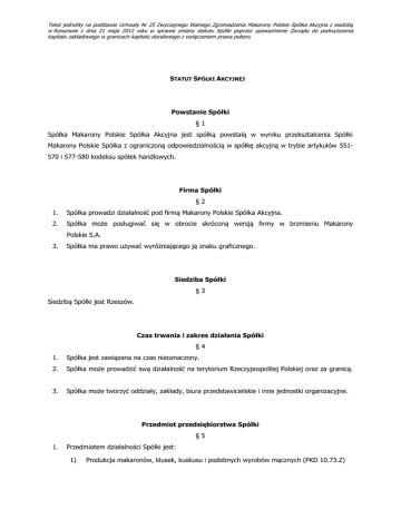 Tekst jednolity na podstawie Uchwały Nr 25 Zwyczajnego Walnego Zgromadzenia Makarony Polskie Spółka Akcyjna z siedzibą w Rzeszowie z dnia 21 maja 2012 roku w sprawie zmiany statutu Spółki poprzez upoważnienie Zarządu do podwyższenia kapitału zakładowego w granicach kapitału docelowego z wyłączeniem prawa poboru STATUT SPÓŁKI AKCYJNEJ Powstanie Spółki §1 Spółka Makarony Polskie Spółka Akcyjna jest spółką powstałą w wyniku przekształcenia Spółki Makarony Polskie Spółka z ograniczoną odpowiedzialnością w spółkę akcyjną w trybie artykułów 551570 i 577-580 kodeksu spółek handlowych. Firma Spółki §2 1. Spółka prowadzi działalność pod firmą Makarony Polskie Spółka Akcyjna. 2. Spółka może posługiwać się w obrocie skróconą wersją firmy w brzmieniu Makarony Polskie S.A. 3. Spółka ma prawo używać wyróżniającego ją znaku graficznego. Siedziba Spółki §3 Siedzibą Spółki jest Rzeszów. Czas trwania i zakres działania Spółki §4 1. Spółka jest zawiązana na czas nieoznaczony. 2. Spółka może prowadzić swą działalność na terytorium Rzeczypospolitej Polskiej oraz za granicą. 3. Spółka może tworzyć oddziały, zakłady, biura przedstawicielskie i inne jednostki organizacyjne. Przedmiot przedsiębiorstwa Spółki §5 1. Przedmiotem działalności Spółki jest: 1) Produkcja makaronów, klusek, kuskusu i podobnych wyrobów mącznych (PKD 10.73.Z) 2) Przetwarzanie i konserwowanie mięsa oraz produkcja wyrobów z mięsa (PKD 10.1) 3) Przetwarzanie i konserwowanie ryb, skorupiaków i mięczaków (PKD 10.2) 4) Przetwarzanie i konserwowanie owoców i warzyw (PKD 10.3) 5) Produkcja olejów i tłuszczów pochodzenia roślinnego i zwierzęcego (PKD 10.4) 6) Wytwarzanie wyrobów mleczarskich (PKD 10.5) 7) Wytwarzanie produktów przemiału zbóż, skrobi i wyrobów skrobiowych (PKD 10.6) 8) Produkcja wyrobów piekarskich i mącznych (PKD 10.7) 9) Produkcja pozostałych artykułów spożywczych (PKD 10.8) 10) Produkcja gotowych paszy i karmy dla zwierząt (PKD 10.9) 11) Produkcja napojów bezalkoholowych; produkcja wód mineralnych i pozostałych wód butelkowanych (PKD 11.07) 12) Produkcja opakowań drewnianych (PKD 16.24) 13) Produkcja papieru falistego i tektury falistej oraz opakowań z papieru i tektury (PKD 17.21) 14) Produkcja pozostałych wyrobów z papieru i tektury (PKD 17.29) 15) Drukowanie i działalność usługowa związana z poligrafią (PKD 18.1) 16) Produkcja opakowań z tworzyw sztucznych (PKD 22.22) 17) Naprawa, konserwacja i instalowanie maszyn i urządzeń (PKD 33) 18) Roboty budowlane związane ze wznoszeniem budynków (PKD 41) 19) Roboty związane z budową obiektów inżynierii lądowej i wodnej (PKD 42) 20) Roboty budowlane specjalistyczne (PKD 43) 21) Handel hurtowy i detaliczny pojazdami samochodowymi; naprawa pojazdów samochodowych (PKD 45) 22) Handel hurtowy, z wyłączeniem handlu pojazdami samochodowymi (PKD 46) 23) Handel detaliczny, z wyłączeniem handlu detalicznego pojazdami samochodowymi (PKD 47) 24) Transport drogowy towarów (PKD 49.41) 25) Magazynowanie i działalność usługowa wspomagająca transport (PKD 52) 26) Działalność usługowa związana z wyżywieniem (PKD 56) 27) Przetwarzanie danych; zarządzanie stronami internetowymi (hosting) i podobna działalność; działalność portali internetowych (PKD 63.1) 28) Działalność związana z obsługą rynku nieruchomości (PKD 68) 29) Badania naukowe i prace rozwojowe (PKD 72) 2 30) Reklama, badanie rynku i opinii publicznej (PKD 73) 31) Wynajem i dzierżawa (PKD 77) 32) Działalność związana z zatrudnieniem (PKD 78) 33) Działalność ochroniarska w zakresie obsługi systemów bezpieczeństwa (PKD 80.2) 34) Działalność usługowa związana z utrzymaniem porządku w budynkach i zagospodarowaniem terenów zieleni (PKD 81) 35) Działalność związana z administracyjną obsługą biura i pozostała działalność wspomagająca prowadzenie działalności gospodarczej (PKD 82) 2. 36) Działalność związana z grami losowymi i zakładami wzajemnymi (PKD 92) 37) Naprawa i konserwacja komputerów i artykułów użytku osobistego i domowego (PKD 95) 38) Pozostała działalność usługowa, gdzie indziej niesklasyfikowana (96.09). Działalność, do której prowadzenia wymagane będzie zezwolenie, będzie prowadzona przez Spółkę dopiero po jego uzyskaniu. Kapitał zakładowy Spółki §6 1. Kapitał zakładowy Spółki wynosi 27.750.213 (słownie: dwadzieścia siedem milionów siedemset pięćdziesiąt tysięcy dwieście trzynaście) złotych i dzieli się na 9.250.071 (słownie: dziewięć milionów dwieście pięćdziesiąt tysięcy siedemdziesiąt jeden) akcji o wartości nominalnej 3,00 zł (słownie: trzy złote) każda, w tym: a) 3.013.250 akcji zwykłych na okaziciela serii A, oznaczonych numerami od 1 (jeden) do 3.013.250 (trzy zero jeden trzy dwa pięć zero) b) 1.169.750 akcji zwykłych na okaziciela serii B oznaczonych numerami od 3.013.251 (trzy zero jeden trzy dwa pięć jeden) do 4.183.000 (cztery jeden osiem trzy zero zero zero); c) 3.000.000 akcji zwykłych na okaziciela serii C, oznaczonych numerami od 4.183.001 (cztery jeden osiem trzy zero zero jeden) do 7.183.000 (siedem jeden osiem trzy zero zero zero), d) 1.735.821 akcji zwykłych na okaziciela serii D, oznaczonych numerami od 7.183.001 (siedem jeden osiem trzy zero zero jeden) do 8.918.821 (osiem dziewięć jeden osiem osiem dwa jeden), e) 331.250 akcji zwykłych na okaziciela serii E, oznaczonych numerami od 8.918.822 (osiem dziewięć jeden osiem osiem dwa dwa) do 9.250.071 (dziewięć dwa pięć zero zero siedem jeden). 2. Akcje mogą być imienne lub na okaziciela. 3 3. Akcje mogą być wydawane w odcinkach zbiorowych. Na uzasadnione żądanie Akcjonariusza, Spółka zobowiązana jest do wymiany odcinka zbiorowego posiadanego przez Akcjonariusza na odcinki zbiorowe wystawione na mniejszą ilość akcji lub na pojedyncze akcje. Kapitały spółki § 6a Sp