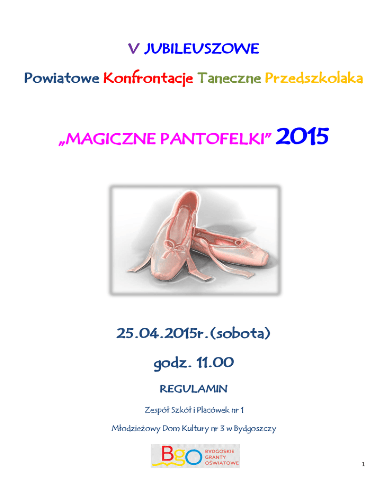 V JUBILEUSZOWE Powiatowe Konfrontacje Taneczne Przedszkolaka „MAGICZNE PANTOFELKI” 2015 25.04.2015r.(sobota) godz. 11.00 REGULAMIN Zespół Szkół i Placówek nr 1 Młodzieżowy Dom Kultury nr 3 w Bydgoszczy 1 1. Organizator: Zespół Szkół i Placówek nr 1, Młodzieżowy Dom Kultury nr 3 w Bydgoszczy 2. Termin konfrontacji: 25 kwietnia 2015r. ( sobota) godz. 11.00 3. Cele konfrontacji: Kształcenie umiejętności tanecznych uczestników i rozwijanie ich ekspresji ruchowej, Popularyzacja różnorodnych form ruchowo-tanecznych, konfrontacja dorobku artystycznego przedszkolaków, Promowanie młodych talentów, Ukazanie kreatywnej twórczości dziecięcej, Integracja środowiska przedszkolnego powiatu bydgoskiego. 4. Kategorie i zasady uczestnictwa: a) Konkurs przeznaczony jest dla dzieci przedszkolnych w dwóch kategoriach wiekowych: - 3-4 latki - 5-6 latki b) UWAGA !!Każda placówka może zgłosić do konkursu tylko JEDEN zespół taneczny max. 14 osobowy ( w związku z dużym zainteresowaniem naszymi konfrontacjami następuje zmiana ilości grup z jednej placówki). c) Łączna ilość osób z jednej placówki: uczestnicy i opiekunowie - nie powinna przekraczać 20 osób(ze względów bezpieczeństwa i dla komfortu wykonawców) d) Łączny czas prezentacji do 4 min e) Zespół prezentuje jeden układ taneczny w dowolnej formie tanecznej ( taniec towarzyski, współczesny, miniatura taneczna, disco, hip-hop). Wyklucza się udział zespołów i układów tańca ludowego. f) Zgłoszenia przyjmowane są do 6 kwietnia 2015r. UWAGA !!!W przypadku dużej ilości decyduje kolejność nadsyłanych zgłoszeń, organizator może zakończyć ich przyjmowanie przed wyznaczonym terminem. Zgłoszenia na adres: Zespół Szkół i Placówek Nr 1, Młodzieżowy Dom Kultury nr 3 ul. Stawowa 53, 85-3a23 Bydgoszcz Telefon: 52-373-25-15 fax. 52-348-68-68 e-mail: [email protected] 5. Kryteria oceny: Jury powołane przez organizatora oceniać będzie: Kompozycję choreograficzną Estetykę i ekspresję ruchową wykonawców Interpretację ruchową utworu muzycznego Dobór muzyki i kostiumów W poszczególnych kategoriach wiekowych przyznane zostaną dyplomy, nagrody i wyróżnienia oraz GRAND PRIX Konfrontacji, nagrody indywidualne dla małych tancerzy i choreografów. 2 6. Postanowienia końcowe - konfrontacje rozpoczną się o godz. 11.00 25 kwietnia 2015r. - rejestracja zespołów w dniu konfrontacji do godz. 10.30 - koszty podróży i ubezpieczenia pokrywa instytucja delegująca - zespół powinien posiadać liczbę opiekunów zgodną z obowiązującymi przepisami ( instruktor nie może być jedynym opiekunem grupy). - sprawy nie ujęte w regulaminie rozstrzyga organizator - organizator zastrzega sobie prawo do zmian w regulaminie oraz w przypadku małej ilości zgłoszeń do łączenia kategorii wiekowych. 7. Informacje dodatkowe: - Konfrontacje odbędą się na sali gimnastycznej (prosimy o zabranie obuwia zmiennego dla uczestników i osób towarzyszących) - Podkład muzyczny na płycie CD lub pendrive - lista zakwalifikowanych do konfrontacji grup podana zostanie na stronie internetowej http://www.zsip1.bydgoszcz.pl/ oraz przesłana e-mailem po 10 kwietnia 2015r. Szczegółowych informacji udziela: Aleksandra Podżerek tel. 606 903 082 ( w godz. 12.00-18.00) Iwona Wasilewska tel. 504-641 918 ( w godz. 14.00-18.00) Ramowy program konfrontacji: 10.00 – 10.30 rejestracja uczestników 11.00 – otwarcie konfrontacji 11.10 – 12.45 konfrontacje taneczne – kategoria wiekowa 3-4 latki, 5-6 latki W przerwie niespodzianka dla uczestników z okazji V edycji konfrontacji Około 13.15 – ogłoszenie wyników i wręczenie nagród 13.45 – zakończenie konfrontacji ( w przypadku małej ilości zespołów czas trwania konfrontacji może być krótszy) ZAPRASZAMY WSZYSTKIE ROZTAŃCZONE PRZEDSZKOLAKI !!! 3 (pieczęć instytucji delegującej) KARTA UCZESTNIKA V JUBILEUSZOWYCH POWIATOWYCH KONFRONTACJI TANECZNYCH PRZEDSZKOLAKA „MAGICZNE PANTOFELKI” 2015 1. Nazwa zespołu /grupy ………………………………………………………………....................................................... 2. Instytucja delegująca ( adres, telefon kontaktowy, e-mail) …………………………………………………………………………………………………………………………………………… …………………………………………………………………………………………………………………………………………… …………………………………………………………………………………………………………………………………………… 3. 4. 5. Kategoria wiekowa ( zaznaczyć „x” właściwe): 3-4-latki ........ ilość dzieci: ……… (dziewczynki:………. Chłopcy : ……….) 5-6 latki ........ ilość dzieci: ……… (dziewczynki:………. Chłopcy : ……….) Informacje szczegółowe: Tytuł choreografii: …………………………………………………………………………………………. Czas trwania: …………………………………………………………………………………………. Autor muzyki: Autor choreografii: …………………………………………………………………………………………. …………………………………………………………………………………………. Imię i nazwisko instruktora (opiekuna), tel. kontaktowy, e-mail ( wypełnić pismem drukowanym) ……………………………………………………………………………………………………………………………………………… ……………………………………………………………………………………………………………………………………………… 6. Kilka informacji o zespole/grupie przedszkolnej : ……………………………………………………