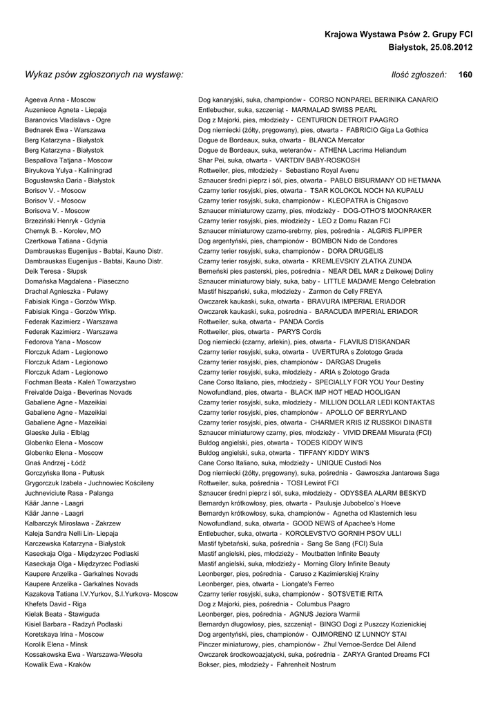 Krajowa Wystawa Psów 2. Grupy FCI Białystok, 25.08.2012 Wykaz psów zgłoszonych na wystawę: Ilość zgłoszeń: Ageeva Anna - Moscow Dog kanaryjski, suka, championów - CORSO NONPAREL BERINIKA CANARIO Auzeniece Agneta - Liepaja Baranovics Vladislavs - Ogre Entlebucher, suka, szczeniąt - MARMALAD SWISS PEARL Dog z Majorki, pies, młodzieży - CENTURION DETROIT PAAGRO Bednarek Ewa - Warszawa Dog niemiecki (żółty, pręgowany), pies, otwarta - FABRICIO Giga La Gothica Berg Katarzyna - Białystok Berg Katarzyna - Białystok Dogue de Bordeaux, suka, otwarta - BLANCA Mercator Dogue de Bordeaux, suka, weteranów - ATHENA Lacrima Heliandum Bespallova Tatjana - Moscow Shar Pei, suka, otwarta - VARTDIV BABY-ROSKOSH Biryukova Yulya - Kaliningrad Bogusławska Daria - Białystok Rottweiler, pies, młodzieży - Sebastiano Royal Avenu Sznaucer średni pieprz i sól, pies, otwarta - PABLO BISURMANY OD HETMANA Borisov V. - Mosocw Czarny terier rosyjski, pies, otwarta - TSAR KOLOKOL NOCH NA KUPALU Borisov V. - Mosocw Borisova V. - Moscow Czarny terier rosyjski, suka, championów - KLEOPATRA is Chigasovo Sznaucer miniaturowy czarny, pies, młodzieży - DOG-OTHO'S MOONRAKER Brzeziński Henryk - Gdynia Czarny terier rosyjski, pies, młodzieży - LEO z Domu Razan FCI Chernyk B. - Korolev, MO Czertkowa Tatiana - Gdynia Sznaucer miniaturowy czarno-srebrny, pies, pośrednia - ALGRIS FLIPPER Dog argentyński, pies, championów - BOMBON Nido de Condores Dambrauskas Eugenijus - Babtai, Kauno Distr. Czarny terier rosyjski, suka, championów - DORA DRUGELIS Dambrauskas Eugenijus - Babtai, Kauno Distr. Deik Teresa - Słupsk Czarny terier rosyjski, suka, otwarta - KREMLEVSKIY ZLATKA ZUNDA Berneński pies pasterski, pies, pośrednia - NEAR DEL MAR z Deikowej Doliny Domańska Magdalena - Piaseczno Sznaucer miniaturowy biały, suka, baby - LITTLE MADAME Mengo Celebration Drachal Agnieszka - Puławy Fabisiak Kinga - Gorzów Wlkp. Fabisiak Kinga - Gorzów Wlkp. Mastif hiszpański, suka, młodzieży - Zarmon de Celly FREYA Owczarek kaukaski, suka, otwarta - BRAVURA IMPERIAL ERIADOR Owczarek kaukaski, suka, pośrednia - BARACUDA IMPERIAL ERIADOR Federak Kazimierz - Warszawa Federak Kazimierz - Warszawa Fedorova Yana - Moscow Rottweiler, suka, otwarta - PANDA Cordis Rottweiler, pies, otwarta - PARYS Cordis Dog niemiecki (czarny, arlekin), pies, otwarta - FLAVIUS D’ISKANDAR Florczuk Adam - Legionowo Florczuk Adam - Legionowo Florczuk Adam - Legionowo Czarny terier rosyjski, suka, otwarta - UVERTURA s Zolotogo Grada Czarny terier rosyjski, pies, championów - DARGAS Drugelis Czarny terier rosyjski, suka, młodzieży - ARIA s Zolotogo Grada Fochman Beata - Kaleń Towarzystwo Freivalde Daiga - Beverinas Novads Cane Corso Italiano, pies, młodzieży - SPECIALLY FOR YOU Your Destiny Nowofundland, pies, otwarta - BLACK IMP HOT HEAD HOOLIGAN Gabaliene Agne - Mazeikiai Gabaliene Agne - Mazeikiai Gabaliene Agne - Mazeikiai Glaeske Julia - Elbląg Globenko Elena - Moscow Globenko Elena - Moscow Gnaś Andrzej - Łódź Gorczyńska Ilona - Pułtusk Grygorczuk Izabela - Juchnowiec Kościleny Juchneviciute Rasa - Palanga Käär Janne - Laagri Käär Janne - Laagri Kalbarczyk Mirosława - Zakrzew Kaleja Sandra Nelli Lin- Liepaja Karczewska Katarzyna - Białystok Kaseckaja Olga - Międzyrzec Podlaski Kaseckaja Olga - Międzyrzec Podlaski Kaupere Anzelika - Garkalnes Novads Kaupere Anzelika - Garkalnes Novads Kazakova Tatiana I.V.Yurkov, S.I.Yurkova- Moscow Khefets David - Riga Czarny terier rosyjski, suka, młodzieży - MILLION DOLLAR LEDI KONTAKTAS Czarny terier rosyjski, pies, championów - APOLLO OF BERRYLAND Czarny terier rosyjski, pies, otwarta - CHARMER KRIS IZ RUSSKOI DINASTII Sznaucer miniaturowy czarny, pies, młodzieży - VIVID DREAM Misurata (FCI) Buldog angielski, pies, otwarta - TODES KIDDY WIN'S Buldog angielski, suka, otwarta - TIFFANY KIDDY WIN'S Cane Corso Italiano, suka, młodzieży - UNIQUE Custodi Nos Dog niemiecki (żółty, pręgowany), suka, pośrednia - Gawroszka Jantarowa Saga Rottweiler, suka, pośrednia - TOSI Lewirot FCI Sznaucer średni pieprz i sól, suka, młodzieży - ODYSSEA ALARM BESKYD Bernardyn krótkowłosy, pies, otwarta - Paulusje Jubobelco`s Hoeve Bernardyn krótkowłosy, suka, championów - Agnetha od Klasternich lesu Nowofundland, suka, otwarta - GOOD NEWS of Apachee's Home Entlebucher, suka, otwarta - KOROLEVSTVO GORNIH PSOV ULLI Mastif tybetański, suka, pośrednia - Sang Se Sang (FCI) Sula Mastif angielski, pies, młodzieży - Moutbatten Infinite Beauty Mastif angielski, suka, młodzieży - Morning Glory Infinite Beauty Leonberger, pies, pośrednia - Caruso z Kazimierskiej Krainy Leonberger, pies, otwarta - Liongate's Ferreo Czarny terier rosyjski, suka, championów - SOTSVETIE RITA Dog z Majorki, pies, pośrednia - Columbus Paagro Kielak Beata - Stawiguda Kisiel Barbara - Radzyń Podlaski Koretskaya Irina - Moscow Korolik Elena - Minsk Kossakowska Ewa - Warszawa-Wesoła Kowalik Ewa - Kraków Leonberger, pies, pośrednia - AGNUS Jeziora Warmii Bernardyn długowłosy, pies, szczeniąt - BINGO Dogi z Puszczy Kozienickiej Dog argentyński, pies, championów - OJIMORENO IZ LUNNOY STAI Pinczer miniaturowy, pies, championów - Zhul Vernoe-Serdce Del Ailend Owczarek środkowoazjatycki, suka, pośrednia - ZARYA Granted Dreams FCI Bokser, pies, młodzieży - Fahrenheit Nostrum 160 Kradziecka Barbara Krzysztof Kradziecki- Sopot Buldog angielski, suka, młodzieży - VIVIEN Dyskretny Urok Burżuazji FCI Krawczyńska Elżbieta - Warszawa Kubalska Gabriela - Nowa Iwiczna Duży szwajcarski pies pasterski, pies, otwarta - Chicco Best-J-Ja Dog niemiecki (błękitny), suka, pośrednia - FLORENCJA Z Hugowej Ferajny Kucharczyk Beata - Warszawa Dog niemiecki (czarny, arlekin), pies, młodzieży - FRANCO-A del Castello delle Rocche Kuchta Bogusław - Skierniewice Kunowski Marcin - Czarna Wieś Kościelna Berneński pies pasterski, suka, pośrednia - IVETTE Millenijna Rodzina Bernardyn długowłosy, pies, pośred