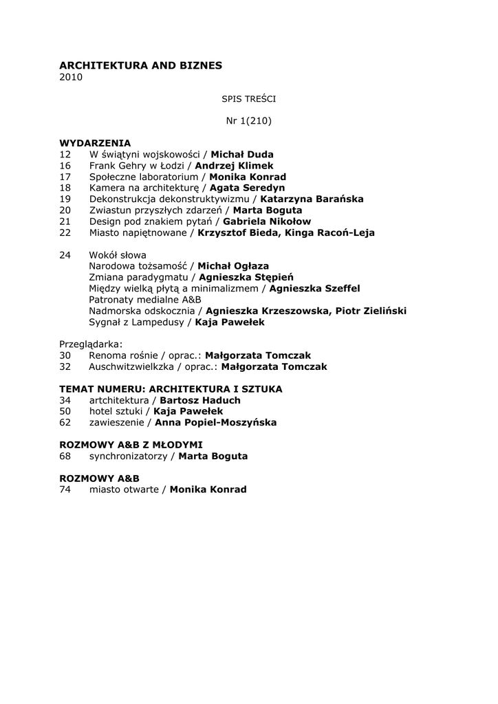 ARCHITEKTURA AND BIZNES 2010 SPIS TREŚCI Nr 1(210) WYDARZENIA 12 W świątyni wojskowości / Michał Duda 16 Frank Gehry w Łodzi / Andrzej Klimek 17 Społeczne laboratorium / Monika Konrad 18 Kamera na architekturę / Agata Seredyn 19 Dekonstrukcja dekonstruktywizmu / Katarzyna Barańska 20 Zwiastun przyszłych zdarzeń / Marta Boguta 21 Design pod znakiem pytań / Gabriela Nikołow 22 Miasto napiętnowane / Krzysztof Bieda, Kinga Racoń-Leja 24 Wokół słowa Narodowa tożsamość / Michał Ogłaza Zmiana paradygmatu / Agnieszka Stępień Między wielką płytą a minimalizmem / Agnieszka Szeffel Patronaty medialne A&B Nadmorska odskocznia / Agnieszka Krzeszowska, Piotr Zieliński Sygnał z Lampedusy / Kaja Pawełek Przeglądarka: 30 Renoma rośnie / oprac.: Małgorzata Tomczak 32 Auschwitzwielkzka / oprac.: Małgorzata Tomczak TEMAT NUMERU: ARCHITEKTURA I SZTUKA 34 artchitektura / Bartosz Haduch 50 hotel sztuki / Kaja Pawełek 62 zawieszenie / Anna Popiel-Moszyńska ROZMOWY A&B Z MŁODYMI 68 synchronizatorzy / Marta Boguta ROZMOWY A&B 74 miasto otwarte / Monika Konrad Nr 2(211) WYDARZENIA 12 Kostka w kolebce / Jakub Głaz 16 Budowlana rzeczywistość byłej NRD / Rainer Maas 17 Uwodzenie modernizmem / Agnieszka Szeffel 18 Teatr cieni / Wojciech Wilczyk 19 David Chipperfield — forma i materiał / Anna Popiel-Moszyńska 20 Wokół słowa: W przestrzennym labiryncie / Piotr Fiuk Gdańskie narracje / Agnieszka Szeffel Jak grać w miasto? / Anita Orchowska Patronaty medialne A&B Szlifując diamenty / Magda Bronigtgwska Środka warta poznania? / Olga Bogucewicz Przeglądarka: 28 Rzeźba z widokiem / oprac.: Marta Karpińska 30 Betonowy skorupiak / oprac.: Katarzyna Barańska 32 Najszlachetniejszy materiał / oprac.: Marta Karpińska TEMAT NUMERU: BETON PUBLICYSTYKA 34 Nowe betonowe / Michał Duda 44 Kolekcja zbunkrowana / Kaja Pawełek 54 Droga pamięci / Anna Pleszko 64 Piąty element / Gaweł Tyrała ROZMOWY A&B 72 Utopia na usługach etyki / Agnieszka Stępień i Lorenzo Barnó Martínez rozmowa z José Fariña ToJo RECENZJE 78 Dziecko w świecie dorosłych / Aleksandra Satkiewicz-Parczewska WSPOMNIENIA I REFLEKSJE 79 Claude Vasconi, 1940-2009. Pamięci wielkiego architekta i przyjaciela / Wojciech A. Leśnikowski Nr 3(212) WYDARZENIA 14 Życie między budynkami 14 Finał konkursu o Nagrodę Macieja Nowickiego / Małgorzata Tomczak 16 Prezentacja nagrodzonych prac 18 Laboratorium A&B / Małgorzata Tomczak 22 Galeria Jednego Projektu / Michał Duda 24 Wokół słowa Gdańsk w przebudowie / Agnieszka Szeffel Dobre listy / Magda Broniatowska, Małgorzata Włodarczyk Graficzny Białystok / Tomasz M. Kukawski Patronaty medialne A&B 26 27 28 Żagiel w białym mieście / Paweł Kolbusz Spacer brzegiem rzeki / Aleksandra Jach Hiszpańska, korupcja 32 Przeglądarka 32 Okno na Mediolan / oprac.: Marta Karpińska 34 Szklany dom / oprac.: Marta Karpińska 36 Udręka i ekstaza / Marta Karpińska TEMAT NUMERU: ARCHITEKCI 40 Przestrzenne puzzle / Aureliusz Kowalczyk 50 wolność eksperymentu / Anna Popiel-Moszyńska PUBLICYSTYKA 56 Absolwentka / Karina Koziej 66 Witruwiusz była kobietą / Marcin Mateusz Kołakowski ROZMOWY A&B 70 Przez rysunek do serca / Marcin Kołtuński Nr 4(213) WYDARZENIA 18 Drewno na placu Wolnica / Aleksandra Jach 22 Realizując cele społeczne / Magda Broniatowska 24 Inne spojrzenie / Anna Popiel-Moszyńska 25 Estetyka dynamizmu / Anna Popiel-Moszyńska 26 Zaskakująca twarz chilijskich miast / Agnieszka Szeffel 27 Biała plama na mapie Europy / Karina Koziej 28 Dialog w przestrzeni / Magda Broniatowska 30 Wokół słowa: Koniecznie KOŁO / Marta Karpińska, Katarzyna Baranska Kamienna architektura / Małgorzata Tomczak Patronaty medialne A&B 31 W poszukiwaniu utraconego blasku / Julia Jacoń TEMAT NUMERU: KAMIEŃ 34 CADA po pekińsku / Bartosz Haduch, Michał Haduch 42 Epoka kamienia / Anna Bulanda-Jansen 48 Gra kontrastów / Agnieszka Stępien 56 Filozofia kamienia / Marta Boguta 62 Twierdza Przemyśl / Marta Karpińska ROZMOWA A&B 70 Poetycka precyzja / Emiko Hayakawa, Aureliusz Kowalczyk nr 5(214) WYDARZENIA 18 Tworząc miejsce dla historii / Kaja Pawełek 19 Futerał na historię / Jarosław Trybuś 24 Przekorny tradycjonalista / Aleksandra Jach 25 Architekci pamięci / Magdalena Sądel 26 Architektura jako zbudowany system ekologiczny / Artur Jasiński 28 Wokół słowa Biuro nie musi być nudne! / Marta Boguta Światło, powietrze i dźwięk / Magda Broniatowska XX-lecie Izby Projektowania Budowlanego / Magda Broniatowska Zieleń miejska / Marta Karpińska Patronaty medialne A&B 30 W poszukiwaniu tożsamości / Aleksandra Paradowska 34 Przeglądarka 34 Ekologiczna reaktywacja / oprac.: Marta Karpińska 36 Pasywnie dla aktywnych / oprac. Marta Karpińska TEMAT NUMERU : ZRÓWNOWAŻONY ROZWÓJ 38 Dom ze śmieci / Agata Seredyn 46 Ziemski Eden / Anna Popiel-Moszyńska 54 KWK Promes na okrągło / Marta Karpińska PUBLICYSTYKA 58 dalEKO od venustas / Marcin Mateusz Kołakowski 60 Miej zielone pojęcie! / Marcin Mateusz Kołakowski 66 Pasywna Polska / Tomasz Pyszczek, Marcin Stelmach ROZMOWY A&B 70 Czynnik ludzki / Agnieszka Stepień, Lorenzo Barnó RECENZJA 74 Spuścizna Ebenezera Howarda / Anna Cymer Nr 6(215) WYDARZENIA 24 Cenne spotkania między budynkami / Magda Broniatowska 25 Piesze humanisty wędrówki po mieście / Agnieszka Szeffel 26 Prawo do miasta / Aleksandra Tomczak 27 Nowe nadbrzeże Tagu / Łukasz Marciniak 28 Praga na celowniku / Marta Boguta 30 Inny modernizm / Aleksandra Jach 31 Dziedzictwo nowoczesności / Marta Boguta 32 Panorama europejskiej architektury / Anna Popiel-Moszyńska 33 Galeria Jednego Projektu / Michał Duda 34 Wokół słowa Projektowanie parametryczne / Przemysław Jaworski Przestrzenne formuły / Marcin Pala Rewitalizacja w „mieście stu wież” / Andrzej Klimek Majówka architektów / Tomasz Gurgul Kolory Krakowa / Marta Kaflińska Patronaty medialne A&B 36 Gambit PKO BP / Karina Koziej 40 Przeglądarka 40 Chałupa w mieście / op