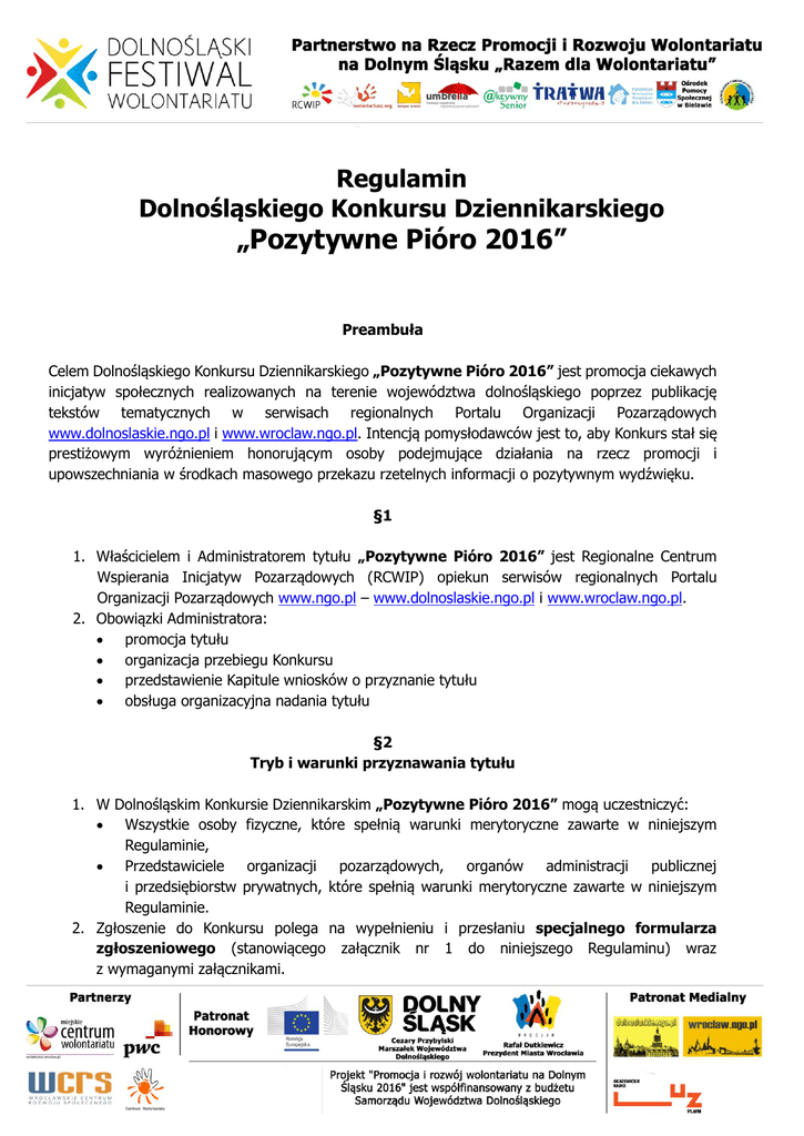 Regulamin Dolnośląskiego Konkursu Dziennikarskiego „Pozytywne Pióro 2016” Preambuła Celem Dolnośląskiego Konkursu Dziennikarskiego „Pozytywne Pióro 2016” jest promocja ciekawych inicjatyw społecznych realizowanych na terenie województwa dolnośląskiego poprzez publikację tekstów tematycznych w serwisach regionalnych Portalu Organizacji Pozarządowych www.dolnoslaskie.ngo.pl i www.wroclaw.ngo.pl. Intencją pomysłodawców jest to, aby Konkurs stał się prestiżowym wyróżnieniem honorującym osoby podejmujące działania na rzecz promocji i upowszechniania w środkach masowego przekazu rzetelnych informacji o pozytywnym wydźwięku. §1 1. Właścicielem i Administratorem tytułu „Pozytywne Pióro 2016” jest Regionalne Centrum Wspierania Inicjatyw Pozarządowych (RCWIP) opiekun serwisów regionalnych Portalu Organizacji Pozarządowych www.ngo.pl – www.dolnoslaskie.ngo.pl i www.wroclaw.ngo.pl. 2. Obowiązki Administratora: promocja tytułu organizacja przebiegu Konkursu przedstawienie Kapitule wniosków o przyznanie tytułu obsługa organizacyjna nadania tytułu §2 Tryb i warunki przyznawania tytułu 1. W Dolnośląskim Konkursie Dziennikarskim „Pozytywne Pióro 2016” mogą uczestniczyć: Wszystkie osoby fizyczne, które spełnią warunki merytoryczne zawarte w niniejszym Regulaminie, Przedstawiciele organizacji pozarządowych, organów administracji publicznej i przedsiębiorstw prywatnych, które spełnią warunki merytoryczne zawarte w niniejszym Regulaminie. 2. Zgłoszenie do Konkursu polega na wypełnieniu i przesłaniu specjalnego formularza zgłoszeniowego (stanowiącego załącznik nr 1 do niniejszego Regulaminu) wraz z wymaganymi załącznikami. 3. Formularz zgłoszeniowy należy wypełnić komputerowo, na maszynie lub ręcznie (czytelnie, drukowanymi literami). Zgłoszenia nieczytelne będą odrzucane. 4. Do Zgłoszenia obowiązkowo należy załączyć: Pracę konkursową stanowiącą tekst dziennikarski wg wytycznych zawartych w pkt.5. 5. Praca konkursowa będąca autorskim tekstem dziennikarskim powinna spełniać następujące kryteria: Mieścić się w jednej z 3 kategorii konkursowych: - relacja z wydarzenia (reportaż) - wywiad - felieton Być tekstem o długości nie mniejszej niż 3500 i nie większej niż 12000 znaków łącznie ze spacjami i znakami interpunkcyjnymi. Łączna długość cytatów i fragmentów tekstu zaczerpniętych z innych źródeł nie może przekraczać 30% całkowitej objętości tekstu. Nie dotyczy to kategorii „Wywiad”. Wszystkie cytaty i fragmenty tekstu zaczerpnięte z innych źródeł muszą być opatrzone cudzysłowem i odpowiednim przypisem bibliograficznym. Tematyka tekstu powinna być związana z aktywnością społeczną np. działalnością organizacji pozarządowej, grupy nieformalnej lub formalnej realizującej działania o charakterze niekomercyjnym. Do tekstu powinny być dołączone zdjęcia (min. 1 – max. 5) obrazujące treść pracy konkursowej. Zdjęcia powinny być wykonane osobiście przez uczestnika Konkursu lub w przypadku podarowania ich przez organizację/instytucję/organizatora wydarzenia, którego dotyczy tekst opatrzone stosowną pisemną zgodą na wykorzystanie do celów Konkursowych, w tym na publikację w serwisach Portalu www.dolnoslaskie.ngo.pl i www.wroclaw.ngo.pl. (część III Formularza Zgłoszeniowego). 6. Jeden uczestnik Konkursu może zgłosić do udziału w Konkursie maksymalnie 3 prace, pod warunkiem, że będą one stanowić odrębne zgłoszenia w różnych kategoriach konkursowych. W ramach jednej kategorii uczestnik może zgłosić tylko jedną pracę. 7. Prace Konkursowe należy złożyć w dwóch jednakowych kopiach: jedną w wersji papierowej i jedną w wersji elektronicznej na płycie CD/DVD. 8. Wersja elektroniczna pracy konkursowej powinna zawierać dwie wersje sformatowanego pliku tekstowego w formacie DOC/DOCX i PDF oraz zdjęcia w formacie JPG. 9. W przypadku liczby zgłoszeń znacznie przekraczającej możliwości publikacyjne Organizator zastrzega sobie prawo wyboru najciekawszych jego zdaniem prac w celu publikacji w serwisach regionalnych portalu www.ngo.pl. 10. Okres nadsyłania zgłoszeń i prac konkursowych: od 1 września 2016 r. do 31 października 2016 r. (decyduje data wpłynięcia kompletnego zgłoszenia). Kolejność zgłoszeń nie będzie mieć znaczenia podczas wyboru laureatów. Zgłoszenia, które wpłyną w innym terminie zostaną odrzucone. 11. Zgłoszenia do Konkursu należy składać osobiście bądź za pośrednictwem Poczty Polskiej na adres: Regionalne Centrum Wspierania Inicjatyw Pozarządowych Biuro Regionalne w Wałbrzychu ul. Matejki 6 58-300 Wałbrzych. Organizator nie ponosi odpowiedzialności za Zgłoszenia złożone lub przesłane na adres innego biura Organizatora niż podane w niniejszym Regulaminie. 12. Dopuszcza się przesłanie Zgłoszenia pocztą elektroniczną na adres: [email protected] lub faksem na nr (74) 665 11 11 w.60, jednakże podpisane oryginały formularzy zgłoszeniowych winny zostać dosłane pocztą. W tym wypadku terminem nadesłania zgłoszenia jest data wpłynięcia korespondencji elektronicznej bądź faksu. 13. Zgłoszenia niekompletne lub nie spełniające wymogów regulaminowych oraz składane na nieprawidłowym formularzu będą odrzucane. 14. Po zakończeniu przyjmowania Zgłoszeń Organizator przygotowuje ich kompleksową weryfikację. 15. Kapituła Konkursu dokonuje wyboru Laureatów Konkursu. 16. Niedopuszczalne jest przekazywanie Członkom Kapituły przez Uczestników Konkursu rzeczy wartościowych. §3 Informacje dodatkowe 1. Przed przygotowaniem Zgłoszenia należy zapoznać się z zasadami Dolnośląskiego Konkursu Dziennikarskiego „Pozytywne Pióro 2016” zawartymi w niniejszym Regulaminie. 2. Szczegółowych informacji na temat organizacji i przebiegu Konkursu udziela od poniedziałku do piątku w godz. 8.00 – 17.00: Radosław Bednarski tel. (74) 665 11 11 kom. 693 145 674 e-mail: [e
