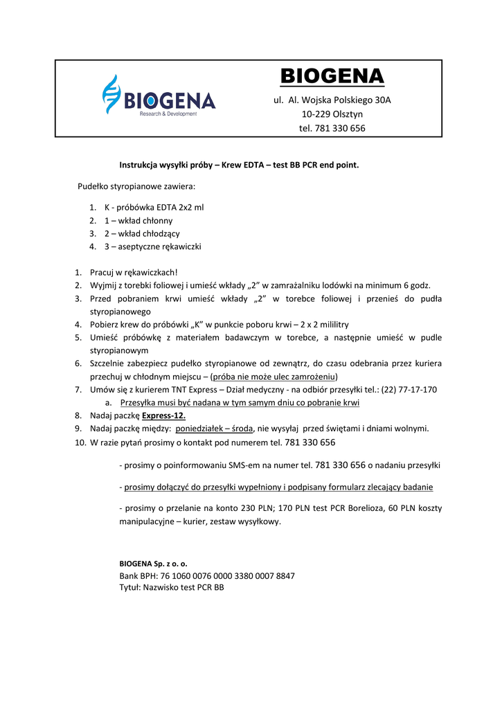 BIOGENA ul. Al. Wojska Polskiego 30A 10-229 Olsztyn tel. 781 330 656 Instrukcja wysyłki próby – Krew EDTA – test BB PCR end point. Pudełko styropianowe zawiera: 1. 2. 3. 4. K - próbówka EDTA 2x2 ml 1 – wkład chłonny 2 – wkład chłodzący 3 – aseptyczne rękawiczki 1. Pracuj w rękawiczkach! 2. Wyjmij z torebki foliowej i umieść wkłady „2” w zamrażalniku lodówki na minimum 6 godz. 3. Przed pobraniem krwi umieść wkłady „2” w torebce foliowej i przenieś do pudła styropianowego 4. Pobierz krew do próbówki „K” w punkcie poboru krwi – 2 x 2 mililitry 5. Umieść próbówkę z materiałem badawczym w torebce, a następnie umieść w pudle styropianowym 6. Szczelnie zabezpiecz pudełko styropianowe od zewnątrz, do czasu odebrania przez kuriera przechuj w chłodnym miejscu – (próba nie może ulec zamrożeniu) 7. Umów się z kurierem TNT Express – Dział medyczny - na odbiór przesyłki tel.: (22) 77-17-170 a. Przesyłka musi być nadana w tym samym dniu co pobranie krwi 8. Nadaj paczkę Express-12. 9. Nadaj paczkę między: poniedziałek – środa, nie wysyłaj przed świętami i dniami wolnymi. 10. W razie pytań prosimy o kontakt pod numerem tel. 781 330 656 - prosimy o poinformowaniu SMS-em na numer tel. 781 330 656 o nadaniu przesyłki - prosimy dołączyć do przesyłki wypełniony i podpisany formularz zlecający badanie - prosimy o przelanie na konto 230 PLN; 170 PLN test PCR Borelioza, 60 PLN koszty manipulacyjne – kurier, zestaw wysyłkowy. BIOGENA Sp. z o. o. Bank BPH: 76 1060 0076 0000 3380 0007 8847 Tytuł: Nazwisko test PCR BB