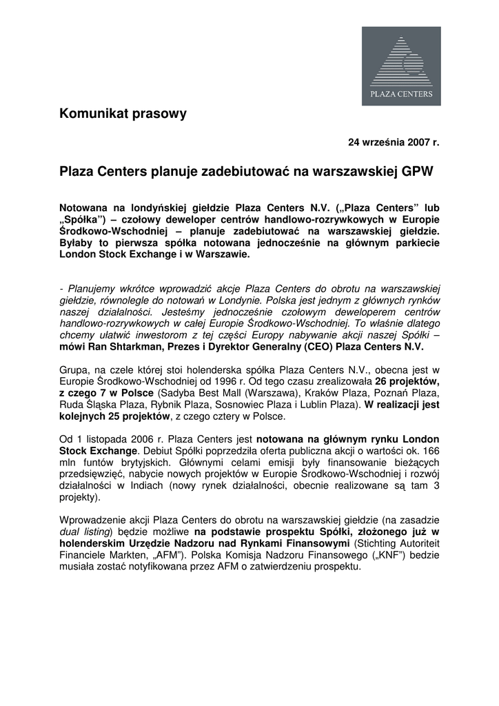 Komunikat prasowy 24 września 2007 r. Plaza Centers planuje zadebiutować na warszawskiej GPW Notowana na londyńskiej giełdzie Plaza Centers N.V. („Plaza Centers” lub „Spółka”) – czołowy deweloper centrów handlowo-rozrywkowych w Europie Środkowo-Wschodniej – planuje zadebiutować na warszawskiej giełdzie. Byłaby to pierwsza spółka notowana jednocześnie na głównym parkiecie London Stock Exchange i w Warszawie. - Planujemy wkrótce wprowadzić akcje Plaza Centers do obrotu na warszawskiej giełdzie, równolegle do notowań w Londynie. Polska jest jednym z głównych rynków naszej działalności. Jesteśmy jednocześnie czołowym deweloperem centrów handlowo-rozrywkowych w całej Europie Środkowo-Wschodniej. To właśnie dlatego chcemy ułatwić inwestorom z tej części Europy nabywanie akcji naszej Spółki – mówi Ran Shtarkman, Prezes i Dyrektor Generalny (CEO) Plaza Centers N.V. Grupa, na czele której stoi holenderska spółka Plaza Centers N.V., obecna jest w Europie Środkowo-Wschodniej od 1996 r. Od tego czasu zrealizowała 26 projektów, z czego 7 w Polsce (Sadyba Best Mall (Warszawa), Kraków Plaza, Poznań Plaza, Ruda Śląska Plaza, Rybnik Plaza, Sosnowiec Plaza i Lublin Plaza). W realizacji jest kolejnych 25 projektów, z czego cztery w Polsce. Od 1 listopada 2006 r. Plaza Centers jest notowana na głównym rynku London Stock Exchange. Debiut Spółki poprzedziła oferta publiczna akcji o wartości ok. 166 mln funtów brytyjskich. Głównymi celami emisji były finansowanie bieżących przedsięwzięć, nabycie nowych projektów w Europie Środkowo-Wschodniej i rozwój działalności w Indiach (nowy rynek działalności, obecnie realizowane są tam 3 projekty). Wprowadzenie akcji Plaza Centers do obrotu na warszawskiej giełdzie (na zasadzie dual listing) będzie możliwe na podstawie prospektu Spółki, złożonego już w holenderskim Urzędzie Nadzoru nad Rynkami Finansowymi (Stichting Autoriteit Financiele Markten, „AFM”). Polska Komisja Nadzoru Finansowego („KNF”) bedzie musiała zostać notyfikowana przez AFM o zatwierdzeniu prospektu. Plaza Centers – informacja o Spółce Grupa Plaza Centers N.V. („Plaza Centers”) jest jednym z wiodących deweloperów centrów rozrywkowo-handlowych w Europie ŚrodkowoWschodniej. Spółka skupia się na szybko rozwijających się rynkach takich jak polski, węgierski, czeski, rumuński czy serbski. W ostatnim czasie rozszerzyła obszar działalności o Indie. Plaza Centers jest obecna w regionie Europy Środkowo-Wschodniej od 1996 r., kiedy wybudowała pierwsze nowoczesne centra handlowe na Węgrzech. Do dziś Spółka sprzedała (lub podpisała umowy przyszłej sprzedaży) 26 obiektów, z czego 7 w Polsce. Obecnie Spółka realizuje 25 projektów deweloperskich (głównie centra handloworozrywkowe i inne duże projekty obejmujące również powierzchnie biurowe, mieszkania i hotele). Strategia Spółki zakłada realizację 4-5 nowoczesnych centrów handlowo-rozrywkowych rocznie. Plaza Centers zamierza również umocnić czołową pozycję rynkową w Europie Środkowo-Wschodniej i Indiach. Obok budowy nowych obiektów Spółka planuje przejmować już istniejące, które dzięki unowocześnieniu i przebudowie będzie można korzystnie sprzedać. Strategia Spółki zakłada również zarządzanie własnymi centrami tam, gdzie może to przynosić odpowiednio wysokie zyski. Plaza Centers osiąga bardzo dobre wyniki finansowe. W I półroczu 2007 r. Spółka osiągnęła 22,6 mln EUR zysku netto, wobec 14,7 mln EUR w całym 2006 r. i 29,3 mln EUR w 2005 r. Od listopada 2006 r. Plaza Centers jest notowana na głównym parkiecie Giełdy Papierów Wartościowych w Londynie (London Stock Exchange). Oferta publiczna Spółki miała wartość ok. 166 mln funtów. Od momentu przeprowadzenia oferty publicznej Spółka kupiła nieruchomości do realizacji 13 projektów i otworzyła trzy centra handlowo-rozrywkowe. Na chwilę obecną, środki z emisji zostały wykorzystane w ok. 60%. Niniejszy materiał nie może być przedmiotem bezpośredniej lub pośredniej dystrybucji poza granicami Rzeczypospolitej Polskiej, w szczególności na terytorium Stanów Zjednoczonych, Australii, Kanady albo Japonii. Niniejszy materiał ma wyłącznie charakter promocyjny. Jedynym prawnie wiążącym dokumentem zawierającym informacje o spółce Plaza Centers N.V. („Spółka”) i akcjach Spółki jest Prospekt. Prospekt został sporządzony w związku z zamiarem ubiegania się o dopuszczenie akcji Spółki do obrotu na rynku regulowanym Giełdy Papierów Wartościowych w Warszawie S.A. Prospekt zostanie udostępniony do publicznej wiadomości w następujący sposób: na stronie internetowej Spółki www.plazacenters.com oraz w siedzibie Spółki - Plaza Centers N.V., Keizersgracht 241 1016 EA Amsterdam, Holandia.