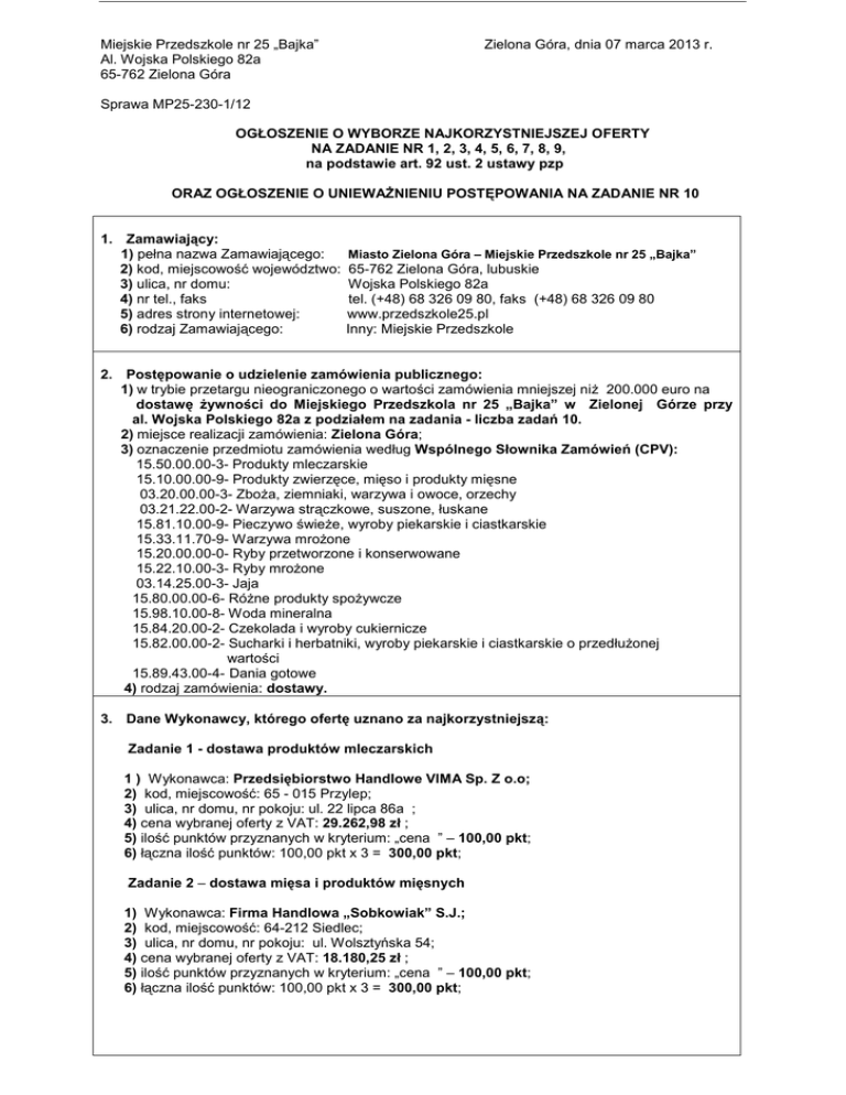 Miejskie Przedszkole nr 25 „Bajka” Al. Wojska Polskiego 82a 65-762 Zielona Góra Zielona Góra, dnia 07 marca 2013 r. Sprawa MP25-230-1/12 OGŁOSZENIE O WYBORZE NAJKORZYSTNIEJSZEJ OFERTY NA ZADANIE NR 1, 2, 3, 4, 5, 6, 7, 8, 9, na podstawie art. 92 ust. 2 ustawy pzp ORAZ OGŁOSZENIE O UNIEWAŻNIENIU POSTĘPOWANIA NA ZADANIE NR 10 1. Zamawiający: 1) pełna nazwa Zamawiającego: 2) kod, miejscowość województwo: 3) ulica, nr domu: 4) nr tel., faks 5) adres strony internetowej: 6) rodzaj Zamawiającego: Miasto Zielona Góra – Miejskie Przedszkole nr 25 „Bajka” 65-762 Zielona Góra, lubuskie Wojska Polskiego 82a tel. (+48) 68 326 09 80, faks (+48) 68 326 09 80 www.przedszkole25.pl Inny: Miejskie Przedszkole 2. Postępowanie o udzielenie zamówienia publicznego: 1) w trybie przetargu nieograniczonego o wartości zamówienia mniejszej niż 200.000 euro na dostawę żywności do Miejskiego Przedszkola nr 25 „Bajka” w Zielonej Górze przy al. Wojska Polskiego 82a z podziałem na zadania - liczba zadań 10. 2) miejsce realizacji zamówienia: Zielona Góra; 3) oznaczenie przedmiotu zamówienia według Wspólnego Słownika Zamówień (CPV): 15.50.00.00-3- Produkty mleczarskie 15.10.00.00-9- Produkty zwierzęce, mięso i produkty mięsne 03.20.00.00-3- Zboża, ziemniaki, warzywa i owoce, orzechy 03.21.22.00-2- Warzywa strączkowe, suszone, łuskane 15.81.10.00-9- Pieczywo świeże, wyroby piekarskie i ciastkarskie 15.33.11.70-9- Warzywa mrożone 15.20.00.00-0- Ryby przetworzone i konserwowane 15.22.10.00-3- Ryby mrożone 03.14.25.00-3- Jaja 15.80.00.00-6- Różne produkty spożywcze 15.98.10.00-8- Woda mineralna 15.84.20.00-2- Czekolada i wyroby cukiernicze 15.82.00.00-2- Sucharki i herbatniki, wyroby piekarskie i ciastkarskie o przedłużonej wartości 15.89.43.00-4- Dania gotowe 4) rodzaj zamówienia: dostawy. 3. Dane Wykonawcy, którego ofertę uznano za najkorzystniejszą: Zadanie 1 - dostawa produktów mleczarskich 1 ) Wykonawca: Przedsiębiorstwo Handlowe VIMA Sp. Z o.o; 2) kod, miejscowość: 65 - 015 Przylep; 3) ulica, nr domu, nr pokoju: ul. 22 lipca 86a ; 4) cena wybranej oferty z VAT: 29.262,98 zł ; 5) ilość punktów przyznanych w kryterium: „cena ” – 100,00 pkt; 6) łączna ilość punktów: 100,00 pkt x 3 = 300,00 pkt; Zadanie 2 – dostawa mięsa i produktów mięsnych 1) Wykonawca: Firma Handlowa „Sobkowiak” S.J.; 2) kod, miejscowość: 64-212 Siedlec; 3) ulica, nr domu, nr pokoju: ul. Wolsztyńska 54; 4) cena wybranej oferty z VAT: 18.180,25 zł ; 5) ilość punktów przyznanych w kryterium: „cena ” – 100,00 pkt; 6) łączna ilość punktów: 100,00 pkt x 3 = 300,00 pkt; Zadanie 3 – dostawa owoców i warzyw 1) Wykonawca: Przedsiębiorstwo Handlowe „JONEX” Katarzyna Jońska; 2) kod, miejscowość:65-730 Zielona Góra ; 3) ulica, nr domu, nr pokoju: ul. Elektronowa 2; 4) cena wybranej oferty z VAT: 20.159,80 zł ; 5) ilość punktów przyznanych w kryterium: „cena ” – 100,00 pkt; 6) łączna ilość punktów: 100,00 pkt x 3 = 300,00 pkt; Zadanie 4 – dostawa pieczywa 1) Wykonawca: Produkcja Pieczywa i Ciastkarstwa Robert Szepelak, 2) kod, miejscowość: 66-001 Zawada ; 3) ulica, nr domu, nr pokoju: ul. Akacjowa 25 4) cena wybranej oferty z VAT: 6.079,55 zł ; 5) ilość punktów przyznanych w kryterium: „cena ” – 100,00 pkt; 6) łączna ilość punktów: 100,00 pkt x 3 = 300,00 pkt Zadanie 5 – dostawa mrożonych warzyw i owoców 1) Wykonawca: Ice QB Spółka z ograniczoną odpowiedzialnością, 2) kod, miejscowość: 65-419 Zielona Góra; 3) ulica, nr domu, nr pokoju: ul. gen J. Sowińskiego 2/4 4) cena wybranej oferty z VAT: 3.168,27 zł ; 5) ilość punktów przyznanych w kryterium: „cena ” – 100,00 pkt; 6) łączna ilość punktów: 100,00 pkt x 3 = 300,00 pkt; Zadanie 6 – dostawa ryb i przetworów rybnych 1 ) Wykonawca: Przedsiębiorstwo Handlowe VIMA Sp. Z o.o; 2) kod, miejscowość: 65 - 015 Przylep; 3) ulica, nr domu, nr pokoju: ul. 22 lipca 86a ; 4) cena wybranej oferty z VAT: 2.395,00 zł ; 5) ilość punktów przyznanych w kryterium: „cena ” – 100,00 pkt; 6) łączna ilość punktów: 100,00 pkt x 3 = 300,00 pkt; Zadanie 7 – dostawa jaj świeżych 1) Wykonawca: FERMA DROBIU Kinga Firlej – Gąsiorowska, 2) kod, miejscowość: 65-106 Niedoradz 3) ulica, nr domu, nr pokoju: ul. Markiewiczowej 11 4) cena wybranej oferty z VAT: 2.365,84 zł; 5) ilość punktów przyznanych w kryterium: „cena ” – 100,00 pkt; 6) łączna ilość punktów: 100,00 pkt x 3 = 300,00 pkt; Zadanie 8 – dostawa artykułów spożywczych 1) Wykonawca: DAGA” s.c. Zakład Handlu Art. Spoż i Przem. Jan Siepko, Elżbieta Siepko, 2) kod, miejscowość: 65-001 Zielona Góra 3) ulica, nr domu, nr pokoju: ul. Jedności 23/5 4) cena wybranej oferty z VAT: 30.321,23 zł; 5) ilość punktów przyznanych w kryterium: „cena ” – 100,00 pkt; 6) łączna ilość punktów: 100,00 pkt x 3 = 300,00 pkt; Zadanie 9 – dostawa wody mineralnej 1) Wykonawca: UNIMA Sp.z Sp.o. w Warszawie Hurtownia Artykułów Spożywczych , 2) kod, miejscowość: 65-142 Zielona Góra 3) ulica, nr domu, nr pokoju: : ul. Zdrojowa 4 4) cena wybranej oferty z VAT: 738,14 zł; 5) ilość punktów przyznanych w kryterium: „cena ” – 100,00 pkt; 6) łączna ilość punktów: 100,00 pkt x 3 = 300,00 pkt; 2 4. Uzasadnienie wyboru Wykonawcy: Dla zadania 1 Wykonawca spełnia warunki udziału w postępowaniu, a jego oferta jest zgodna z ustawą z dnia 29 stycznia 2004 r. Prawo zamówień publicznych (tekst jednolity Dz. U. z 2010 r. Nr 113, poz. 759 z późn. zm.) i Specyfikacją Istotnych Warunków Zamówienia oraz jest najkorzystniejsza i otrzymała najwyższą liczbę punktów, tj. 300,00 (100,00x3) w oparciu o kryterium „cena-100%”. dla Zadania 2 Wykonawca spełnia warunki udziału w postępowaniu, a jego oferta jest zgodna z ustawą z dnia 29 stycznia 2004 r. Prawo zamówień publicznych (tekst jednolity Dz. U. z 2010 r. Nr 113, poz. 759 z późn. zm.) i Sp