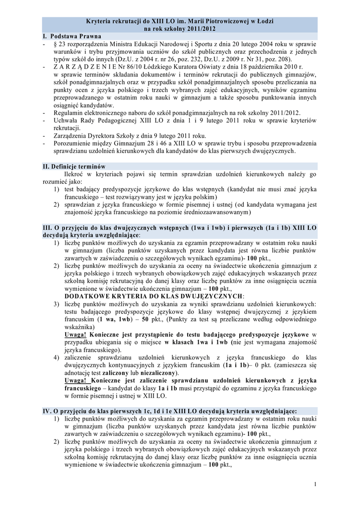 Kryteria rekrutacji do XIII LO im. Marii Piotrowiczowej w Łodzi na rok