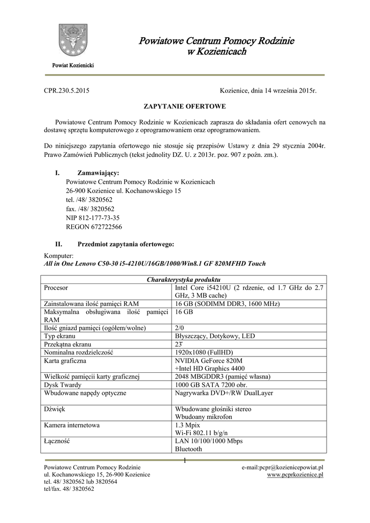 Powiatowe Centrum Pomocy Rodzinie w Kozienicach Powiat Kozienicki Kozienice, dnia 14 września 2015r. CPR.230.5.2015 ZAPYTANIE OFERTOWE Powiatowe Centrum Pomocy Rodzinie w Kozienicach zaprasza do składania ofert cenowych na dostawę sprzętu komputerowego z oprogramowaniem oraz oprogramowaniem. Do niniejszego zapytania ofertowego nie stosuje się przepisów Ustawy z dnia 29 stycznia 2004r. Prawo Zamówień Publicznych (tekst jednolity DZ. U. z 2013r. poz. 907 z poźn. zm.). I. Zamawiający: Powiatowe Centrum Pomocy Rodzinie w Kozienicach 26-900 Kozienice ul. Kochanowskiego 15 tel. /48/ 3820562 fax. /48/ 3820562 NIP 812-177-73-35 REGON 672722566 II. Przedmiot zapytania ofertowego: Komputer: All in One Lenovo C50-30 i5-4210U/16GB/1000/Win8.1 GF 820MFHD Touch Charakterystyka produktu Intel Core i54210U (2 rdzenie, od 1.7 GHz do 2.7 GHz, 3 MB cache) Zainstalowana ilość pamięci RAM 16 GB (SODIMM DDR3, 1600 MHz) Maksymalna obsługiwana ilość pamięci 16 GB RAM Ilość gniazd pamięci (ogółem/wolne) 2/0 Typ ekranu Błyszczący, Dotykowy, LED Przekątna ekranu 23̎ Nominalna rozdzielczość 1920x1080 (FullHD) Karta graficzna NVIDIA GeForce 820M +Intel HD Graphics 4400 Wielkość pamięcii karty graficznej 2048 MBGDDR3 (pamięć własna) Dysk Twardy 1000 GB SATA 7200 obr. Wbudowane napędy optyczne Nagrywarka DVD+/RW DualLayer Procesor Dźwięk Kamera internetowa Łączność Wbudowane głośniki stereo Wbudoany mikrofon 1.3 Mpix Wi-Fi 802.11 b/g/n LAN 10/100/1000 Mbps Bluetooth 1 Powiatowe Centrum Pomocy Rodzinie ul. Kochanowskiego 15, 26-900 Kozienice tel. 48/ 3820562 lub 3820564 tel/fax. 48/ 3820562 e-mail:[email protected] www.pcprkozienice.pl Powiatowe Centrum Pomocy Rodzinie w Kozienicach Powiat Kozienicki Rodzaje wyjść/wejść-panel tylni USB 2.0 -3szt. RJ45(LAN) -1 szt. HDMI -1szt. AC-in (wejście zasilania) -1szt. USB 3.0 -2szt. Wejście mikrofonowe -1szt. Wyjście słuchawkowe/głośnikowe -1szt. Czytnik kart pamięci -1szt. Microsoft Windows 8.1 PL (wersja 64bitowa) Partycja recovery (opcja przywrócenia systemu z HDD) Zasilacz Kabel zasilający Mysz przewodowa Klawiatura przewodowa Rodzaje wyjść/wejść-panel boczny Zainstalowany system operacyjny Dołączone oprogramowanie Dołączone akcesoria Zasilacz UPS: Cyber Power DX650E-FR Moc pozorna (VA) Moc (W) Zabezpieczenia Czas przełączenia Czas podtrzymania Sygnalizacja pracy Ilość gniazd Wyposażenie Charakterystyka produktu 650 360 Przeciążeniowe Przeciwzakłóceniowe RFI/EMI Przepięciowe 4 ms 1 min (obciążenie 100%) 6 min (obciążenie 50%) dźwiękowa 3 x gniazdo z bolcem uziemiającym (typ E) 1 x USB (złącze komunikacyjne) Przewód zasilający Oprogramowanie biurowe: Microsoft Office 2013 Home&Business (MLK) Charakterystyka produktu Rodzaj Biurowe Wersja Box medialess Licencja Dla małych firm Liczba stanowisk jednostki 1 Czas trwania licencja wieczysta Wersja Językowa Polska Wymagania sprzętowe Komputer i procesor 1 GHz lub szybszy x86 lub 64bitowy z obsługą instrukcji SSE2 Pamięć 1 GB (wersja 32bitowa) lub 2 GB (wersja 64bitowa) pamięci RAM Dysk twardy 3,0 GB wolnego miejsca 2 Powiatowe Centrum Pomocy Rodzinie ul. Kochanowskiego 15, 26-900 Kozienice tel. 48/ 3820562 lub 3820564 tel/fax. 48/ 3820562 e-mail:[email protected] www.pcprkozienice.pl Powiatowe Centrum Pomocy Rodzinie w Kozienicach Powiat Kozienicki Wyświetlacz rozdzielczość ekranu 1366 x 768 System operacyjny Windows® 7, Windows 8 Grafika Sprzętowe przyspieszanie grafiki wymaga karty graficznej DirectX10 Dodatkowe wymagania Dostęp do internetu (może być płatny). Przeglądarka Microsoft Internet Explorer 8, 9 lub 10; Mozilla Firefox 10.x lub nowsza; Apple Safari 5; Google Chrome 17.x. Konto Microsoft. Do korzystania z opcji wielodotyku konieczne jest urządzenie z obsługą poleceń dotykowych. Jednak wszystkie opcje i narzędzia są zawsze dostępne za pomocą klawiatury, myszy lub innego standardowego albo dostępnego urządzenia wejściowego. Nowe funkcje dotykowe zostały zoptymalizowane pod kątem systemu Windows 8. III. Istotne warunki zamówienia 1. Przedstawiona cena powinna zawierać cenę netto plus podatek VAT dostawy sprzętu komputerowego z oprzyrządowaniem oraz oprogramowaniem do siedziby Zamawiającego. 2. Najważniejszym kryterium oceny ofert będzie podana cena brutto -100%. 3. Cena określona w ofercie powinna obejmować wszystkie koszty związane z realizacją przedmiotu zamówienia. 4. Zamawiający nie dopuszcza składania ofert częściowych. 5. Jeżeli nie będzie można dokonać wyboru oferty najkorzystniejszej zgodnie z powyższym kryterium, ze względu na złożenie ofert o takiej samej wartości, Zamawiający może wezwać wykonawców, którzy złożyli oferty do złożenia w terminie określonym przez Zamawiającego ofert dodatkowych lub zaprosić ich do negocjacji. Wykonawcy składając oferty dodatkowe lub przystępując do negocjacji, nie mogą zaoferować cen wyższych niż zaoferowane w złożonych ofertach. 6. Okres gwarancyjny na sprzęt komputerowy oraz oprzyrządowanie 2 lata od daty dostawy do Zamawiającego. Usunięcie awarii - następny dzień roboczy po otrzymaniu zgłoszenia (przyjmowanie zgłoszeń w dni robocze w godzinach 8.00 — 16.00 telefonicznie, faksem, email), w przypadku braku możliwości naprawy w w/w terminie podstawienie sprzętu zastępczego o niegorszych parametrach technicznych. Serwis urządzeń musi byś realizowany przez producenta lub autoryzowanego partnera serwisowego producenta. 7. Termin i miejsce realizacji zamówienia nastąpi w ciągu 14 dni od podpisania umowy w siedzibie Powiatowego Centrum Pomocy Rodzinie w Kozienicach. 8. Zapłata nastąpi przelewem na konto wskazane w fakturze w ciągu 14 dni od dnia otrzymania prawidłowo wystawionej faktury przez Wykonawcę. 9. Przed upływem składania ofert, w szczególnie uzasadnionych przypadkach Zamawiający może zmodyfikować treść zapytania ofertowego. Dokonana modyfikacja zostanie niezwłocznie przekazana wszyst