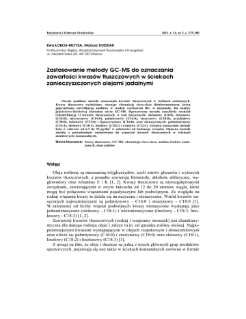 Inżynieria i Ochrona Środowiska 2011, t. 14, nr 3, s. 275-280 Ewa ŁOBOS-MOYSA, Mariusz DUDZIAK Politechnika Śląska, Wydział Inżynierii Środowiska i Energetyki ul. Akademicka 2A, 44-100 Gliwice Zastosowanie metody GC-MS do oznaczania zawartości kwasów tłuszczowych w ściekach zanieczyszczonych olejami jadalnymi Ocenie poddano metodę oznaczania kwasów tłuszczowych w ściekach zaolejonych. Kwasy tłuszczowe wydzielano, stosując ekstrakcję ciecz-ciecz dichlorometanem, którą poprzedzono estryfikacją analitów w wodzie roztworem BF3 w metanolu. Do analizy jakościowo-ilościowej ekstraktu użyto GC-MS. Opracowana metoda umożliwia rozdział i identyfikację 12 kwasów tłuszczowych, w tym nasyconych: oktanowy (C8:0), dekanowy (C10:0), mirystynowy (C14:0), palmitynowy (C16:0), stearynowy (C18:0), arachidowy (C20:0), behenowy (C22:0) i lignocerynowy (C24:0), oraz nienasyconych: palmitoleinowy (C16:1), oleinowy (C18:1), linolowy (C18:2) i erukowy (C22:1). Granica oznaczenia metody była w zakresie od 6,3 do 35 µg/dm3 w zależności od badanego związku. Opisana metoda została z powodzeniem zastosowana do oznaczeń kwasów tłuszczowych w ściekach modelowych i komunalnych. Słowa kluczowe: kwasy tłuszczowe, GC-MS, ekstrakcja ciecz-ciecz, analiza ścieków zaolejonych, oleje jadalne Wstęp Oleje roślinne są mieszaniną trójglicerydów, czyli estrów glicerolu i wyższych kwasów tłuszczowych, a ponadto zawierają fitosterole, alkohole alifatyczne, węglowodory oraz witaminy E i K [1, 2]. Kwasy tłuszczowe są nierozgałęzionymi związkami, zawierającymi w swym łańcuchu od 12 do 20 atomów węgla, które mogą być połączone wiązaniami pojedynczymi lub podwójnymi. Ze względu na rodzaj wiązania kwasy te dzielą się na nasycone i nienasycone. Wśród kwasów nasyconych najważniejszymi są palmitynowy - C16:0 i stearynowy - C18:0 [1]. W zależności od liczby wiązań podwójnych kwasy nienasycone występują jako jednonienasycone (oleinowy - C18:1) i wielonienasycone (linolowy - C18:2, linolenowy - C18:3) [1, 2]. Zawartość kwasów tłuszczowych (rodzaj i wzajemny stosunek) jest charakterystyczna dla danego rodzaju oleju i zależy m.in. od gatunku rośliny oleistej. Najpopularniejszymi kwasami występującymi w olejach rzepakowym i słonecznikowym oraz oliwie są: palmitynowy (C16:0) i stearynowy (C18:0) oraz oleinowy (C18:1), linolowy (C18:2) i linolenowy (C18:3) [3]. Z uwagi na fakt, że oleje i tłuszcze są jedną z trzech głównych grup produktów spożywczych, pojawiają się one także w ściekach komunalnych zarówno w formie 276 E. Łobos-Moysa, M. Dudziak niezmienionej, jak i zmienionej, np. po termicznej obróbce. Oleje i tłuszcze stanowią jeden z głównych składników substancji organicznych w ściekach komunalnych określanych poprzez ChZT [4, 5]. Po osadniku wstępnym zawartość tych zanieczyszczeń może wahać się w granicach od 7 do 45% zanieczyszczeń oznaczanych jako ChZT [6]. Najczęściej oznaczanymi w ściekach komunalnych kwasami tłuszczowymi są: mirystynowy, oleinowy, palmitynowy [7]. Zawarte w ściekach oleje ulegają biodegradacji w warunkach beztlenowych i tlenowych [4]. Jako wskaźniki stopnia biodegradacji, oprócz wskaźnika BZT5 oraz stosunku BZT5/ChZT, mogą być wykorzystane zanieczyszczenia specyficzne, tj. wyższe kwasy tłuszczowe [8]. Biorąc powyższe pod uwagę, istotnym zadaniem jest opracowanie procedury oznaczania kwasów tłuszczowych w ściekach zanieczyszczonych olejami, co jest celem niniejszej pracy. 1. Metodyka badań Kwasy tłuszczowe w środowisku wodnym oznaczono, stosując do ich wydzielenia metodę ekstrakcji ciecz-ciecz (LLE), natomiast do analizy jakościowo-ilościowej ekstraktu analizę GC-MS. Przed wydzielaniem anality poddawano derywatyzacji. W badaniach wykorzystano system analityczny Saturn 2100 T firmy Varian, w skład którego wchodził kapilarny chromatograf gazowy GC sprzężony on-line ze spektrometrem mas typu ion trap. Chromatograf wyposażono w kapilarną kolumnę chromatograficzną SLBTM–5ms o wymiarach 30 m×0,25 mm i grubości fazy stacjonarnej 0,25 µm firmy Varian. Jako gaz nośny zastosowano hel (5 N). Temperatura pułapki jonowej i źródła jonów wynosiła 200°C. Badane związki oznaczono po ich wcześniejszym upochodnieniu, które miało na celu zwiększenie czułości analizy. Mikrozanieczyszczenia wyekstrahowano z próbki wodnej o objętości 10 cm3 i pH = 1 chlorkiem metylenu (w stosunku 1:10), po wcześniejszej estryfikacji roztworem metanolu w obecności BF3 jako katalizatora reakcji. Próbkę zakwaszano roztworem HCl (2 mol/dm3). Ekstrakt analizowano w zakresie temperatury pieca chromatograficznego od 80 do 280°C (temp. dawkownika 280°C). Analizę ilościową prowadzono, rejestrując jony w zakresie m/z = 40÷400. Wzorce kwasów tłuszczowych, tj. kwasy oktanowy (C8:0), dekanowy (C10:0), mirystynowy (C14:0), palmitoleinowy (C16:1), palmitynowy (C16:0), linolowy (C18:2), oleinowy (C18:1), stearynowy (C18:0), arachidowy (C20:0), erukowy (C22:1), behenowy (C22:0), lignocerynowy (C24:0) o stężeniu wzorców w zakresie 1,1÷0,5 mg/cm3 w metanolu, oraz mieszanina do upochodnienia (BF3/metanol 14%) pochodziły z firmy Sigma-Aldrich. Do badań użyto dwóch roztworów wzorcowych wody zdejonizowanej z wzorcami kwasów tłuszczowych o różnej zawartości, po 1000 µg/dm3 każdego z wzorców w jednym roztworze, a w drugim po 500 µg/dm3. W końcowym etapie badań przeprowadzono oznaczenie kwasów tłuszczowych w ściekach komunalnych (oczyszczalnia mechaniczno-biologiczna z terenu województwa śląskiego) i modelowych zanieczyszczonych olejem rzepa- 277 Zastosowanie metody GC-MS do oznaczania zawartości kwasów tłuszczowych w ściekach … kowym. Ścieki modelowe były przygotowywane zgodnie z PN-87 C-04616/10 i zawierały bulion wzbogacony, skrobię, mocznik, octan sodu oraz związki mineralne. Dodatkowo ścieki zawierały zanieczyszczenie specyficzne w postaci emulsji 