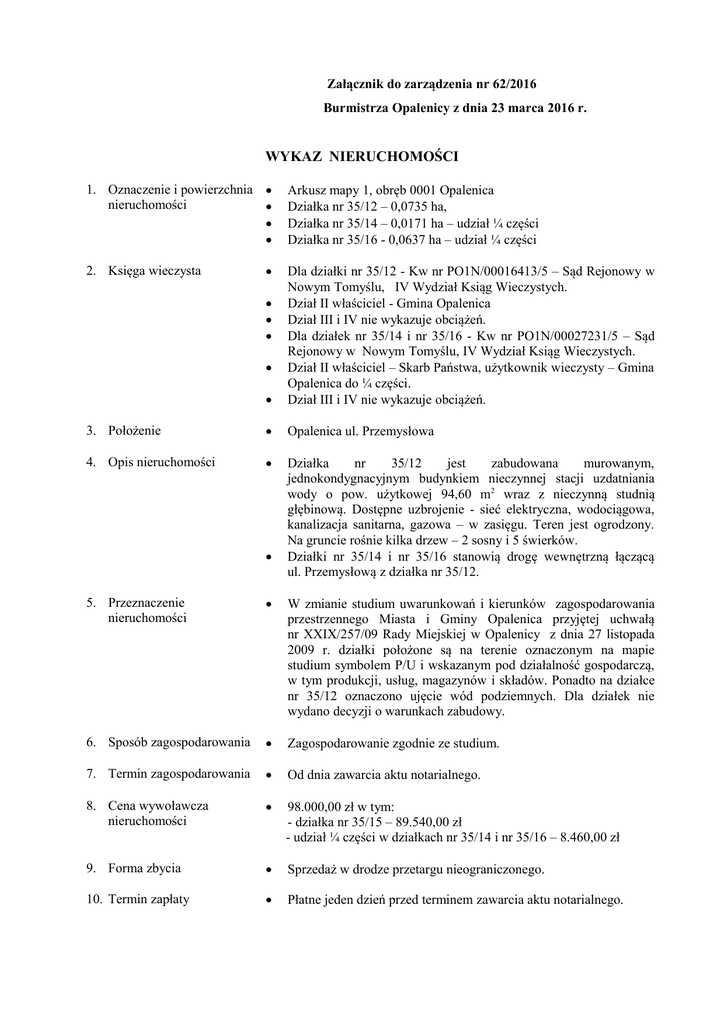 Załącznik do zarządzenia nr 62/2016 Burmistrza Opalenicy z dnia 23 marca 2016 r. WYKAZ NIERUCHOMOŚCI 1. Oznaczenie i powierzchnia · nieruchomości · · · 2. Księga wieczysta · Arkusz mapy 1, obręb 0001 Opalenica Działka nr 35/12 – 0,0735 ha, Działka nr 35/14 – 0,0171 ha – udział ¼ części Działka nr 35/16 - 0,0637 ha – udział ¼ części · Dla działki nr 35/12 - Kw nr PO1N/00016413/5 – Sąd Rejonowy w Nowym Tomyślu, IV Wydział Ksiąg Wieczystych. Dział II właściciel - Gmina Opalenica Dział III i IV nie wykazuje obciążeń. Dla działek nr 35/14 i nr 35/16 - Kw nr PO1N/00027231/5 – Sąd Rejonowy w Nowym Tomyślu, IV Wydział Ksiąg Wieczystych. Dział II właściciel – Skarb Państwa, użytkownik wieczysty – Gmina Opalenica do ¼ części. Dział III i IV nie wykazuje obciążeń. 3. Położenie · Opalenica ul. Przemysłowa 4. Opis nieruchomości · Działka nr 35/12 jest zabudowana murowanym, jednokondygnacyjnym budynkiem nieczynnej stacji uzdatniania wody o pow. użytkowej 94,60 m2 wraz z nieczynną studnią głębinową. Dostępne uzbrojenie - sieć elektryczna, wodociągowa, kanalizacja sanitarna, gazowa – w zasięgu. Teren jest ogrodzony. Na gruncie rośnie kilka drzew – 2 sosny i 5 świerków. Działki nr 35/14 i nr 35/16 stanowią drogę wewnętrzną łączącą ul. Przemysłową z działka nr 35/12. · · · · · 5. Przeznaczenie nieruchomości · W zmianie studium uwarunkowań i kierunków zagospodarowania przestrzennego Miasta i Gminy Opalenica przyjętej uchwałą nr XXIX/257/09 Rady Miejskiej w Opalenicy z dnia 27 listopada 2009 r. działki położone są na terenie oznaczonym na mapie studium symbolem P/U i wskazanym pod działalność gospodarczą, w tym produkcji, usług, magazynów i składów. Ponadto na działce nr 35/12 oznaczono ujęcie wód podziemnych. Dla działek nie wydano decyzji o warunkach zabudowy. 6. Sposób zagospodarowania · Zagospodarowanie zgodnie ze studium. 7. Termin zagospodarowania · Od dnia zawarcia aktu notarialnego. 8. Cena wywoławcza nieruchomości · 98.000,00 zł w tym: - działka nr 35/15 – 89.540,00 zł - udział ¼ części w działkach nr 35/14 i nr 35/16 – 8.460,00 zł 9. Forma zbycia · Sprzedaż w drodze przetargu nieograniczonego. 10. Termin zapłaty · Płatne jeden dzień przed terminem zawarcia aktu notarialnego. 11. Pierwszeństwo w nabyciu nieruchomości na podstawie art. 34 ust.1 pkt 1 i 2 ustawy o gospodarce nieruchomościami · Wniosek należy złożyć do dnia 4 maja 2016 r.