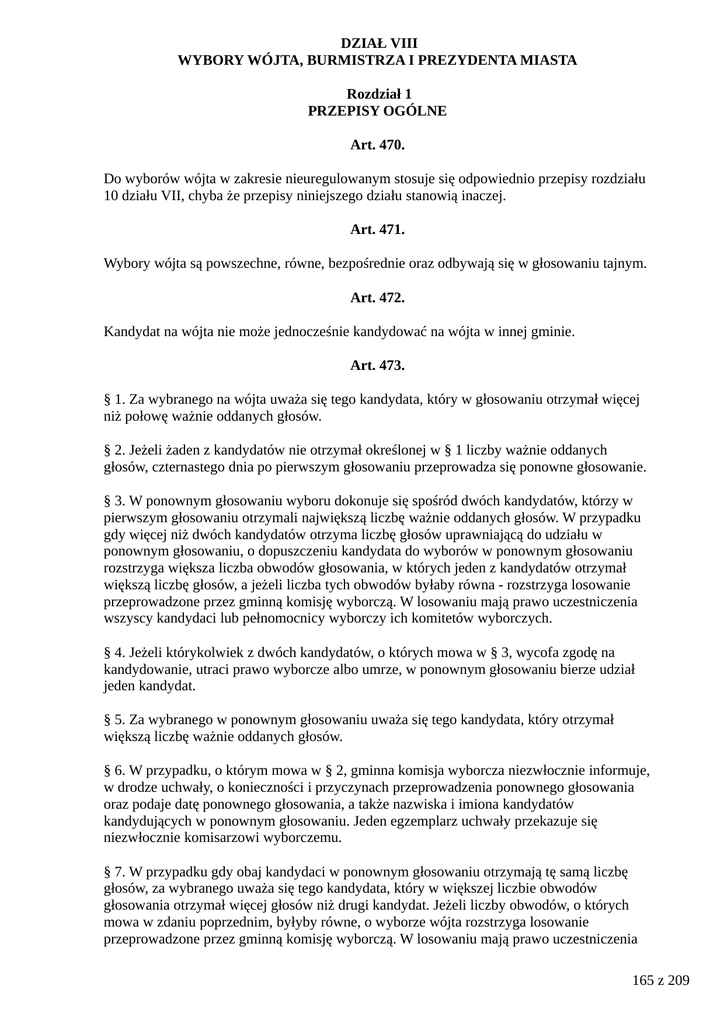 DZIAŁ VIII WYBORY WÓJTA, BURMISTRZA I PREZYDENTA MIASTA Rozdział 1 PRZEPISY OGÓLNE Art. 470. Do wyborów wójta w zakresie nieuregulowanym stosuje się odpowiednio przepisy rozdziału 10 działu VII, chyba że przepisy niniejszego działu stanowią inaczej. Art. 471. Wybory wójta są powszechne, równe, bezpośrednie oraz odbywają się w głosowaniu tajnym. Art. 472. Kandydat na wójta nie może jednocześnie kandydować na wójta w innej gminie. Art. 473. § 1. Za wybranego na wójta uważa się tego kandydata, który w głosowaniu otrzymał więcej niż połowę ważnie oddanych głosów. § 2. Jeżeli żaden z kandydatów nie otrzymał określonej w § 1 liczby ważnie oddanych głosów, czternastego dnia po pierwszym głosowaniu przeprowadza się ponowne głosowanie. § 3. W ponownym głosowaniu wyboru dokonuje się spośród dwóch kandydatów, którzy w pierwszym głosowaniu otrzymali największą liczbę ważnie oddanych głosów. W przypadku gdy więcej niż dwóch kandydatów otrzyma liczbę głosów uprawniającą do udziału w ponownym głosowaniu, o dopuszczeniu kandydata do wyborów w ponownym głosowaniu rozstrzyga większa liczba obwodów głosowania, w których jeden z kandydatów otrzymał większą liczbę głosów, a jeżeli liczba tych obwodów byłaby równa - rozstrzyga losowanie przeprowadzone przez gminną komisję wyborczą. W losowaniu mają prawo uczestniczenia wszyscy kandydaci lub pełnomocnicy wyborczy ich komitetów wyborczych. § 4. Jeżeli którykolwiek z dwóch kandydatów, o których mowa w § 3, wycofa zgodę na kandydowanie, utraci prawo wyborcze albo umrze, w ponownym głosowaniu bierze udział jeden kandydat. § 5. Za wybranego w ponownym głosowaniu uważa się tego kandydata, który otrzymał większą liczbę ważnie oddanych głosów. § 6. W przypadku, o którym mowa w § 2, gminna komisja wyborcza niezwłocznie informuje, w drodze uchwały, o konieczności i przyczynach przeprowadzenia ponownego głosowania oraz podaje datę ponownego głosowania, a także nazwiska i imiona kandydatów kandydujących w ponownym głosowaniu. Jeden egzemplarz uchwały przekazuje się niezwłocznie komisarzowi wyborczemu. § 7. W przypadku gdy obaj kandydaci w ponownym głosowaniu otrzymają tę samą liczbę głosów, za wybranego uważa się tego kandydata, który w większej liczbie obwodów głosowania otrzymał więcej głosów niż drugi kandydat. Jeżeli liczby obwodów, o których mowa w zdaniu poprzednim, byłyby równe, o wyborze wójta rozstrzyga losowanie przeprowadzone przez gminną komisję wyborczą. W losowaniu mają prawo uczestniczenia 165 z 209 obaj kandydaci lub pełnomocnicy wyborczy ich komitetów wyborczych. § 8. Tryb przeprowadzania losowania, o którym mowa w § 3 i 7, określa Państwowa Komisja Wyborcza. Art. 474. § 1. Wybory wójtów zarządza Prezes Rady Ministrów, w drodze rozporządzenia, łącznie z wyborami do rad gmin, w trybie określonym w art. 371. § 2. W razie konieczności przeprowadzenia wyborów wójta przed upływem kadencji z przyczyn określonych w ustawach, Prezes Rady Ministrów zarządza, w drodze rozporządzenia, wybory przedterminowe w trybie określonym w art. 371, z zastrzeżeniem § 3. § 3. Jeżeli uchwała rady albo postanowienie komisarza wyborczego o wygaśnięciu mandatu wójta zostały zaskarżone do sądu administracyjnego, wybory przedterminowe wójta zarządza się i przeprowadza w ciągu 60 dni od dnia uprawomocnienia się wyroku sądu administracyjnego oddalającego skargę. Art. 475. § 1. Państwowa Komisja Wyborcza i komisarze wyborczy organizują wybory wójtów i sprawują nadzór nad ich przebiegiem zgodnie z przepisami prawa. § 2. Wybory przeprowadzają komisje powołane do przeprowadzenia wyborów do rad gmin. § 3. W przypadku wyborów przedterminowych, w których wybiera się tylko wójta, powołuje się gminną komisję wyborczą i obwodowe komisje wyborcze. Art. 476. § 1. Limity wydatków w przypadku komitetów wyborczych, które zarejestrowały kandydata na wójta, ulegają powiększeniu o kwotę ustaloną na zasadach określonych w § 4. § 2. Pełnomocnik finansowy komitetu wyborczego, którego zarówno kandydat na wójta, jak też lista kandydatów na radnych zostały zarejestrowane, sporządza łączne sprawozdanie finansowe o źródłach pozyskanych funduszy oraz poniesionych wydatkach na cele wyborcze. § 3. Minister właściwy do spraw finansów publicznych, po zasięgnięciu opinii Państwowej Komisji Wyborczej określi, w drodze rozporządzenia, wzór łącznego sprawozdania, o którym mowa w § 2, oraz szczegółowy zakres zawartych w nim informacji, a także wykaz rodzajów dokumentów, jakie należy załączyć do sprawozdania, tak aby umożliwiały weryfikację podanych w sprawozdaniu informacji, mając na względzie zapewnienie pełnej informacji o przychodach i wydatkach komitetu wyborczego oraz jej przejrzystości. § 4. Limit wydatków związanych z prowadzeniem kampanii wyborczej kandydata na wójta w gminach liczących do 500000 mieszkańców ustala się mnożąc liczbę mieszkańców danej gminy przez kwotę 60 groszy, a w gminach liczących powyżej 500000 mieszkańców mnożąc pierwsze 500000 mieszkańców przez kwotę 60 groszy, a nadwyżkę ponad 500000 mieszkańców - przez kwotę 30 groszy. § 5. Komisarz wyborczy w terminie 7 dni od dnia ogłoszenia rozporządzenia o zarządzeniu wyborów podaje do publicznej wiadomości, w formie komunikatu w dzienniku o zasięgu 166 z 209 wojewódzkim, liczbę mieszkańców w poszczególnych gminach według stanu na koniec roku poprzedzającego rok, w którym wybory są przeprowadzane. Art. 477. § 1. Państwowa Komisja Wyborcza ogłasza w Dzienniku Ustaw Rzeczypospolitej Polskiej oraz podaje do publicznej wiadomości, w formie obwieszczenia, zbiorcze wyniki wyborów wójtów na obszarze kraju. § 2. Przepis § 1 stosuje się odpowiednio w przypadku ponownego głosowania w wyborach wójtów, o którym mowa w art. 