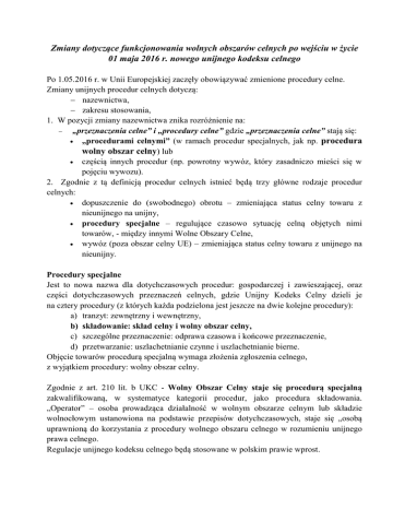 Zmiany dotyczące funkcjonowania wolnych obszarów celnych po wejściu w życie 01 maja 2016 r. nowego unijnego kodeksu celnego Po 1.05.2016 r. w Unii Europejskiej zaczęły obowiązywać zmienione procedury celne. Zmiany unijnych procedur celnych dotyczą: nazewnictwa, zakresu stosowania, 1. W pozycji zmiany nazewnictwa znika rozróżnienie na: „przeznaczenia celne” i „procedury celne” gdzie „przeznaczenia celne” stają się: „procedurami celnymi” (w ramach procedur specjalnych, jak np. procedura wolny obszar celny) lub częścią innych procedur (np. powrotny wywóz, który zasadniczo mieści się w pojęciu wywozu). 2. Zgodnie z tą definicją procedur celnych istnieć będą trzy główne rodzaje procedur celnych: dopuszczenie do (swobodnego) obrotu – zmieniająca status celny towaru z nieunijnego na unijny, procedury specjalne – regulujące czasowo sytuację celną objętych nimi towarów, - między innymi Wolne Obszary Celne, wywóz (poza obszar celny UE) – zmieniająca status celny towaru z unijnego na nieunijny. Procedury specjalne Jest to nowa nazwa dla dotychczasowych procedur: gospodarczej i zawieszającej, oraz części dotychczasowych przeznaczeń celnych, gdzie Unijny Kodeks Celny dzieli je na cztery procedury (z których każda podzielona jest jeszcze na dwie kolejne procedury): a) tranzyt: zewnętrzny i wewnętrzny, b) składowanie: skład celny i wolny obszar celny, c) szczególne przeznaczenie: odprawa czasowa i końcowe przeznaczenie, d) przetwarzanie: uszlachetnianie czynne i uszlachetnianie bierne. Objęcie towarów procedurą specjalną wymaga złożenia zgłoszenia celnego, z wyjątkiem procedury: wolny obszar celny. Zgodnie z art. 210 lit. b UKC - Wolny Obszar Celny staje się procedurą specjalną zakwalifikowaną, w systematyce kategorii procedur, jako procedura składowania. „Operator” – osoba prowadząca działalność w wolnym obszarze celnym lub składzie wolnocłowym ustanowiona na podstawie przepisów dotychczasowych, staje się „osobą uprawnioną do korzystania z procedury wolnego obszaru celnego w rozumieniu unijnego prawa celnego. Regulacje unijnego kodeksu celnego będą stosowane w polskim prawie wprost. Zgoda na prowadzenie działalności w Wolnym Obszarze Celnym udzielona na podstawie dotychczasowych przepisów zachowuje swoją ważność po 01.05.2016 r. Ważność zachowują ewidencje towarowe prowadzone w WOC, ale stosowanie procedury specjalnej wolnego obszaru celnego, jak i zamknięcie procedur wolnego obszaru celnego odbywa się już na podstawie nowego prawa unijnego. Zgoda na prowadzenie działalności w wolnym obszarze celnym lub składzie wolnocłowym udzielona na podstawie przepisów dotychczasowych będzie podlegać ponownej ocenie przez organ celny. W wyniku ponownej oceny dokonanej przez organ celny – jeśli spełnione będą warunki określone w przepisach prawa celnego – zostanie wydane nowa zgoda na prowadzenie działalności w wolnym obszarze celnym. Zgodnie z art. 250 ust. 1 rozporządzenia delegowanego, organ celny jest zobowiązany do przeprowadzenia ponownej oceny i wydania rozstrzygnięcia w sprawie przed dniem 1 maja 2019 r. Ponowna ocena i wydanie rozstrzygnięcia na prowadzenie działalności lub cofnięcie jej, ma nastąpić w terminie do 01.05.2019 r. – szansa dla istniejących upoważnionych przedsiębiorców (AEO). Zgodnie z UKC z dniem 01.05.2016 ulega likwidacji instytucja pozwolenia na korzystanie z procedury składu celnego. Wyroby akcyzowe. Zgodnie ze zmianami ustawy o akcyzie, obecnie wyroby akcyzowe mogą być bez znaków akcyzy umieszczone w wolnym obszarze celnym pod warunkiem pisemnego powiadomienia właściwego naczelnika urzędu celnego przed dniem umieszczenia wyrobów akcyzowych w składzie wolnocłowym. Zmiany mają także dotyczyć wymianie informacji między organami celnymi a przedsiębiorcami – wymiana będzie odbywać się tylko za pomocą technik elektronicznego przetwarzania danych. Wszelkie transakcje celne będą prowadzone drogą elektroniczną - i co za tym idzie - także przechowywanie danych transakcyjnych. Elektroniczna wymiana informacji odbywać się będzie przez Platformę Usług Elektronicznych Służby Celnej – szansa dla WOC mających dobre łącza internetowe z Urzędem Celnym.