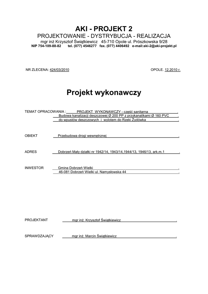 AKI - PROJEKT 2 PROJEKTOWANIE - DYSTRYBUCJA - REALIZACJA mgr inŜ Krzysztof Świątkiewicz 45-710 Opole ul. Prószkowska 9/28 NIP 754-109-88-82 tel. (077) 4546277 fax. (077) 4406492 e-mail:[email protected] NR ZLECENA: 424/03/2010 OPOLE. 12.2010 r. Projekt wykonawczy TEMAT OPRACOWANIA : PROJEKT WYKONAWCZY - część sanitarna Budowa kanalizacji deszczowej Ø 200 PP z przykanalikami Ø 160 PVC do wpustów deszczowych i wylotem do Rzeki śydówka . . . OBIEKT Przebudowa drogi wewnętrznej . ADRES Dobrzeń Mały działki nr 1942/14, 1943/14,1944/13, 1946/13, ark.m.1 . INWESTOR Gmina Dobrzeń Wielki 46-081 Dobrzeń Wielki ul. Namysłowska 44 . . PROJEKTANT mgr inŜ. Krzysztof Świątkiewicz . SPRAWDZAJĄCY mgr inŜ. Marcin Świątkiewicz . Przebudowa drogi wewnętrznej dz. nr 1942/14, 1943/14, 1944/13, 1946/13 w m. Dobrzeń Mały Budowa kanalizacji deszczowej z przykanalikami do wpustów deszczowych SPIS ZAWARTOŚCI OPRACOWANIA A. OPIS TECHNICZNY 1. Podstawa opracowania 2. Cel i zakres opracowania 3. Dane ogólne 4. Bilans ścieków deszczowych 5. Podstawowe dane o inwestycji 5a. Zakres inwestycji wg właściwości wojewody opolskiego / w granicach działki nr 1535/59 / 6. Kanalizacja deszczowa 7. Wylot do cieku 8. Przykanaliki kanalizacji deszczowej odwadniającej projektowaną jezdnię 9. Kolizja z istniejącą studzienką kanalizacji deszczowej 10. Zabezpieczenie istniejącego uzbrojenia podziemnego 11. Regulacja istniejącego uzbrojenia 12. Ochrona środowiska 13. Technologia i organizacja robót 13.1. Roboty przygotowawcze 13.2. Roboty ziemne 13.3. Roboty montaŜowe 13.4. Odwodnienie wykopów 13.5. Roboty zabezpieczające i pomocnicze 14. Uwagi końcowe B. UZGODNIENIA 1. Warunki techniczne podłączenia i zapewnienie odbioru ścieków wydane przez Wojewódzki Zarząd Melioracji i Urządzeń Wodnych nr KE-4100/48/5123/2010 z dn. 25.11.2010 r. 2. Opinia nr GK. 7442 - 1010./2010 uzgodnienia dokumentacji projektowej z dn. 10.12.2010 r wydana przez Starostwo Powiatowe w Opolu Powiatowy Zespół Uzgadniania Dokumentacji Projektowych Opole pl. Wolności 7 3. Uzgodnienie Zarządu Dróg Wojewódzkich nr ZDW-WD-pu-4031/162/2010 z dn. 08.12.2010 r C. CZĘŚĆ RYSUNKOWA 1. Plan zbiorczy uzbrojenia terenu 2. Profil podłuŜny kanalizacji deszczowej 3. Przekrój poprzeczny cieku - Rzeki śydówka w km 13+918 4. Wylot boczny do cieku 5. Zestawienie wpustów deszczowych skala 1:500 skala 1:100/500 skala 1:50 - Przebudowa drogi wewnętrznej dz. nr 1942/14, 1943/14, 1944/13, 1946/13 w m. Dobrzeń Mały Budowa kanalizacji deszczowej z przykanalikami do wpustów deszczowych OPIS TECHNICZNY DO PROJEKTU WYKONAWCZEGO - CZĘŚĆ SANITARNA BUDOWA KANALIZACJI DESZCZOWEJ Z PRZYKANALIKAMI DO WPUSTÓW DESZCZOWYCH PRRZEBUDOWA DROGI WEWNĘTRZNEJ DZ. NR 1942/14, 1943/14, 1944/13, 1946/13 W MIEJSCOWOŚCI DOBRZEŃ MAŁY 1. PODSTAWA OPRACOWANIA - Zlecenie Inwestora - Plan sytuacyjno-wysokościowy w skali 1:500 - Projekt przebudowy drogi wewnętrznej dz. nr 1942/14, 1943/14, 1944/13, 1946/13 w Dobrzeniu Małym - część drogowa - opracowanie PROTOR Opole - Opis warunków geotechnicznych podłoŜa budowlanego terenu lokalizacji drogi wewnętrznej obejmującej działki 1942/14 i 1943/14 w miejscowości Dobrzeń Mały - opracowanie Usługi Geologiczne J. Gola Opole - Warunki techniczne podłączenia i zapewnienie odbioru ścieków wydane przez Wojewódzki Zarząd Melioracji i Urządzeń Wodnych w Opolu nr KE-4100/48/5123/2010 r. - Wizja lokalna w terenie - Obowiązujące przepisy i normy 2. CEL I ZAKRES OPRACOWANIA Celem opracowania jest sporządzenie projektu budowlanego część sanitarna przebudowy drogi wewnętrznej obejmującej działki nr 1942/14, 1943/14, 1944/13, 1946/13 w m. Dobrzeń Mały. Zakres niniejszego opracowania obejmuje projekt budowy kanalizacji deszczowej z przykanalikami do wpustów deszczowych i odprowadzeniem do cieku melioracji podstawowej - Rzeki śydówka. 3. DANE OGÓLNE Teren przewidzianej do przebudowy drogi wewnętrznej zlokalizowany jest w północnej części miejscowości Dobrzeń Mały w prawo od drogi wojewódzkiej nr 454 / ul. Opolska /. Przebudowywana droga wewnętrzna z jednostronną zabudową mieszkaniową posiada podstawowe uzbrojenie podziemne: sieć kanalizacji sanitarnej i sieć wodociągową oraz linie energetyczne i telekomunikacyjne. W drodze brak jest kanalizacji deszczowej. W pasie drogowym drogi wojewódzkiej nr 454 Opole - Namysłów zlokalizowane są; kanalizacja deszczowa, kanalizacja sanitarna, wodociąg, linie i sieci energetyczne i telekomunikacyjne Wszystkie rodzaje uzbrojenia naniesiono na mapie sytuacyjno-wysokościowej. Nie wyklucza się istnienia w terenie urządzeń podziemnych nie wykazanych na mapach. Badania geologiczne wykazały Ŝe pod warstwą tłucznia i grysu oraz podsypki piaskowej zalega warstwa nasypu niekontrolowanego złoŜonego głównie z gleby Ŝwiru i okruchów cegły. PoniŜej podłoŜe budowlane stanowią piaski gliniaste i gliny piaszczyste ze Ŝwirem. Nawiercono równieŜ piasek gruboziarnistymi ze Ŝwirem. PoniŜej stwierdzono stropową cześć utworów kredy górnj w postaci zwietrzałej jako glina marglista z okruchami margla przechodzącą głębiej w rumosz margla z domieszka gliny .Stwierdzono występowanie wody gruntowej na głębokości 1,1-1,2 m p.p.terenu.. 4. BILANS ŚCIEKÓW DESZCZOWYCH Miarodajny obliczeniowy spływ ścieków opadowych Q = φ x ψ x q x F= 1,0 x 0,9 x 126 x 0,0918 = 10,4 l/s gdzie F - powierzchnia terenu w granicach opracowania F = 0,0918 ha φ – współczynnik opóźnienia odpływu φ = 1/ n F n = 6 dla zlewni w warunkach przeciętnych, dla zlewni małych Przebudowa drogi wewnętrznej dz. nr 1942/14, 1943/14, 1944/13, 1946/13 w m. Dobrzeń Mały Budowa kanalizacji deszczowej z przykanalikami do wpustów deszczowych przyjmuje się φ = 1,0 ψ – współczynnik spływu zaleŜny od szczelności powierzchni przyjęto dla nawierzchni drogowej asfaltowej ψ = 0.9 q – natęŜenie deszczu miarodajnego q = 126 l/s/h