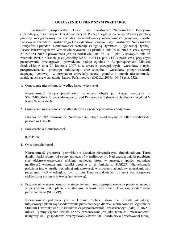 OGŁOSZENIE O PIERWSZYM PRZETARGU Państwowe Gospodarstwo Leśne Lasy Państwowe Nadleśnictwo Henryków (Sprzedający) z siedzibą w Henrykowie przy ul. Polnej 5, ogłasza pierwszy ofertowy przetarg pisemny nieograniczony na sprzedaż niezabudowanej nieruchomości gruntowej Skarbu Państwa w zarządzie Państwowego Gospodarstwa Leśnego Lasy Państwowe Nadleśnictwa Henryków. Sprzedaż nieruchomości następuje za zgodą Dyrektora Regionalnej Dyrekcji Lasów Państwowych we Wrocławiu wyrażoną na piśmie z dnia 30.09.2015 r. znak sprawy ZS.2281.51.2015 i prowadzona jest na podstawie art. 38 ust. 1 pkt. 3 ustawy z dnia 28 września 1991 r. o lasach (tekst jednolity DZ.U. z 2014 r. poz. 1153 z późn. zm.), przy czym postępowanie przetargowe prowadzone będzie zgodnie z Rozporządzeniem Ministra Środowiska z dnia 20 kwietnia 2007 r. w sprawie szczegółowych warunków i trybu przeprowadzania przetargu publicznego oraz sposobu i warunków przeprowadzania negocjacji cenowej w przypadku sprzedaży lasów, gruntów i innych nieruchomości znajdujących się w zarządzie Lasów Państwowych (DZ.U.z 2007r. Nr 78 poz. 532). 1. Oznaczenie nieruchomości według księgi wieczystej. Nieruchomość będąca przedmiotem sprzedaży objęta jest księgą wieczystą nr SW1Z/00056481/3 prowadzoną przez Sąd Rejonowy w Ząbkowicach Śląskich Wydział V Ksiąg Wieczystych. 2. Oznaczenie nieruchomości według danych z ewidencji gruntów i budynków. Działka nr 589 położona w Niedźwiedziu, obręb ewidencyjny nr 0015 Niedźwiedź, pastwisko klasy III. 3. Powierzchnia nieruchomości. 0,0645 ha 4. Opis nieruchomości. Nieruchomość gruntowa (pastwisko) o kształcie nieregularnym, funkcjonalnym. Teren działki płaski równy, od strony zaplecza rów melioracyjny. Nad częścią działki przebiega sieć elektro-energetyczna niskiego napięcia, która w znaczący sposób ogranicza możliwość wykorzystania działki zgodnie z jej funkcją w SUiKZP. Nieruchomość położona jest w strefie pośredniej miejscowości, w otoczeniu zabudowy mieszkaniowej, przystanek PKS w odległości ok. 0,1 km. Działka z dostępem do sieci wodociągowej, elektrycznej i drogi asfaltowej (powiatowej). 5. Przeznaczenie nieruchomości w miejscowym planie zagospodarowania przestrzennego, a w przypadku braku planu - w studium uwarunkowań i kierunków zagospodarowania przestrzennego (SUiKZP). Nieruchomość położona jest w Gminie Ziębice, która nie posiada aktualnego miejscowego planu zagospodarowania przestrzennego dla ww. nieruchomości. Zgodnie ze Studium Uwarunkowań i Kierunków Zagospodarowania Przestrzennego (dalej: SUiKZP) miasta i gminy Ziębice działka nr 589 przeznaczona jest jako teren 2a –mieszkaniowousługowy, 6a – gospodarczo-przemysłowy. Obszar IIB – osadniczy o preferowanej funkcji rolniczej i przetwórstwa rolnego. Działka położona na obszarze o szczególnym zagrożeniu powodziowym. Dla ww. działki po roku 2004 nie została wydana decyzja o warunkach zabudowy. 6. Sposób zagospodarowania nieruchomości. W części jako teren zieleni z drzewami leśnymi, w pozostałej części przyległej do sąsiadującej działki nr 584 jako teren zieleni ogrodowej. 7. Nieruchomość wolna jest od obciążeń. 8. Nieruchomość wolna jest od zobowiązań. 9. Nieruchomość nie jest wpisana do rejestru zabytków. 10. Cena wywoławcza nieruchomości. 3.200,00 zł (trzy tysiące dwieście złotych 00/100) netto. 11. Termin i miejsce, w których można się zapoznać z dodatkowymi informacjami dot. nieruchomości. Do 26 kwietnia 2016 r. w godz. od 7 do 15. Nadleśnictwo Henryków, ul. Polna 5, 57-210 Henryków, Sekretariat Nadleśnictwa. 12. Termin i miejsce przetargu. 27 kwietnia 2016 r. Nadleśnictwo Henryków, ul. Polna 5, 57-210 Henryków. Otwarcie ofert nastąpi o godz. 1000 27 kwietnia 2016 r. w pokoju nr 7 Nadleśnictwa. 13. Wysokość wadium, jego forma, termin i miejsce wniesienia. Wysokość wadium – 320,00 zł. Wadium może być wnoszone w pieniądzu lub w formie gwarancji bankowej. Wadium należy wnieść do dnia 27 kwietnia 2016 r. do godz. 930. Wadium wnoszone w pieniądzu należy wpłacić w kasie Nadleśnictwa lub na konto bankowe Nadleśnictwa – BGŻ Oddział w Ząbkowicach Śląskich 85 2030 0045 1110 0000 0229 6020. 14. Termin i miejsce składania pisemnych ofert. Oferty należy złożyć w terminie do 27 kwietnia 2016 r. do godz. 930 w sekretariacie Nadleśnictwa Henryków, ul. Polna 5, 57-210 Henryków. Pisemna oferta powinna zostać złożona w zaklejonej kopercie z dopiskiem „Przetarg na sprzedaż działki nr 589, nie otwierać przed dniem 27 kwietnia 2016 r. godz. 1000 ”. W przypadku ofert składanych drogą pocztową decyduje data i godzina doręczenia oferty do Nadleśnictwa. 15. Pisemna oferta powinna zawierać: 1) imię, nazwisko i adres albo nazwę firmę, siedzibę i adres oferenta, 2) numery PESEL, NIP i REGON oferenta, o ile spoczywa na nim obowiązek ich uzyskania, 3) nr rachunku bankowego oferenta, 4) datę sporządzenia oferty, 5) oferowaną cenę netto (cena nie może być mniejsza lub równa cenie wywoławczej), 6) sposób zapłaty ceny, 7) sposób proponowanego wykorzystania nieruchomości, 8) oświadczenie, że oferent zapoznał się z warunkami przetargu i przyjmuje te warunki bez zastrzeżeń, 9) oświadczenie o wyrażeniu zgody na przetwarzanie danych osobowych na potrzeby przeprowadzonego przetargu, 10) dowód wniesienia wadium 11) aktualny odpis z rejestru przedsiębiorców KRS lub aktualny wydruk z Centralnej Ewidencji i Informacji o Działalności Gospodarczej prowadzonej przez Ministra Gospodarki – jeżeli oferentem jest podmiot wpisany do ww. rejestru, przy czym za aktualny odpis uważany będzie dokument wydany nie wcześniej niż na 3 miesiące przed datą składania oferty. 16. Elementy oferty, które będą miały wpływ na jej ocenę. a) cena, b) sposób zapłaty ceny, c) sposób wykorzystania nieruchomości. 17. Sposób oceny elementów oferty. a) o