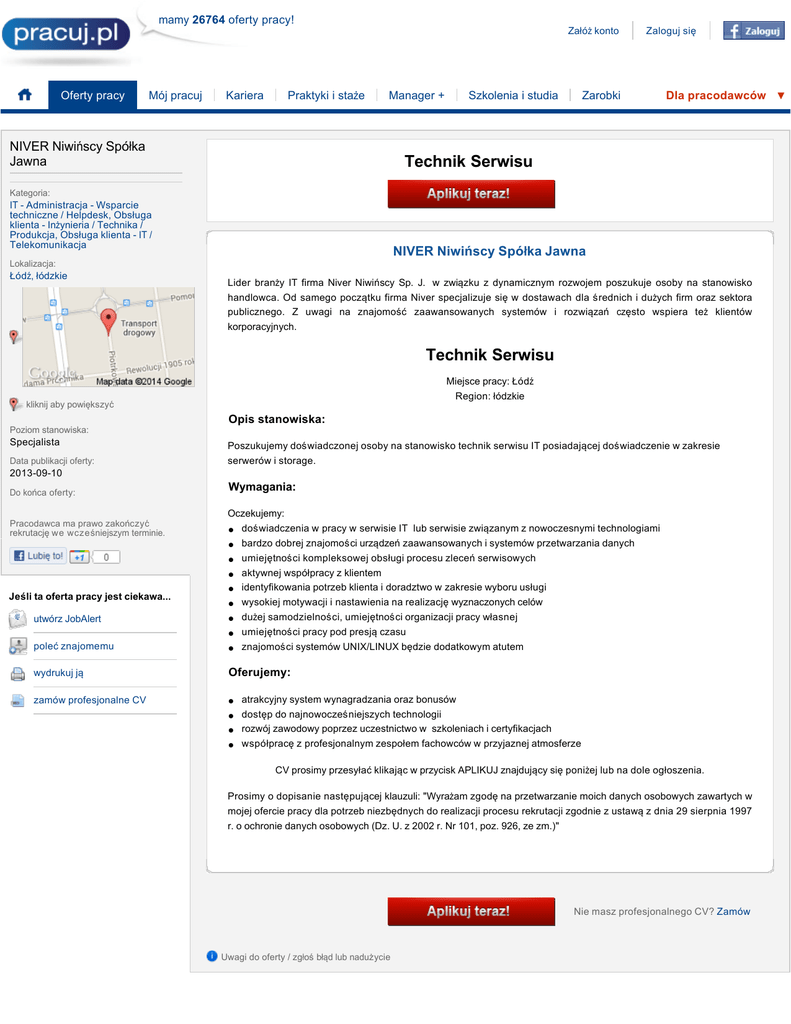 mamy 26764 oferty pracy! Załóż konto Oferty pracy Mój pracuj Kariera Praktyki i staże Manager + NIVER Niwińscy Spółka Jawna Szkolenia i studia Zaloguj się Zarobki Dla pracodawców ▼ Technik Serwisu Kategoria: IT - Administracja - Wsparcie techniczne / Helpdesk, Obsługa klienta - Inżynieria / Technika / Produkcja, Obsługa klienta - IT / Telekomunikacja NIVER Niwińscy Spółka Jawna Lokalizacja: Łódź, łódzkie Lider branży IT firma Niver Niwińscy Sp. J. w związku z dynamicznym rozwojem poszukuje osoby na stanowisko handlowca. Od samego początku firma Niver specjalizuje się w dostawach dla średnich i dużych firm oraz sektora publicznego. Z uwagi na znajomość zaawansowanych systemów i rozwiązań często wspiera też klientów korporacyjnych. Technik Serwisu Miejsce pracy: Łódź Region: łódzkie kliknij aby powiększyć Opis stanowiska: Poziom stanowiska: Specjalista Poszukujemy doświadczonej osoby na stanowisko technik serwisu IT posiadającej doświadczenie w zakresie Data publikacji oferty: serwerów i storage. 2013-09-10 Do końca oferty: Pracodawca ma prawo zakończyć rekrutację we wcześniejszym terminie. Wymagania: Oczekujemy: ● doświadczenia w pracy w serwisie IT lub serwisie związanym z nowoczesnymi technologiami ● bardzo dobrej znajomości urządzeń zaawansowanych i systemów przetwarzania danych ● ● ● Jeśli ta oferta pracy jest ciekawa... utwórz JobAlert ● ● ● umiejętności kompleksowej obsługi procesu zleceń serwisowych aktywnej współpracy z klientem identyfikowania potrzeb klienta i doradztwo w zakresie wyboru usługi wysokiej motywacji i nastawienia na realizację wyznaczonych celów dużej samodzielności, umiejętności organizacji pracy własnej umiejętności pracy pod presją czasu znajomości systemów UNIX/LINUX będzie dodatkowym atutem poleć znajomemu ● wydrukuj ją Oferujemy: zamów profesjonalne CV ● atrakcyjny system wynagradzania oraz bonusów ● dostęp do najnowocześniejszych technologii rozwój zawodowy poprzez uczestnictwo w szkoleniach i certyfikacjach współpracę z profesjonalnym zespołem fachowców w przyjaznej atmosferze ● ● CV prosimy przesyłać klikając w przycisk APLIKUJ znajdujący się poniżej lub na dole ogłoszenia. Prosimy o dopisanie następującej klauzuli: "Wyrażam zgodę na przetwarzanie moich danych osobowych zawartych w mojej ofercie pracy dla potrzeb niezbędnych do realizacji procesu rekrutacji zgodnie z ustawą z dnia 29 sierpnia 1997 r. o ochronie danych osobowych (Dz. U. z 2002 r. Nr 101, poz. 926, ze zm.)" Nie masz profesjonalnego CV? Zamów Uwagi do oferty / zgłoś błąd lub nadużycie