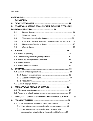 Spis treści OD REDAKCJI...................................................................................................... 5 1. PARA WODNA.............................................................................................. 7 2. POWIETRZE WILGOTNE ......................................................................... 12 3. WŁAŚCIWOŚCI DREWNA MAJĄCE ISTOTNE ZNACZENIE W PROCESIE PAROWANIA I SUSZENIA .............................................. 18 4. 3.1. Budowa drewna..................................................................................... 18 3.2. Wilgotność drewna ............................................................................... 19 3.3. Właściwości higroskopijne drewna...................................................... 20 3.4. Pęcznienie i kurczenie się drewna na skutek zmiany jego wilgotności... 23 3.5. Rozszerzalność termiczna drewna ......................................................... 26 3.6. Gęstość drewna..................................................................................... 26 POMIARY ................................................................................................... 29 4.1. Pomiar temperatury ............................................................................... 29 4.2. Określenie wilgotności względnej powietrza ........................................ 30 4.3. Pomiar prędkości przepływu powietrza ................................................ 31 4.4. Pomiar ciśnienia..................................................................................... 35 4.5. Pomiar wilgotności drewna................................................................... 35 5. SUSZARKI.................................................................................................. 38 5.1. Suszarki cyklicznego działania .............................................................. 38 5.1.1. Suszarki konwencjonalne ............................................................. 38 5.1.2. Suszarki kondensacyjne...............................................................43 5.1.3. Podsuszarki...................................................................................44 5.2. Suszarki ciągłego działania.................................................................... 45 6. PRZYGOTOWANIE DREWNA DO SUSZENIA....................................... 49 6.1. Wilgotność początkowa drewna........................................................... 49 6.2. Formowanie sztapli i pakietów.............................................................. 51 7. NAPRĘśENIA I ODKSZTAŁCENIA W DREWNIE W CZASIE SUSZENIA............ 55 8. PROGRAMY SUSZENIA ........................................................................... 58 8.1. Programy suszenia w suszarkach cyklicznego działania.................... 58 8.1.1. Parametry powietrza w suszarkach konwencjonalnych.............. 58 8.1.2. Parametry powietrza w suszarkach przy suszeniu buka z zachowaniem naturalnej barwy („suszenie na biało") ............ 70 8.1.3 Parametry powietrza w podsuszarkach....................................... 71 8.1.4. Parametry powietrza w suszarkach kondensacyjnych - faza III..... 71 8.2.Parametry powietrza w suszarkach ciągłego działania .......................... 76 9. PROWADZENIE CYKLU SUSZENIA........................................................ 77 9.1. Przygotowanie suszarki do pracy......................................................... 77 9.2. Ustawienie drewna w suszarce............................................................. 78 9.3. Wybór programu suszenia.................................................................... 82 9.3.1. Programowanie suszenia przy sterowaniu ręcznym i półautomatycznym .................................................................... 82 9.3.2. Programowanie suszenia przy sterowaniu automatycznym ....... 83 9.4. Przewidywany czas cyklu suszenia ...................................................... 84 9.4.1. Przewidywany czas cyklu suszenia w konwencjonalnych suszarkach cyklicznego działania................................................ 84 9.4.2. Przewidywany czas cyklu suszenia w kondensacyjnych suszarkach cyklicznego działania................................................ 89 9.4.3. PrzybliŜony czas cyklu suszenia w podsuszarkach ................... 92 9.4.4. Przewidywany czas suszenia w suszarkach ciągłego działania ..... 93 9.5. Raport suszenia..................................................................................... 95 10. STEROWANIE SUSZARKAMI.................................................................. 97 10.1. Ręczne sterowanie konwencjonalnymi suszarkami cyklicznego działania ........................................................................... 97 10.2. Ręczne sterowanie podsuszarkami.................................................... 101 10.3. Ręczne sterowanie jednostrefowymi suszarkami ciągłego działania............................................................................... 102 10.4. Półautomatyczne sterowanie suszarkami .......................................... 103 10.5. Automatyczne sterowanie suszarkami............................................... 104 11. WADY SUSZENIA, PRZYCZYNY ICH POWSTAWANIA I SPOSOBY ZAPOBIEGANIA ................................................................ 106 12. MAGAZYNOWANIE WYSUSZONEGO DREWNA................................ 109 13. WYDAJNOŚĆ SUSZAREK ...................................................................... 110 14. SUSZENIE DREWNA W SUSZARKACH PRÓśNIOWYCH ................. 114 15. PAROWANIE MATERIAŁÓW TARTYCH ............................................. 120 15.1. Para wodna w procesie parowania materiałów tartych.................... 120 15.2. Parzelnie ............................................................................................. 121 15.3. Wpływ parowania drewna na jego właściwości.............................. 122 15