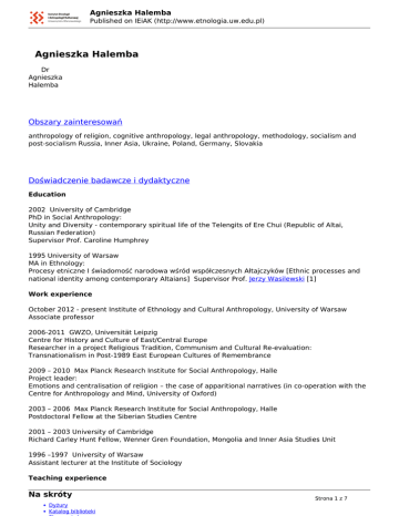 Agnieszka Halemba Published on IEiAK (http://www.etnologia.uw.edu.pl) Agnieszka Halemba Dr Agnieszka Halemba Obszary zainteresowań anthropology of religion, cognitive anthropology, legal anthropology, methodology, socialism and post-socialism Russia, Inner Asia, Ukraine, Poland, Germany, Slovakia Doświadczenie badawcze i dydaktyczne Education 2002 University of Cambridge PhD in Social Anthropology: Unity and Diversity - contemporary spiritual life of the Telengits of Ere Chui (Republic of Altai, Russian Federation) Supervisor Prof. Caroline Humphrey 1995 University of Warsaw MA in Ethnology: Procesy etniczne I świadomość narodowa wśród współczesnych Ałtajczyków [Ethnic processes and national identity among contemporary Altaians] Supervisor Prof. Jerzy Wasilewski [1] Work experience October 2012 - present Institute of Ethnology and Cultural Anthropology, University of Warsaw Associate professor 2006-2011 GWZO, Universität Leipzig Centre for History and Culture of East/Central Europe Researcher in a project Religious Tradition, Communism and Cultural Re-evaluation: Transnationalism in Post-1989 East European Cultures of Remembrance 2009 – 2010 Max Planck Research Institute for Social Anthropology, Halle Project leader: Emotions and centralisation of religion – the case of apparitional narratives (in co-operation with the Centre for Anthropology and Mind, University of Oxford) 2003 – 2006 Max Planck Research Institute for Social Anthropology, Halle Postdoctoral Fellow at the Siberian Studies Centre 2001 – 2003 University of Cambridge Richard Carley Hunt Fellow, Wenner Gren Foundation, Mongolia and Inner Asia Studies Unit 1996 –1997 University of Warsaw Assistant lecturer at the Institute of Sociology Teaching experience Na skróty Dyżury Katalog biblioteki Strona 1 z 7 Agnieszka Halemba Published on IEiAK (http://www.etnologia.uw.edu.pl) 2012-present University of Warsaw, Institute of Ethnology and Social Anthropology Introduction to Anthropology of Religion (taught in English); Contemporary approaches in sociological and anthropological studies of religion (taught in English); Monograph as an inspirations [Monografie jako inspiracja]; BA seminar [Seminarium licencjackie]; Anthropology of Christianity [Antropologia chrześcijaństwa]; Miracles, apparitions, visions [Cuda, wizje, objawienia]; Neuroanthropology and cognitive anthropology [Neuroantropologia i antropologia kognitywna]; From shaman’s perspective - shaman in perspective [Z perspektywy szaman - szaman w perspektywie]; Religion in contemporary world [Religia we współczesnym świecie] Selected Debates in Social Anthropology [Wybrane debaty w antropologii społecznej], with Agnieszka Pasieka 2015 University of Tomsk, Russian Federation Contemporary approaches in sociological and anthropological studies of religion (taught in Russian) 2007 – 2009 Freie Universität Berlin, Institut für Ethnologie Contemporary approaches in anthropology of religion (taught in English); Anthropology of Religion and Magic (taught in English); Anthropology of Knowledge (taught in English); Anthropology of Post-socialist Transformations (taught in English) 2003 – 2008 University of Warsaw, Institute of Ethnology and Social Anthropology Knowledge, Belief and Emotion (taught in English); Anthropology of Religion and Magic (taught in English); Directions in contemporary anthropological studies of religion (taught in English); Anthropology of Post-socialist Transformations (taught in English) 2001 – 2003 University of Cambridge Supervisions for anthropology and sociology students in: Anthropology of Development; Post-socialist Transformations; Cognition, Knowledge and Belief; Nationalism and Ethnicity; Introduction to Social Anthropology 2001 University of Tromsø Course assistant Anthropology and Development for PhD students (main lecturer: Dr Piers Vitebsky) 1996-1997 University of Warsaw, Institute of Sociology Classical Sociological Theory Introduction to Social Anthropology Publikacje Monographs: 2015 • Negotiating Marian Apparitions: The Politics of Religion in Transcarpathian Ukraine. New York, Budapest: Central European University Press 2006 • The Telengits of Southern Siberia: Landscape, Religion and Knowledge in Motion. London: Routledge Edited Volume: Na skróty Dyżury Katalog biblioteki Strona 2 z 7 Agnieszka Halemba Published on IEiAK (http://www.etnologia.uw.edu.pl) 2014 • (with Agnieszka Gasior and Stefan Troebst) Gebrochene Kontinuitäten. Transnationalität in den Erinnerungskulturen Ostmitteleuropas im 20. Jahrhundert. [Broken continuities. Transnationalism in the Cultures of Remembrance in East-Central Europe in the 20th century] Böhlau Verlag: Wien, Köln Weimar. Journal articles: In Press • Archiwum znalezione w garażu. [Archive that was found in a garage] Rocznik Antropologii Historii • Inconsequential acclamations and apparitions of the Virgin Mary as transformative events. Social Analysis 2014 • Objawienia i duchy gór – doświadczenia, instytucje i organizacje religijne. [Apparitions and the spirits of mountains: religious experiences, institutions and organisations] Prace Etnograficzne 42.1, 33-46. • The Power and Authority of Shamans in Contemporary Altai. Shaman 22/1-2: 5-26 2012 • Emotions and authority in religious organisations: a case of a new prayer group in contemporary Transcarpathian Ukraine. Anthropological Journal of European Cultures, 21:1, 60-80. 2011 • National, transnational or cosmopolitan heroine? Virgin Mary’s apparitions in contemporary Europe. Ethnic and Racial Studies, vol. 34/3: 454-470 2008 • From Dzublyk to Medjugorje: The Virgin Mary as a translational figure. Transnationalism and the nation-state. Zeitschrift für Ostmitteleuropa-Forschung, vol. 57/3: 329-345 • (with Brian Donahoe, Joachim Otto Habeck and Istvan Santha) Size and place in the construction of indigeneity in the Russian Federation. Current Anthropology, 48/6, no. 6: 993-1020 • Vir