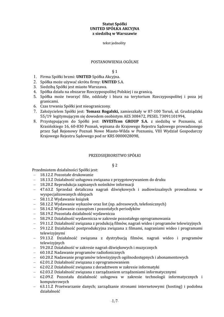 Statut Spółki UNITED SPÓŁKA AKCYJNA z siedzibą w Warszawie tekst jednolity POSTANOWIENIA OGÓLNE §1 1. Firma Spółki brzmi: UNITED Spółka Akcyjna. 2. Spółka może używać skrótu firmy: UNITED S.A. 3. Siedzibą Spółki jest miasto Warszawa. 4. Spółka działa na obszarze Rzeczypospolitej Polskiej i za granicą. 5. Spółka może tworzyć filie, oddziały i biura na terytorium Rzeczypospolitej i poza jej granicami. 6. Czas trwania Spółki jest nieograniczony. 7. Założycielem Spółki jest: Tomasz Rogalski, zamieszkały w 87-100 Toruń, ul. Grudziądzka 55/19 legitymującym się dowodem osobistym AES 308472, PESEL 73091101994, 8. Przystępującym do Spółki jest: INVESTcon GROUP S.A. z siedzibą w Poznaniu, ul. Krasińskiego 16, 60-830 Poznań, wpisana do Krajowego Rejestru Sądowego prowadzonego przez Sąd Rejonowy Poznań Nowe Miasto-Wilda w Poznaniu, VIII Wydział Gospodarczy Krajowego Rejestru Sądowego pod nr KRS 0000028098, PRZEDSIĘBIORSTWO SPÓŁKI §2 Przedmiotem działalności Spółki jest: – 18.12.Z Pozostałe drukowanie – 18.13.Z Działalność usługowa związana z przygotowywaniem do druku – 18.20.Z Reprodukcja zapisanych nośników informacji – 47.63.Z Sprzedaż detaliczna nagrań dźwiękowych i audiowizualnych prowadzona w wyspecjalizowanych sklepach – 58.11.Z Wydawanie książek – 58.12.Z Wydawanie wykazów oraz list (np. adresowych, telefonicznych) – 58.14.Z Wydawanie czasopism i pozostałych periodyków – 58.19.Z Pozostała działalność wydawnicza – 58.29.Z Działalność wydawnicza w zakresie pozostałego oprogramowania – 59.11.Z Działalność związana z produkcją filmów, nagrań wideo i programów telewizyjnych – 59.12.Z Działalność postprodukcyjna związana z filmami, nagraniami wideo i programami telewizyjnymi – 59.13.Z Działalność związana z dystrybucją filmów, nagrań wideo i programów telewizyjnych – 59.20.Z Działalność w zakresie nagrań dźwiękowych i muzycznych – 60.10.Z Nadawanie programów radiofonicznych – 60.20.Z Nadawanie programów telewizyjnych ogólnodostępnych i abonamentowych – 62.01.Z Działalność związana z oprogramowaniem – 62.02.Z Działalność związana z doradztwem w zakresie informatyki – 62.03.Z Działalność związana z zarządzaniem urządzeniami informatycznymi – 62.09.Z Pozostała działalność usługowa w zakresie technologii informatycznych i komputerowych – 63.11.Z Przetwarzanie danych; zarządzanie stronami internetowymi (hosting) i podobna działalność 17 - / - – – – – – – – – – – – – – – – – – – – – – – – – – – 63.12.Z Działalność portali internetowych 63.91.Z Działalność agencji informacyjnych 63.99.Z Pozostała działalność usługowa w zakresie informacji, gdzie indziej niesklasyfikowana 70.10.Z Działalność firm centralnych (head offices) i holdingów, z wyłączeniem holdingów finansowych 70.21.Z Stosunki międzyludzkie (public relations) i komunikacja 70.22.Z Pozostałe doradztwo w zakresie prowadzenia działalności gospodarczej i zarządzania 71.20.B Pozostałe badania i analizy techniczne 73.11.Z Działalność agencji reklamowych 73.12.A Pośrednictwo w sprzedaży czasu i miejsca na cele reklamowe w radio i telewizji 73.12.B Pośrednictwo w sprzedaży miejsca na cele reklamowe w mediach drukowanych 73.12.C Pośrednictwo w sprzedaży miejsca na cele reklamowe w mediach elektronicznych (Internet) 73.12.D Pośrednictwo w sprzedaży miejsca na cele reklamowe w pozostałych mediach 73.20.Z Badanie rynku i opinii publicznej 74.20.Z Działalność fotograficzna 74.90.Z Pozostała działalność profesjonalna, naukowa i techniczna, gdzie indziej niesklasyfikowana 77.33.Z Wynajem i dzierżawa maszyn i urządzeń biurowych, włączając komputery 77.39.Z Wynajem i dzierżawa pozostałych maszyn, urządzeń oraz dóbr materialnych, gdzie indziej niesklasyfikowane 77.40.Z Dzierżawa własności intelektualnej i podobnych produktów, z wyłączeniem prac chronionych prawem autorskim 78.10.Z Działalność związana z wyszukiwaniem miejsc pracy i pozyskiwaniem pracowników 78.20.Z Działalność agencji pracy tymczasowej 78.30.Z Pozostała działalność związana z udostępnianiem pracowników 82.11.Z Działalność usługowa związana z administracyjną obsługą biura 82.19.Z Wykonywanie fotokopii, przygotowywanie dokumentów i pozostała specjalistyczna działalność wspomagająca prowadzenie biura 82.20.Z Działalność centrów telefonicznych (call center) 82.30.Z Działalność związana z organizacją targów, wystaw i kongresów 82.99.Z Pozostała działalność wspomagająca prowadzenie działalności gospodarczej, gdzie indziej niesklasyfikowana KAPITAŁ ZAKŁADOWY I AKCJE §3 1. Kapitał zakładowy wynosi 12.557.000,00 zł (dwanaście milionów pięćset pięćdziesiąt siedem tysięcy złotych) i dzieli się na: - 1.000.000 (jeden milion) akcji zwykłych na okaziciela serii A o wartości nominalnej 0,10 zł (dziesięć groszy) każda, - 220.000 (dwieście dwadzieścia tysięcy) akcji zwykłych na okaziciela serii B o wartości nominalnej 0,10 zł (dziesięć groszy) każda, - 400.000 (czterysta tysięcy) akcji zwykłych na okaziciela serii C o wartości nominalnej 0,10 zł (dziesięć groszy) każda, - 750.000 (siedemset tysięcy) akcji zwykłych na okaziciela serii D o wartości nominalnej 0,10 zł (dziesięć groszy) każda, - 500.000 (pięćset tysięcy) akcji imiennych uprzywilejowanych co do głosu w stosunku dwa głosy na jedną akcję serii E o wartości nominalnej 0,10 zł (dziesięć groszy) każda, - 106.000.000 (sto sześć milionów) akcji zwykłych na okaziciela serii F o wartości nominalnej 0,10 zł (dziesięć groszy) każda, 27 - / - 16.700.000 (szesnaście milionów siedemset tysięcy) akcji zwykłych na okaziciela serii G o wartości nominalnej 0,10 zł (dziesięć groszy) każda. Akcje serii A opłacone będą gotówką. Przed zarejestrowaniem Spółki kap