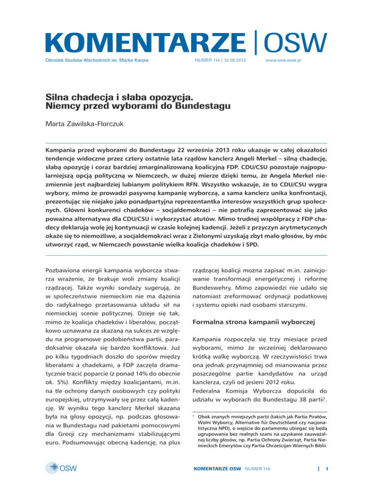Ośrodek Studiów Wschodnich im. Marka Karpia NUMER 114 | 12.09.2013 www.osw.waw.pl Silna chadecja i słaba opozycja. Niemcy przed wyborami do Bundestagu Marta Zawilska-Florczuk Kampania przed wyborami do Bundestagu 22 września 2013 roku ukazuje w całej okazałości tendencje widoczne przez cztery ostatnie lata rządów kanclerz Angeli Merkel – silną chadecję, słabą opozycję i coraz bardziej zmarginalizowaną koalicyjną FDP. CDU/CSU pozostaje najpopularniejszą opcją polityczną w Niemczech, w dużej mierze dzięki temu, że Angela Merkel niezmiennie jest najbardziej lubianym politykiem RFN. Wszystko wskazuje, że to CDU/CSU wygra wybory, mimo że prowadzi pasywną kampanię wyborczą, a sama kanclerz unika konfrontacji, prezentując się niejako jako ponadpartyjna reprezentantka interesów wszystkich grup społecznych. Główni konkurenci chadeków – socjaldemokraci – nie potrafią zaprezentować się jako poważna alternatywa dla CDU/CSU i wykorzystać atutów. Mimo trudnej współpracy z FDP chadecy deklarują wolę jej kontynuacji w czasie kolejnej kadencji. Jeżeli z przyczyn arytmetycznych okaże się to niemożliwe, a socjaldemokraci wraz z Zielonymi uzyskają zbyt mało głosów, by móc utworzyć rząd, w Niemczech powstanie wielka koalicja chadeków i SPD. Pozbawiona energii kampania wyborcza stwarza wrażenie, że brakuje woli zmiany koalicji rządzącej. Także wyniki sondaży sugerują, że w społeczeństwie niemieckim nie ma dążenia do radykalnego przetasowania układu sił na niemieckiej scenie politycznej. Dzieje się tak, mimo że koalicja chadeków i liberałów, początkowo uznawana za skazaną na sukces ze względu na programowe podobieństwa partii, paradoksalnie okazała się bardzo konfliktowa. Już po kilku tygodniach doszło do sporów między liberałami a chadekami, a FDP zaczęła dramatycznie tracić poparcie (z ponad 14% do obecnie ok. 5%). Konflikty między koalicjantami, m.in. na tle ochrony danych osobowych czy polityki europejskiej, utrzymywały się przez całą kadencję. W wyniku tego kanclerz Merkel skazana była na głosy opozycji, np. podczas głosowania w Bundestagu nad pakietami pomocowymi dla Grecji czy mechanizmami stabilizującymi euro. Podsumowując obecną kadencję, na plus rządzącej koalicji można zapisać m.in. zainicjowanie transformacji energetycznej i reformę Bundeswehry. Mimo zapowiedzi nie udało się natomiast zreformować ordynacji podatkowej i systemu opieki nad osobami starszymi. Formalna strona kampanii wyborczej Kampania rozpoczęła się trzy miesiące przed wyborami, mimo że wcześniej deklarowano krótką walkę wyborczą. W rzeczywistości trwa ona jednak przynajmniej od mianowania przez poszczególne partie kandydatów na urząd kanclerza, czyli od jesieni 2012 roku. Federalna Komisja Wyborcza dopuściła do udziału w wyborach do Bundestagu 38 partii1. Obok znanych mniejszych partii (takich jak Partia Piratów, Wolni Wyborcy, Alternative für Deutschland czy nacjonalistyczna NPD), o wejście do parlamentu ubiegać się będą ugrupowania bez realnych szans na uzyskanie zauważalnej liczby głosów, np. Partia Ochrony Zwierząt, Partia Niemieckich Emerytów czy Partia Chrześcijan Wiernych Biblii. 1 KOMENTARZE OSW NUMER 114 1 Jak pokazują sondaże, w walce o wejście do Bundestagu liczą się jednak tylko te ugrupowania, których posłowie od lat zasiadają w parlamencie – CDU/CSU, SPD, Partia Zielonych, FDP i Partia Lewicy. W latach 2011–2012 wydawało się, że nową jakością w polityce niemieckiej będzie Partia Piratów, której udało się wejść do parlamentów czterech krajów związkowych i która przez długi czas cieszyła się na poziomie federalnym poparciem zbliżonym do wartości osiąganych przez np. Partię Lewicy (ok. 7%). Sukces partii okazał się czasowym fenomenem, który przeminął wraz z pogłębiającym się kryzysem przywództwa. Podobnie jak w poprzednich latach partie polityczne stawiają w kampanii na metody tradycyjne (wiece wyborcze, dyskusje z udziałem kandydatów na posłów, wizyty lokalnych polityków w małych przedsiębiorstwach, gospodarstwach rolnych itp.). Odbyły się też debaty z udziałem kandydatów CDU i SPD oraz kandydatów mniejszych partii transmitowane przez najważniejsze kanały telewizji państwowej i prywatnej. Coraz większego znaczenia nabiera kampania prowadzona w Internecie, której celem jest dotarcie do ludzi młodych, niezdecydowanych, na kogo głosować. Przoduje w tym posiadająca niewielki budżet przeznaczony na kampanię (ok. 400 tys. euro) Partia Piratów. Najbardziej prężną kampanię wyborczą prowadzą jednak socjaldemokraci. SPD dysponuje największym budżetem spośród wszystkich partii ubiegających się o wejście do Bundestagu (23 mln euro, CDU – 20 mln euro)2. Sztab wyborczy socjaldemokratów uruchomił na 100 dni przed wyborami blog, na którym punktuje wszystkie posunięcia koalicji CDU/CSU-FDP i rozlicza rząd z obietnic wyborczych3. Socjaldemokraci jako jedyna partia opozycyjna przedstawili też swój gabinet cieni. http://www.spiegel.de/politik/deutschland/millionen-aufwand-spd-goennt-sich-groesstes-wahlkampf-budget-a-905334.html 3 Na blogu pojawił się np. program wyborczy CDU przed oficjalnym opublikowaniem go przez chadeków. 2 Silna pozycja chadecji pod skrzydłami Angeli Merkel… Deklarowane poparcie dla kanclerz wynosi niezmiennie ponad 50%, co sprawia, że jest ona najbardziej lubianym politykiem niemieckim. Merkel często określana jest w mediach jako „Mutti” – mama – i wydaje się, że taka jej rola spełnia oczekiwania społeczeństwa RFN. Wysokie notowania chadecja zawdzięcza przede wszystkim popularności kanclerz Merkel i na tym bazuje cała kampania prowadzona przez CDU/CSU. Chadecy nie inicjują sami dyskusji na tematy, które mogłyby przesądzić o wyniku wyborów i unikają bezpośredniego dyskredytowania partii opozycyjnych. Ich kampania opiera się na przedstawianiu osiągni
