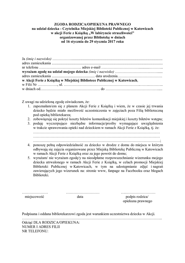 ZGODA RODZICA/OPIEKUNA PRAWNEGO na udział dziecka - Czytelnika Miejskiej Biblioteki Publicznej w Katowicach w akcji Ferie z Książką „W labiryncie straszliwości” organizowanej przez Bibliotekę w dniach od 16 stycznia do 29 stycznia 2017 roku Ja (imię i nazwisko) …………….................................................................................................. adres zamieszkania ....................................................................................................................... nr telefonu ……………………………. adres e-mail …………………………............……….. wyrażam zgodę na udział mojego dziecka (imię i nazwisko) ……………………….……...... adres zamieszkania .............................................. data urodzenia……………………………… w Akcji Ferie z Książką w Miejskiej Bibliotece Publicznej w Katowicach, w Filii Nr ……………., ul. ……………………………………………………..……..……….. w dniach od………………………………………… do ……………………………………..... Z uwagi na udzieloną zgodę oświadczam, że: 1. zapoznałam/em się z planem Akcji Ferie z Książką i wiem, że w czasie jej trwania dziecko będzie miało możliwość uczestniczenia w zajęciach poza Filią biblioteczną pod opieką bibliotekarza; 2. zobowiązuję się pokryć koszty biletów komunikacji miejskiej i koszty biletów wstępu; 3. podaję wyczerpująco niezbędne informacje/prośby wymagające uwzględnienia w trakcie sprawowania opieki nad dzieckiem w ramach Akcji Ferie z Książką, tj. że: ………………………………………………………………………………………… ………………………………………………………………………………………… …………………………………………………………………………………………; 4. ponoszę pełną odpowiedzialność za dziecko w drodze z domu do miejsca w którym odbywają się zajęcia organizowane przez Miejską Bibliotekę Publiczną w Katowicach w ramach Akcji Ferie z Książką oraz za jego powrót do domu; 5. wyrażam/ nie wyrażam zgodę/y na nieodpłatne rozpowszechnianie wizerunku mojego dziecka utrwalonego w ramach Akcji Ferie z Książką, w celach promocji Miejskiej Biblioteki Publicznej w Katowicach, w tym na udostępnianie zdjęć i nagrań zawierających jego wizerunek na: stronie www, fanpage na Facebooku oraz blogach Biblioteki. ………………… miejscowość ……………………… data ….…………………… podpis rodzica/ opiekuna prawnego Podpisana i oddana bibliotekarzowi zgoda jest warunkiem uczestnictwa dziecka w Akcji. ………………………………………………………………………………………………….. Odciąć DLA RODZICA/OPIEKUNA: NUMER I ADRES FILII NR TELEFONU:
