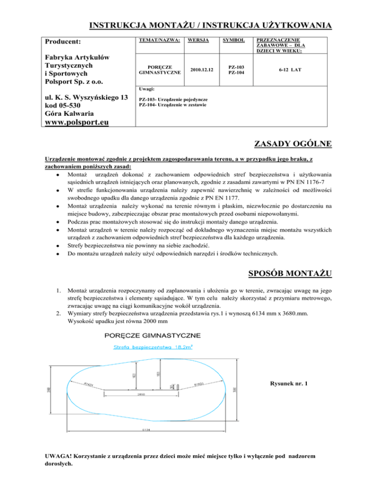 INSTRUKCJA MONTAŻU / INSTRUKCJA UŻYTKOWANIA Producent: TEMAT/NAZWA: Fabryka Artykułów Turystycznych i Sportowych Polsport Sp. z o.o. PORĘCZE GIMNASTYCZNE WERSJA 2010.12.12 SYMBOL PZ-103 PZ-104 PRZEZNACZENIE ZABAWOWE – DLA DZIECI W WIEKU: 6-12 LAT Uwagi: ul. K. S. Wyszyńskiego 13 kod 05-530 Góra Kalwaria PZ-103- Urządzenie pojedyncze PZ-104- Urządzenie w zestawie www.polsport.eu ZASADY OGÓLNE Urządzenie montować zgodnie z projektem zagospodarowania terenu, a w przypadku jego braku, z zachowaniem poniższych zasad: Montaż urządzeń dokonać z zachowaniem odpowiednich stref bezpieczeństwa i użytkowania sąsiednich urządzeń istniejących oraz planowanych, zgodnie z zasadami zawartymi w PN EN 1176-7 W strefie funkcjonowania urządzenia należy zapewnić nawierzchnię w zależności od możliwości swobodnego upadku dla danego urządzenia zgodnie z PN EN 1177. Montaż urządzenia należy wykonać na terenie równym i płaskim, niezwłocznie po dostarczeniu na miejsce budowy, zabezpieczając obszar prac montażowych przed osobami niepowołanymi. Podczas prac montażowych stosować się do instrukcji montaży danego urządzenia. Montaż urządzeń w terenie należy rozpocząć od dokładnego wyznaczenia miejsc montażu wszystkich urządzeń z zachowaniem odpowiednich stref bezpieczeństwa dla każdego urządzenia. Strefy bezpieczeństwa nie powinny na siebie zachodzić. Do montażu urządzeń należy użyć odpowiednich narzędzi i środków technicznych. SPOSÓB MONTAŻU 1. 2. Montaż urządzenia rozpoczynamy od zaplanowania i ułożenia go w terenie, zwracając uwagę na jego strefę bezpieczeństwa i elementy sąsiadujące. W tym celu należy skorzystać z przymiaru metrowego, zwracając uwagę na ciągi komunikacyjne wokół urządzenia. Wymiary strefy bezpieczeństwa urządzenia przedstawia rys.1 i wynoszą 6134 mm x 3680.mm. Wysokość upadku jest równa 2000 mm Rysunek nr. 1 UWAGA! Korzystanie z urządzenia przez dzieci może mieć miejsce tylko i wyłącznie pod nadzorem dorosłych. INSTRUKCJA MONTAŻU / INSTRUKCJA UŻYTKOWANIA Producent: Fabryka Artykułów Turystycznych i Sportowych Polsport Sp. z o.o. ul. K. S. Wyszyńskiego 13 kod 05-530 Góra Kalwaria TEMAT/NAZWA: PORĘCZE GIMNASTYCZNE WERSJA 2010.12.12 SYMBOL PZ-103 PZ-104 PRZEZNACZENIE ZABAWOWE – DLA DZIECI W WIEKU: 6-12 LAT Uwagi: PZ-103- Urządzenie pojedyncze PZ-104- Urządzenie w zestawie www.polsport.eu 3. Po wyznaczeniu miejsca montażu Poręczy Gimnastycznych przystępujemy do wykonania czterech wykopów fundamentowych. Trzy wykopy mają wymiary 500x500 mm i głębokość 600mm, oraz przy skrajnym najwyższym słupie 500 x750mm. Sposób wykonania wykopów i ich rozstaw pokazano na rysunku .2 Uwaga: w przypadku kiedy Poręcze Gimnastyczne mają przylegać jednym ze swoich boków do konstrukcji Domku, wykonujemy jedynie trzy mniejsze fundament, gdyż ich skrajny najwyższy słup mocowany jest bezpośrednio do jego Nogi. Rysunek nr. 2 4. 5. 6. Następnie skręcamy ze sobą za pomocą dołączonych śrub kolejne poziomy drążków, stosując zasadę od najniższego do najwyższego. W tak przygotowany wykop fundamentowy wstawiamy kompletne urządzenie i za pomocą poziomicy korygujemy ewentualne odchyłki od pionu i poziomu. W dolnej części urządzenia, na głównych podporach wchodzących w ziemię znajdują się nity, które mają za zadanie wyznaczać docelowy poziom bezpiecznej nawierzchni. Ułożenie Poręczy Gimnastycznych w wykopach przedstawiono na rys.2 Następnie wykopy zalewamy betonem B20 kształtując w jego górnej części charakterystyczny kształt stożka. rys.3 Rysunek nr. 3 UWAGA! Korzystanie z urządzenia przez dzieci może mieć miejsce tylko i wyłącznie pod nadzorem dorosłych. INSTRUKCJA MONTAŻU / INSTRUKCJA UŻYTKOWANIA Producent: Fabryka Artykułów Turystycznych i Sportowych Polsport Sp. z o.o. ul. K. S. Wyszyńskiego 13 kod 05-530 Góra Kalwaria TEMAT/NAZWA: PORĘCZE GIMNASTYCZNE WERSJA 2010.12.12 SYMBOL PZ-103 PZ-104 PRZEZNACZENIE ZABAWOWE – DLA DZIECI W WIEKU: 6-12 LAT Uwagi: PZ-103- Urządzenie pojedyncze PZ-104- Urządzenie w zestawie www.polsport.eu 7. 8. Zasypujemy otwory urobkiem z wykopu, pamiętając o ich zagęszczeniu, oraz pozostawieniu przestrzeni na montaż bezpiecznej nawierzchni, nie szybciej niż 1dzień po zabetonowaniu urządzenia. Teren wokół Poręczy Gimnastycznych równamy i sprzątamy po pracach montażowych. Zalecenia i uwagi Poręcze Gimnastyczne projektowane i instalowane do użytku dla dzieci młodszych zaleca się oddzielić od tych urządzeń, które są przeznaczone dla starszych grup wiekowych. Miejsce montażu należy uzgodnić z właścicielem lub zarządcą terenu. Należy zwrócić szczególną uwagę aby zamontowane urządzenie nie ograniczało dróg komunikacji i nie blokowało dróg ewakuacyjnych. W przypadku stwierdzenia nieprawidłowości w funkcjonowaniu urządzenia mogącego mieć wpływ na bezpieczeństwo użytkowników należy niezwłocznie zamknąć do niego dostęp, a następnie przystąpić do naprawy. Dopiero po usunięciu usterki i przetestowaniu prawidłowego funkcjonowania można powtórnie przekazać urządzenie do eksploatacji . W przypadku stwierdzenia nieprawidłowości w funkcjonowaniu urządzenia mogącego mieć wpływ na bezpieczeństwo użytkowników należy niezwłocznie zamknąć do niego dostęp, a następnie przystąpić do naprawy. Dopiero po usunięciu usterki i przetestowaniu prawidłowego funkcjonowania można powtórnie przekazać urządzenie do eksploatacji . Uszkodzone elementy metalowe można malować przy użyciu wałka gąbkowego po uprzednim oczyszczeniu powierzchni z rdzy i tłuszczu jednowarstwową farba alkidową przystosowaną do nakładania bezpośrednio na powierzchnię cynkowaną Zabrania się wykonywania zmian i modyfikacji w podzespołach urządzenia, lub ich konstrukcji, które mogłyby mieć zasadniczy wpływ na bezpieczeństwo bez konsultacji z FATiS Polsport Sp. z o.o. W przypadku konie