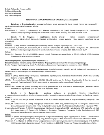 1 Dr hab. Aleksandra Tokarz, prof.UJ Dr Diana Malinowska Mgr Marlena Banasik Mgr Sabina Jochymek PSYCHOLOGIA EMOCJI I MOTYWACJI: ĆWICZENIA, R. A. 2012/2013 Zajęcia nr 1: Organizacja zajęć, wymagania, lektury, praca pisemna. Co to są emocje i czym jest motywacja? – usystematyzowanie dotychczasowej wiedzy. Wszyscy: Maruszewski, T., Doliński, D., Łukaszewski, W. i Marszał – Wiśniewska, M. (2008). Emocje i motywacja. W J. Strelau i D. Doliński (red.), Psychologia. Podręcznik akademicki. Tom I. Teorie emocji (s. 537- 553). Gdańsk: GWP. Zajęcia nr 2: Klasyczne i współczesne teorie emocji – natura procesów emocjonalnych w świetle analizy różnorodnych koncepcji. Przegląd problematyki - ważne pytania i różne sposoby udzielania na nie odpowiedzi. Wszyscy: Wrońska, J. (1990). Niektóre kontrowersje w psychologii emocji. Przegląd Psychologiczny,1, 147 – 164. Maruszewski, T., Doliński, D., Łukaszewski, W. i Marszał – Wiśniewska, M. (2008). Emocje i motywacja. W J. Strelau i D. Doliński (red.), Psychologia. Podręcznik akademicki. Tom I. Teorie emocji (s. 537- 553). Gdańsk: GWP. Referat: Ekman, P. i Davidson, R. J. (red.) (1998). Natura emocji. Podstawowe zagadnienia (s. 30-54). Gdańsk: GWP. (poglądy Shwedera i Scherera na istotę emocji) ZADANIE I (na piśmie, wydrukowane) na ćwiczenia nr 3: Znaleźć i opisać na 1 stronie jedną metodę badania dyspozycji emocjonalnych lub procesu emocjonalnego Źródła: Przegląd Psychologiczny, Studia Psychologiczne, Czasopismo Psychologiczne, czasopisma z bazy EBSCO. Zajęcia nr 3: Badanie procesu emocjonalnego. Przegląd strategii, metod i technik badawczych stosowanych w badaniu emocji. Wskaźniki procesu emocjonalnego i ich właściwości. Wszyscy: Gasiul, H. (2002). Teorie emocji i motywacji. Rozważania psychologiczne. Warszawa: Wydawnictwo UKSW. R.IX. Sposoby badania emocji (s. 201–220). UMACL - Przymiotnikowa Skala Nastroju UMACL (Gerald Matthews, A. Graham Chamberlain, Dylan M. Jones) w adaptacji Ewy Goryńskiej i PANAS (prezentacja w wykonaniu osoby prowadzącej ćwiczenia). Referat: Walbott H.G., Scherer K.R. (1989). Assessing emotion by questionnaire. In R. Plutchik & H. Kellerman (eds.), Emotion. Theory. Research and experience, 4, 55-81. New York: Academic Press. Zajęcia nr 4: Dyspozycje i postawy związane z emocjami. Różnice indywidualne w reagowaniu emocjonalnym. Inteligencja emocjonalna i kompetencja emocjonalna. Ich przejawy, mechanizmy, rozwój. Wszyscy: Łosiak, W. (2007). Psychologia emocji. Warszawa: WAiP. R.9. Różnice indywidualne w reagowaniu emocjonalnym (s. 180193). Śmieja, M. i Orzechowski, J. (2008). Inteligencja emocjonalna: fakty, mity, kontrowersje. W M. Śmieja i J. Orzechowski (red.), Inteligencja emocjonalna. Fakty, mity, kontrowersje (s. 19-45). Warszawa: Wydawnictwo Naukowe PWN. Jaworowska, A. i Matczak, A. (2001). Kwestionariusz Inteligencji Emocjonalnej INTE - N.S. Schutte, J.M. Malouffa, I.E. Hall, D.J. Haggerty’go, J.T. Cooper, C.J. Goldena, L. Dornheim. Warszawa: Pracownia Testów Psychologicznych PTP (prezentacja w wykonaniu osoby prowadzącej ćwiczenia). Referat: Zeidner, M. (2008). Rozwój inteligencji emocjonalnej. Czego dowiedzieliśmy się do tej pory? W M. Śmieja i J. Orzechowski (red.), Inteligencja emocjonalna. Fakty, mity, kontrowersje (s. 82-110). Warszawa: Wydawnictwo Naukowe PWN. Wieczorek, A. M. i Sędek, G. (2011). Zmiany w regulacji stanów emocjonalnych na przestrzeni dorosłego życia. W D. Doliński i M. Błaszczak (red.), Dynamika emocji. Teoria i praktyka (s. 239-255). Warszawa: Wydawnictwo Naukowe PWN. 2 Zajęcia nr 5: Funkcje emocji oraz ich ekspresja: aspekty poznawcze i regulacyjne. Wszyscy: Maruszewski, T., Doliński, D., Łukaszewski. W. i Marszał- Wiśniewska. M. (2008). Emocje i motywacja. W J. Strelau i D. Doliński (red.), Psychologia. Podręcznik akademicki. Tom I. 7.4. Współdeterminowanie zachowania przez emocje i poznanie (s. 571-587). Gdańsk: GWP. Referat: Keltner, D. i Ekman, P. (2005). Wyrażanie emocji twarzą. W M. Lewis i J. M. Haviland-Jones (red.), Psychologia emocji (s. 307-323). Gdańsk: GWP. Oatley, K. i Jenkins, J. M. (2003). Zrozumieć emocje. Warszawa: PWN. R.9. Funkcje emocji i ich wpływ na procesy poznawcze i perswazję (s. 248-284). Zajęcia nr 6: Taksonomia ludzkich emocji Wszyscy: Jarymowicz, M., Imbir, K. (2010). Próba taksonomii ludzkich emocji. Przegląd Psychologiczny, tom 53, Nr 4, s. 439- 447. Referat: Jarymowicz, M., Imbir, K. (2010). Próba taksonomii ludzkich emocji. Przegląd Psychologiczny, tom 53, Nr 4, „Właściwości i źródła emocji pierwotnych generowanych automatycznie”, s. 447- 452. Jarymowicz, M., Imbir, K. (2010). Próba taksonomii ludzkich emocji. Przegląd Psychologiczny, tom 53, Nr 4, „Źródła emocji powstających w systemie refleksyjnym”, s. 453- 461. Zajęcia nr 7: Irracjonalność czy racjonalność emocji? Fenomenologiczne badanie emocji. Wszyscy: Węgrzecki, A. (1990). O irracjonalności uczuć. Zeszyty Naukowe Akademii Ekonomicznej w Krakowie, 310, 5 – 17. Referat: Giorgi, A. (1999/2003). Szkic psychologicznej metody fenomenologicznej. W A. Giorgi (red.), Fenomenologia i badania psychologiczne (s. 23–39). Białystok: Transhumana. Zajęcia nr 8: Podstawowe mechanizmy motywacyjne. Natura procesów motywacyjnych w świetle analizy różnorodnych koncepcji. Wszyscy: Maruszewski, T., Doliński, D., Łukaszewski, W. i Marszał- Wiśniewska, M. (2008). Emocje i motywacja. W J. Strelau i D. Doliński (red.), Psychologia. Podręcznik akademicki. Tom I. 7.6. Podstawowe mechanizmy motywacyjne (s. 598-630). Gdańsk: GWP. Referat: Tokarz, A. i Kaleńska-Rodzaj, J. (2011). Orientacje motywacyjne jako wyjaśnienie specyfiki motywu. W A. Tokarz (red.), Pamięć. Osobowość. Osoba. Księga Dedykowana prof. Annie Gałdowej (s. 281-295). Kraków: Wydawnictwo Uniwersytetu Jagiellońskiego. ZADANIE II (na piśmie, wydrukowane) na ćwiczenia nr 9: Znaleźć i opisać dowolną metodę 