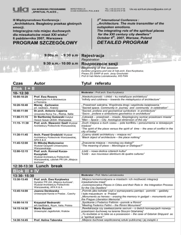 UIA WORKING PROGRAMME „SPIRITUAL PLACES „ BEREZYŃSKA 25 03-908 WARSZAWA, P O L A N D TEL: (+48 22) 616 37 98 FAX: (+48 22) 616 37 99 [email protected] rd III Międzynarodowa Konferencja : 3 International Conference : „Architektura. Bezgłośny przekaz głośnych emocji. Integracyjna rola miejsc duchowych dla mieszkańców miast XXI wieku” 6 października 2007, Warszawa „Architecture. The mute transmitter of the outspoken emotions. The integrating role of the spiritual places for the XXI century city dwellers” th October 6 , 2007, Warsaw, Poland PROGRAM SZCZEGÓŁOWY DETAILED PROGRAM 9:00a.m - 9:30 a.m Rejestracja Registration 9:30 a.m.- 10:00 a.m Rozpoczęcie sesji Beginning of the session Dyrektor programu prof nzw dr hab.arch. Ewa Kuryłowicz, Prezes ZG SARP dr arch. Jerzy Grochulski Prof dr hab Marta Leśniakowska, IHS PAN Czas Autor Blok I + II Tytuł referatu 10- 12:30 Moderator : Prof.arch. Ewa Kuryłowicz 10:00-10:20 Prof. Ewa Rewers Uniwersytet im.A.Mickiewicza w Poznaniu 10:20-10:40 Maciej Zychowicz art. rzeźbiarz , Kraków 10:40-11:00 11:00-11:15 11:15- 11:30 Dr.arch. Antonio Caperna Universita Roma Tre , Roma, Italia Dr Bartłomiej Gutowski Instytut Historii Sztuki UKSW, Warszawa Prof. arch. Sławomir Gzell Wydział Architektury Politechniki Warszawskiej 11:30-11:45 Arch. Paweł Grodzicki Wydział Architektury Politechniki Warszawskiej, APA K & A 11:45-12:00 Dr Mikołaj Madurowicz Wydział Geografii Uniwersytetu Warszawskiego 12:00-12:15 Prof. arch. Konrad KuczaKuczyński „Nieskończoność i chłód – ku metafizyce architektury” “Infinity and coldness – towards the metaphysics of architecture” „ Przestrzeń sakralna. Wspólnota drogi i wspólnota świętowania ” “Sacred space. Community in journey and community in celebration” “Sacred, profane and geometrical symbolism in architecture” “Sacro , profane e simbolismo geometrico in architettura” „Człowiek – przestrzeń – miasto. Aksjologiczny wymiar przestrzeni miasta“ “Man – Space – City. Axiological dimension of the city” „Duch miejsca a duch czasu – pole konfliktu i porozumienia w dzisiejszym mieście” “The spirit of the place versus the spirit of time – the area of conflict in the city of today“ „Czarny obiekt architektury – miejsce nic” “Black object of architecture – the place nothing” „Znaczenie miejsca – monolog czy dialog?” “The meaning of place – Monologue or Dialogue?“ „Łódź – nowa okolica czterech kultur” “Łódź - aux nouveaux alentours de quatre cultures” Wydział Architektury Politechniki Warszawskiej, członek PR UIA „Miejsca duchowe” 12:30-13:30 Lunch break Blok III + IV Moderator : Prof. Marta Leśniakowska 13:30- 15:30 13:30-13:45 Prof. arch. Ewa Kuryłowicz Dyrektor PR UIA „Miejsca duchowe”, Wydział Architektury Politechniki Warszawskiej, APA K & A 13:45-14:00 Joanna Derdowska Uniwersytet Karola w Pradze , Czechy 14:00-14:15 14:15-14:30 Krzysztof Bednarski art.rzeźbiarz, Rzym, Italia, Polska Marta Raczek Uniwersytet Jagielloński, Kraków 14:30-14:45 Prof. Halina Taborska „Miejsca komemoratywne w miastach i ich moŜliwość integracji mieszkańców miast” „Commemorative Places in Cities and their Role in the Integration Process for the City Dwellers” „Pomnik jako bohater czyli o wymazywaniu pamięci : pomniki - gadŜety i byłe mauzoleum w Pradze” „Monuments as heroes – erasing the memory in gadget – monuments and the Prague Liberation Memorial “ „Spotkanie z Federico Fellinim –pomnik w Rimini” “Meeting Federico Fellini – the Rimini Monument“ „Rewitalizacja czy zawłaszczenie sacrum – o dwóch koncepcjach rozwoju przestrzeni duchowej na terenie Stoczni Gdańskiej” „To revitalize or to take as a possession – the case of Gdańsk Shipyard as a “spiritual space”” „Miejsce duchowe współczesnej sztuki publicznej i jej związki z Instytut Historii Sztuki Uniwersytetu Warszawskiego, SWPS, Warszawa, Instytut Kultury Europejskiej, Londyn 14:45-15:00 Ks dr Henryk Nadrowski dr teologii i historii sztuki, Poznań, Gniezno 15:00-15:15 Dr.arch. Jerzy Uścinowicz , Wydział Architektury Politechniki Białostockiej, członek PR UIA „Miejsca duchowe” 15:30-15:45 Coffee break 15:45-16:25 INNA METAFIZYKA 15:45-15:55 OTHER METAPHYSICS Dr hab arch. Jeremi Królikowski , SGGW Samodzielny Zakład Sztuki Krajobrazu, Warszawa 15:55-16:05 16:05-16:15 16:15-16:25 Dr Tomasz Sadlej, art.plastyk, APSim.M.Grzegorzewskiej, Warszawa Dr arch. Mirosław Bogdan, Wydział Architektury Politechniki Śląskiej, Gliwice Arch. Adriana Cieślak, Instytut Architektury i Urbanistyki Politechniki w Łodzi 16:30- 17:20 POCHWAŁA TRADYCJI 16:30-16:40 GLORY TO THE TRADITION Dr hab.arch. Jan Rabiej Wydział Architektury Politechniki Śląskiej, Gliwice 16:40-16:50 Dr arch. Andrew Baczyński Young & Wright Architects, Toronto, Canada 16:50-17:00 Dr arch. Artur Zaguła Instytut Architektury i Urbanistyki Politechniki w Łodzi 17:00-17:10 Hanna Wesołowska-Starzec doktorantka PAT, Kraków 17:10-17:20 Arch.Gabor Csanady architekturą” „Spiritual place of contemporary public art and its relation with architecture“ “Sakralne – granice, pogranicze, peryferie” “Sacred: boundaries , frontiers and peripheries” „O transmisji wartości w architekturze sakralnej – nowa dialektyka znaku i symbolu” „About transmission of values In sacred architecture – new dialectics of the sign and the symbol“ Moderator : Prof.arch. Konrad Kucza- Kuczyński DYSKUSJA / DISCUSSION “Linia ducha – duch linii“ “The spirit of the line” “Malarstwo jako forma opisu i duchowości miejsca” “Painting as a form of description and spirituality of the place” „Przeźroczystość w architekturze współczesnego sacrum” “Transparency in the contemporary architecture of the sacrum” „ZałoŜenie urbanistyczne Góry Kalwarii jako przykład wykorzystania unikalnej duchowości miasta