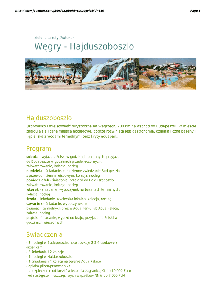 http://www.juventur.com.pl/index.php?d=szczegoly&id=310 Page 1 zielone szkoły /Autokar Węgry - Hajduszoboszlo Hajduszoboszlo Uzdrowisko i miejscowość turystyczna na Węgrzech, 200 km na wschód od Budapesztu. W mieście znajdują się liczne miejsca noclegowe, dobrze rozwinięta jest gastronomia, działają liczne baseny i kąpieliska z wodami termalnymi oraz kryty aquapark. Program sobota - wyjazd z Polski w godzinach porannych, przyjazd do Budapesztu w godzinach przedwieczornych, zakwaterowanie, kolacja, nocleg niedziela - śniadanie, całodzienne zwiedzanie Budapesztu z przewodnikiem miejscowym, kolacja, nocleg poniedziałek - śniadanie, przejazd do Hajduszoboszlo, zakwaterowanie, kolacja, nocleg wtorek - śniadanie, wypoczynek na basenach termalnych, kolacja, nocleg środa - śniadanie, wycieczka lokalna, kolacja, nocleg czwartek - śniadanie, wypoczynek na basenach termalnych oraz w Aqua Parku lub Aqua Palace, kolacja, nocleg piątek - śniadanie, wyjazd do kraju, przyjazd do Polski w godzinach wieczornych Świadczenia - 2 noclegi w Budapeszcie, hotel, pokoje 2,3,4-osobowe z łazienkami - 2 śniadania i 2 kolacje - 4 noclegi w Hajduszoboszlo - 4 śniadania i 4 kolacji na terenie Aqua Palace - opieka pilota-przewodnika - ubezpieczenie od kosztów leczenia zagranicą KL do 10.000 Euro i od następstw nieszczęśliwych wypadków NNW do 7.000 PLN http://www.juventur.com.pl/index.php?d=szczegoly&id=310 Page 2 Zakwaterowanie - Hajduszoboszlo Domki apartamentowe - standard turystyczny, 3 sypialnie 2osobowe, pokój dzienny, kuchnia, łazienka, TV i WIFI Transport - Autokar - autokar lux (klimatyzacja, WC, barek, video) - przejazd przez Czechy, Słowację na Węgry Wycieczki fakultatywne Na życznie i koszt klienta, organizowane w trakcie pobytu: - wycieczka do Egeru (ok. 26 Euro) - wieczór węgierski (ok. 20 Euro) nr grupy termin cena WGZ-01/14 10.05-16.05.14 1 090,- ZAREZERWUJ WGZ-02/14 17.05-23.05.14 1 090,- ZAREZERWUJ WGZ-03/14 24.05-30.05.14 1 090,- ZAREZERWUJ WGZ-04/14 31.05-06.06.14 1 090,- ZAREZERWUJ WGZ-05/14 07.06-13.06.14 1 090,- ZAREZERWUJ WGZ-06/14 14.06-20.06.14 1 090,- ZAREZERWUJ WGZ-07/14 21.06-27.06.14 1 090,- ZAREZERWUJ WGZ-08/14 28.08-05.09.14 1 090,- ZAREZERWUJ WGZ-09/14 06.09-12.09.14 1 090,- ZAREZERWUJ WGZ-10/14 13.09-19.09.14 1 090,- ZAREZERWUJ WGZ-11/14 20.09-26.09.14 1 090,- ZAREZERWUJ WGZ-12/14 27.09-03.10.14 1 090,- ZAREZERWUJ 1. Cena nie zawiera kosztu biletów wstępu do zwiedzanych obiektów 2. Przedłużenie pobytu o jeden dzień w Hajduszoboszlo - dopłata + 90 PLN/os. 3. Dla osób powyżej 18 lat - opłata klimatyczna, płatna na miejscu - 450 Forintów/dzień (ok. 1,60 Euro/os./dzień)