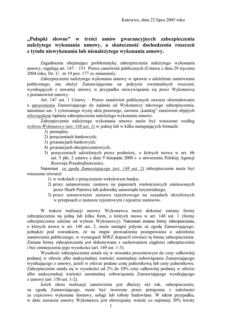 Katowice, dnia 22 lipca 2005 roku „Pułapki słowne” w treści umów gwarancyjnych zabezpieczenia należytego wykonania umowy, a skuteczność dochodzenia roszczeń z tytułu niewykonania lub nienależytego wykonania umowy. Zagadnienia obejmujące problematykę zabezpieczenia należytego wykonania umowy, regulują art. 147 – 151 Prawa zamówień publicznych (Ustawa z dnia 29 stycznia 2004 roku, Dz. U. nr 19 poz. 177 ze zmianami), Zabezpieczenie należytego wykonania umowy w sprawie o udzielenie zamówienia publicznego, ma służyć Zamawiającemu na pokrycie ewentualnych roszczeń, wynikających z zawartej umowy w przypadku niewywiązania się przez Wykonawcę z postanowień umowy. Art. 147 ust. 1 Ustawy – Prawo zamówień publicznych zawiera sformułowanie o uprawnieniu Zamawiającego do żądania od Wykonawcy takowego zabezpieczenia, natomiast ust. 3 cytowanego wyżej aktu prawnego, zawiera „katalog” zamówień objętych obowiązkiem żądania zabezpieczenia należytego wykonania umowy. Zabezpieczenie należytego wykonania umowy może być wnoszone według wyboru Wykonawcy (art. 148 ust. 1) w jednej lub w kilku następujących formach: 1) pieniądzu; 2) poręczeniach bankowych; 3) gwarancjach bankowych; 4) gwarancjach ubezpieczeniowych; 5) poręczeniach udzielanych przez podmioty, o których mowa w art. 6b ust. 5 pkt. 2 ustawy z dnia 9 listopada 2000 r. o utworzeniu Polskiej Agencji Rozwoju Przedsiębiorczości. Natomiast za zgodą Zamawiającego (art. 148 ust. 2) zabezpieczenie może być wnoszone również: 1) w wekslach z poręczeniem wekslowym banku; 2) przez ustanowienie zastawu na papierach wartościowych emitowanych przez Skarb Państwa lub jednostkę samorządu terytorialnego; 3) przez ustanowienie zastawu rejestrowego na zasadach określonych w przepisach o zastawie rejestrowym i rejestrze zastawów. W trakcie realizacji umowy Wykonawca może dokonać zmiany formy zabezpieczenia na jedną lub kilka form, o których mowa w art. 148 ust. 1 (formy zabezpieczenia zależne od wyboru Wykonawcy). Natomiast zmiana formy zabezpieczenia, o których mowa w art. 148 ust. 2, może nastąpić jedynie za zgodą Zamawiającego, jednakże pod warunkiem, że na etapie prowadzenia postępowania o udzielenie zamówienia publicznego, w wymogach SIWZ dopuścił również tą formę zabezpieczenia. Zmiana formy zabezpieczenia jest dokonywana z zachowaniem ciągłości zabezpieczenia i bez zmniejszenia jego wysokości (art. 149 ust. 1-3). Wysokość zabezpieczenia ustala się w stosunku procentowym do ceny całkowitej podanej w ofercie albo maksymalnej wartości nominalnej zobowiązania Zamawiającego wynikającego z umowy, jeżeli w ofercie podano cenę jednostkową lub ceny jednostkowe. Zabezpieczenie ustala się w wysokości od 2% do 10% ceny całkowitej podanej w ofercie albo maksymalnej wartości nominalnej zobowiązania Zamawiającego wynikającego z umowy (art. 150 ust. 1-2). Jeżeli okres realizacji zamówienia jest dłuższy niż rok, zabezpieczenie, za zgodą Zamawiającego, może być tworzone przez potrącenia z należności za częściowo wykonane dostawy, usługi lub roboty budowlane. W takim przypadku, w dniu zawarcia umowy Wykonawca jest obowiązany wnieść co najmniej 30% kwoty 1 zabezpieczenia, natomiast pozostała część kwoty zabezpieczenia potrącana jest z faktur i wpłacana na rachunek bankowy. Pełna kwota zabezpieczenia musi wpłynąć na rachunek Zamawiającego najpóźniej przed upływem połowy okresu na który zawarto umowę (art. 150 ust. 3-6). Zamawiający zwraca zabezpieczenie w terminie 30 dni od dnia wykonania zamówienia i uznania przez Zamawiającego za należycie wykonane. Kwota pozostawiona na zabezpieczenie roszczeń z tytułu rękojmi za wady lub gwarancji jakości nie może przekraczać 30% wysokości zabezpieczenia. Zabezpieczenie z tytułu rękojmi lub gwarancji zwracane jest nie później niż w 15 dniu po upływie okresu rękojmi za wady lub gwarancji jakości (art. 151 ust. 1-3). Prowadząc postępowanie o udzielenie zamówienia publicznego, Zamawiający ma obowiązek przedstawić Wykonawcom - w Specyfikacji Istotnych Warunków Zamówienia - szczegółowe wymagania dotyczące zabezpieczenia należytego wykonania umowy (art. 36 ust. 1 pkt. 20). Natomiast art. 36 ust. 1 pkt. 19 nakłada na Zamawiającego obowiązek określenia formalności, które powinny zostać dopełnione przez wybranego Wykonawcę (po wyborze oferty), w celu zawarcia umowy w sprawie o udzielenie zamówienia publicznego. W tychże dwóch „rozdziałach” Specyfikacji Istotnych Warunków Zamówienia, Zamawiający winien szczegółowo określić: • termin wniesienia zabezpieczenia, • jego procentową wartość (w odniesieniu do ceny oferty lub maksymalnego zobowiązania Zamawiającego wynikającego z umowy – gdy w ofercie podano ceny jednostkowe), • dopuszczalne formy tego zabezpieczenia, • wskazanie rachunku bankowego, na który ma zostać wpłacona kwota zabezpieczenia (w przypadku formy gotówkowej zabezpieczenia), • wskazanie najistotniejszych elementów, które winny zawierać umowy poręczenia lub gwarancji, • zasady zwrotu zabezpieczenia, • procentową wartość zabezpieczenia pozostawioną na poczet ewentualnych roszczeń z tytułu rękojmi za wady lub gwarancji jakości. Przykładowy zapis rozdziału XX SIWZ (wymagania dot. zabezpieczenia należytego wykonania umowy). „1. Wybrany Wykonawca zobowiązany będzie w terminie do dnia podpisania umowy, wnieść zabezpieczenie jej należytego wykonania w wysokości ….% podanej ceny ofertowej, w jednej z form określonych w art. 148 ust. 1 Ustawy z dnia 29 stycznia 2004 roku Prawo zamówień publicznych. 2. Zamawiający nie wyraża zgody na wniesienie zabezpieczenia należytego wykonania umowy w formach określonych w art. 148 ust. 2 Ustawy z dnia 29 stycznia 2004 roku Prawo zamówień publicznych. 3. Zabezpieczenie wnoszone w postaci poręczenia lub gwarancji musi zawierać następujące elementy: 1) 