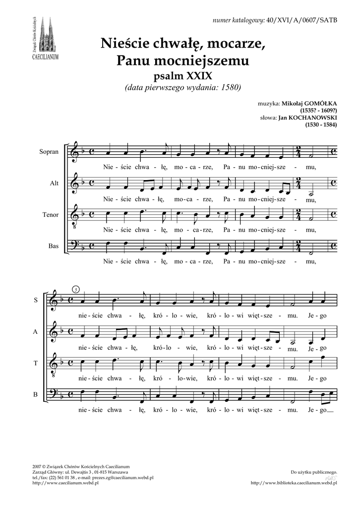 numer katalogowy: 40/XVI/A/0607/SATB Nieście chwałę, mocarze, Panu mocniejszemu psalm XXIX (data pierwszego wydania: 1580) muzyka: Mikołaj GOMÓŁKA (1535? - 1609?) słowa: Jan KOCHANOWSKI (1530 - 1584) Sopran Alt Tenor Bas &b c Nie - ście chwa - łę, mo - ca - rze, ?b c œ œ œ œ Nie - ście chwa - łę, mo - ca - rze, &b c œ œ œ. &b c œ œ œ œ œ Vb c œ œ œ. ?b c œ œ œ. nie - ście chwa B - mu, - nie - ście chwa - - j œ œ łę, œ J łę, œ - mu, Pa - nu mo - cniej- sze - mu, j œ ‰œ œ œ œ œ kró - lo - wie, 42 ˙ ˙ kró - lo - wie, œ. Je - go kró - lo - wi więt - sze - mu. œ œ Je - go œ œ œ œ ‰ œJ œ œ œ œ J kró - lo - wie, œ 2007 © Związek Chórów Kościelnych Caecilianum Zarząd Główny: ul. Dewajtis 3 , 01-815 Warszawa tel./fax: (22) 561 01 38 , e-mail: [email protected] http://www.caecilianum.webd.pl kró - lo - wi więt - sze - mu. ‰ j œ œ œ œ œ œ kró - lo - wie, ˙ ˙ kró - lo - wi więt - sze - mu. c c c c œ œ kró - lo - wi więt - sze - mu. j j j œ œ œ œ ‰œ œ œ œ œ œ ˙ j œ œ łę, Pa - nu mo - cniej- sze j ‰ j œ œ œ œ œ œ œ œ œ œ. nie - ście chwa - łę, T Pa - nu mo - cniej- sze 2 4 ˙ œ œ œ Nie - ście chwa - łę, mo - ca - rze, nie - ście chwa A j j œ œ œ œ ‰œ œ œ œ œ œ. œ 2 j œ j œ ‰ œj 4 œ œ œ œ œ œœ ˙ Nie - ście chwa - łę, mo - ca - rze, Pa - nu mo - cniej- sze - mu, . œ œ. œ œ ‰ œ œ œ 2 Vb c œ œ œ 4 œ œ ˙ J J J &b c 5 S œ Je - go œ œœ Je - go Do uŜytku publicznego. http://www.biblioteka.caecilianum.webd.pl psalm XXIX - Mikołaj GOMÓŁKA S A T B S A T B &b œ œ œ &b ze b &b œ - sze i - mię wy œ - zna œ œ œ na - święt - sze i - mię wy - zna - waj - cie, ze na - święt wszech wszech wszech œ œ œ œ œ Je - mu w ko - ście œ œ œ œ Je - mu w ko - ście œ œ œ Je - mu w ko - ście - - sze œ œ œ świę - tym Je œ œ. - le œ świę - tym - le świę - tym Je - œ. œ le œ œ i - mię œ œœ œ œ le œ œ œ œ œ - œ œ œ œ œ wy ˙ na - święt œ œ œ i - mię œ œ œ œ œ œ œ Je - mu w ko - ście œ œ œ œ b V ?b œ œ œ œ œ &b œ na - święt œ sze ze wszech œ n œ - œ ze œ Vb ? œ 10 wy - - zna - waj - cie, œ. œ - œ œ j œ ˙ waj-cie, ˙ ˙ œ zna - waj - cie, œ œ œ œ 15 U w U go sie kła - niaj - cie. Je - go sie kła - niaj - cie. - go sie kła - niaj - cie. - œ œ œ œ - w j œ œ œ œ œ œ œ œ J œ świę - tym Je œ œ œ œ go sie kła - niaj w U w U cie. PSALM XXIX Adferte Domino, filii Dei 1. Nieście chwałę, mocarze, Panu mocniejszemu, Nieście chwałę, królowie, Królowi więtszemu; Jego ze wszech naświętsze imię wyznawajcie, Jemu w kościele świętym Jego się kłaniajcie! 4. Na głos Pański z obłoków ognie wyskakują, Pustynie drŜą arabskie, łanie dzieci trują, Lasy padną; wielmoŜność Jego znaczna wszędzie I, dokąd świata, zawŜdy wyznawana będzie. 2. Głos Pański deszcze leje, głos Pański grom srogi 5. I okrutne pobudza na powietrzu trwogi; Pan na swym tronie siedział, gdy potop świat psował, Pan na morzu podnosi straszne nawałności, Pan na swym tronie będzie na wieki królował. Głos Pański wielkiej władze i wielkiej moŜności. TenŜe serce i siłę ludu swemu daje I ziemi błogosławi na jej urodzaje. 3. Głos Pański cedry łamie i dęby przewraca A wielkimi górami tak snadnie obraca, Jako więc to tam, to sam jednoroŜcowymi Wesoła młodość miece cielęty pustymi. -2- http://www.biblioteka.caecilianum.webd.pl